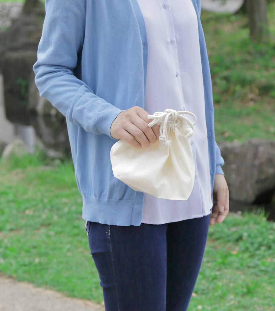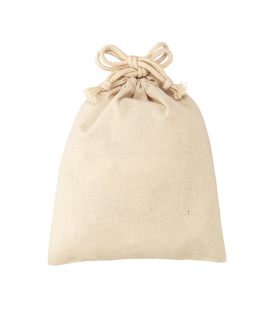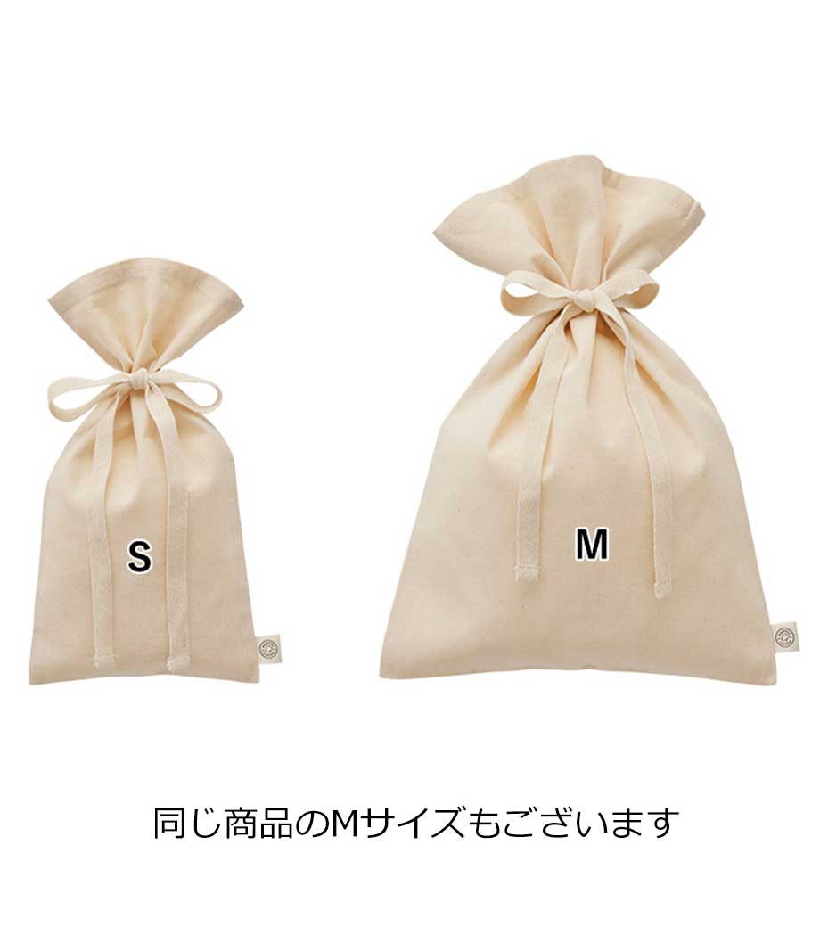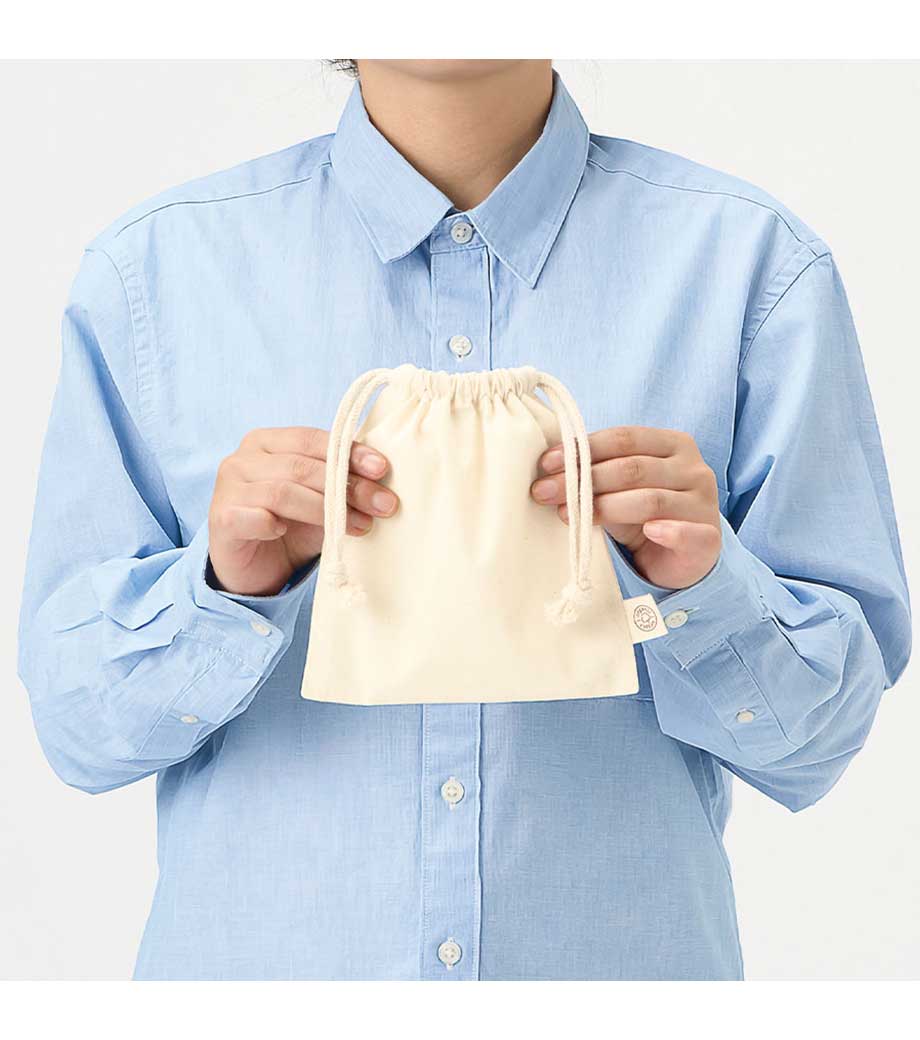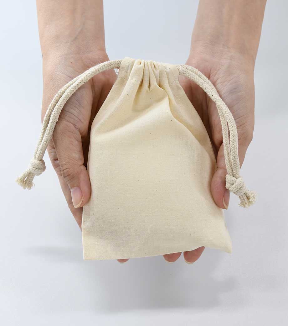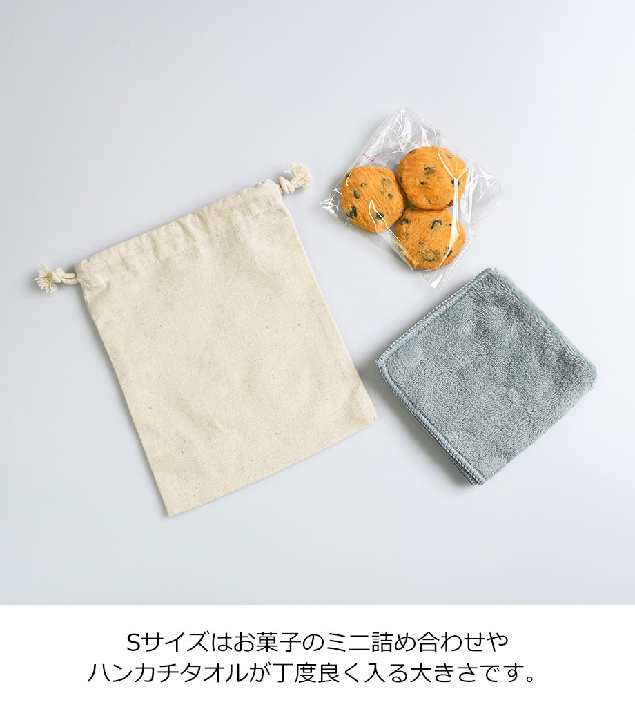 「コットン巾着(Sサイズ)」は自然な風合いが魅力のミニサイズの巾着です。歯ブラシやミニサイズ化粧品などがすっぽり収まる大きさで、レジャーや旅行に行くときにとっても便利。お菓子や小さなプレゼントをいれて、パッケージ用にも使えます。無漂白コットン地なので、汚れてしまっても洗濯機で洗えるので、衛生的です。