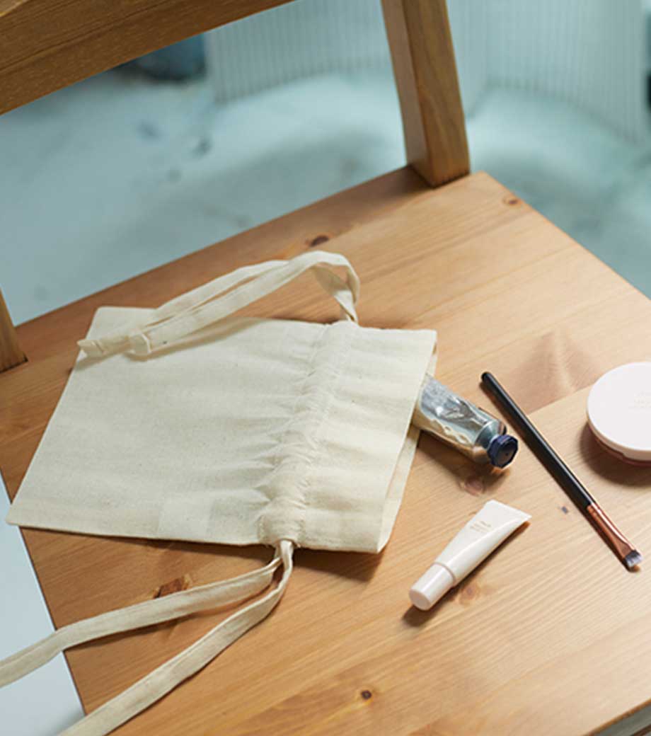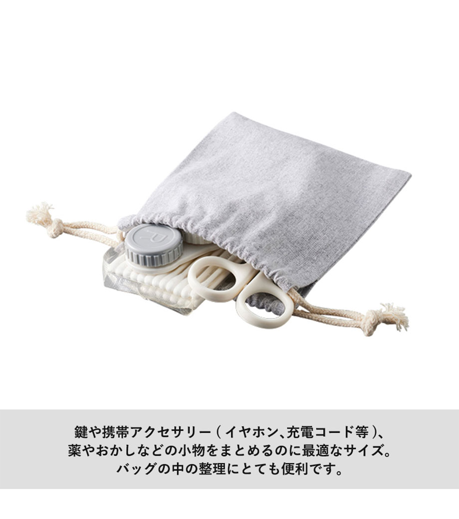 シンプルで使いやすい定番の巾着。ガジェットやコスメなどの小物を収納するのにぴったりなサイズ感です。コットン素材ならではの柔らかさとナチュラルな風合いが魅力で、日常使いから旅行時の仕分けまで幅広く活躍します。持ち運びやすく軽量でかさばらないため、バッグの中の小物整理に便利です。