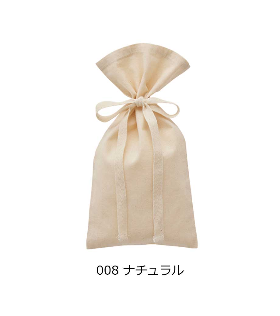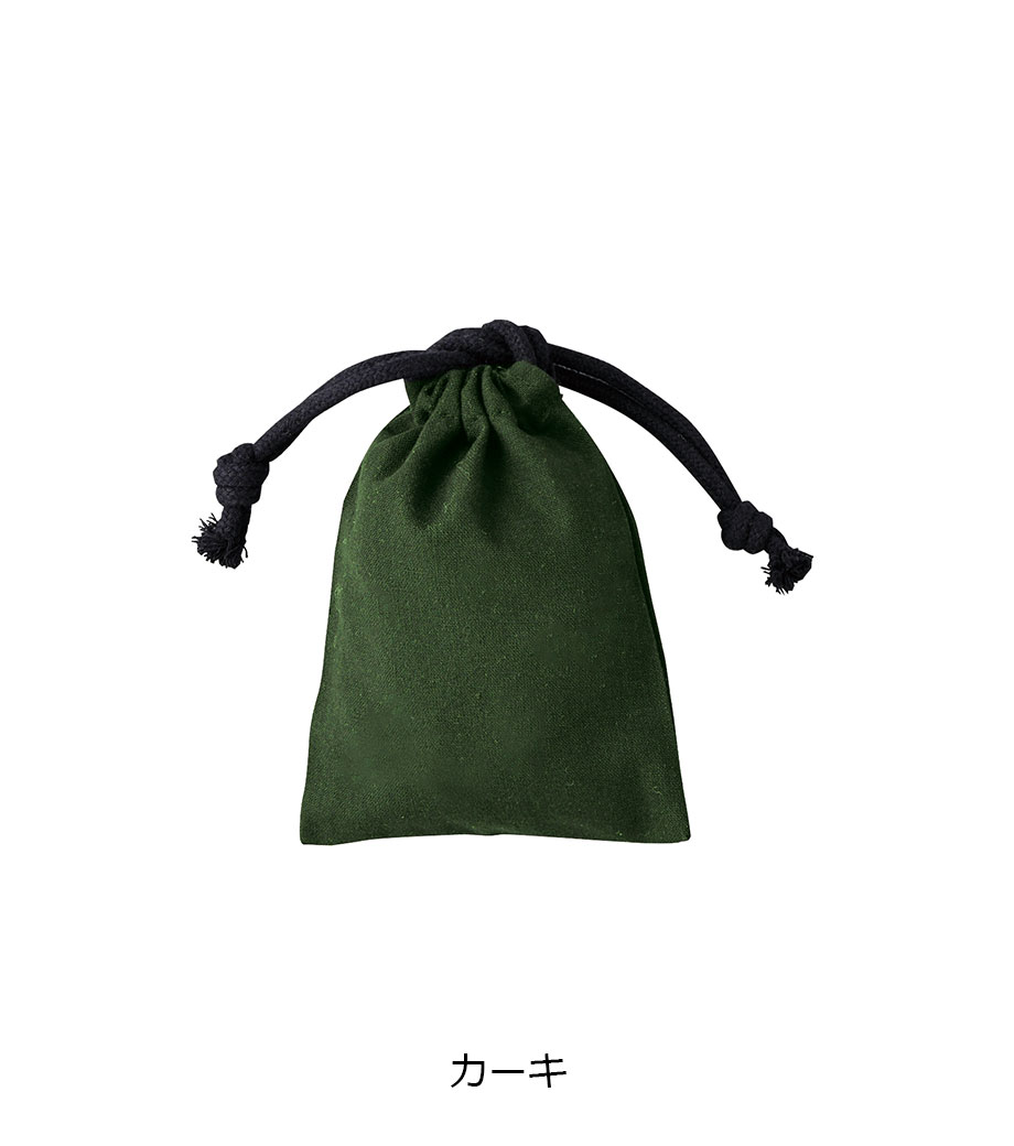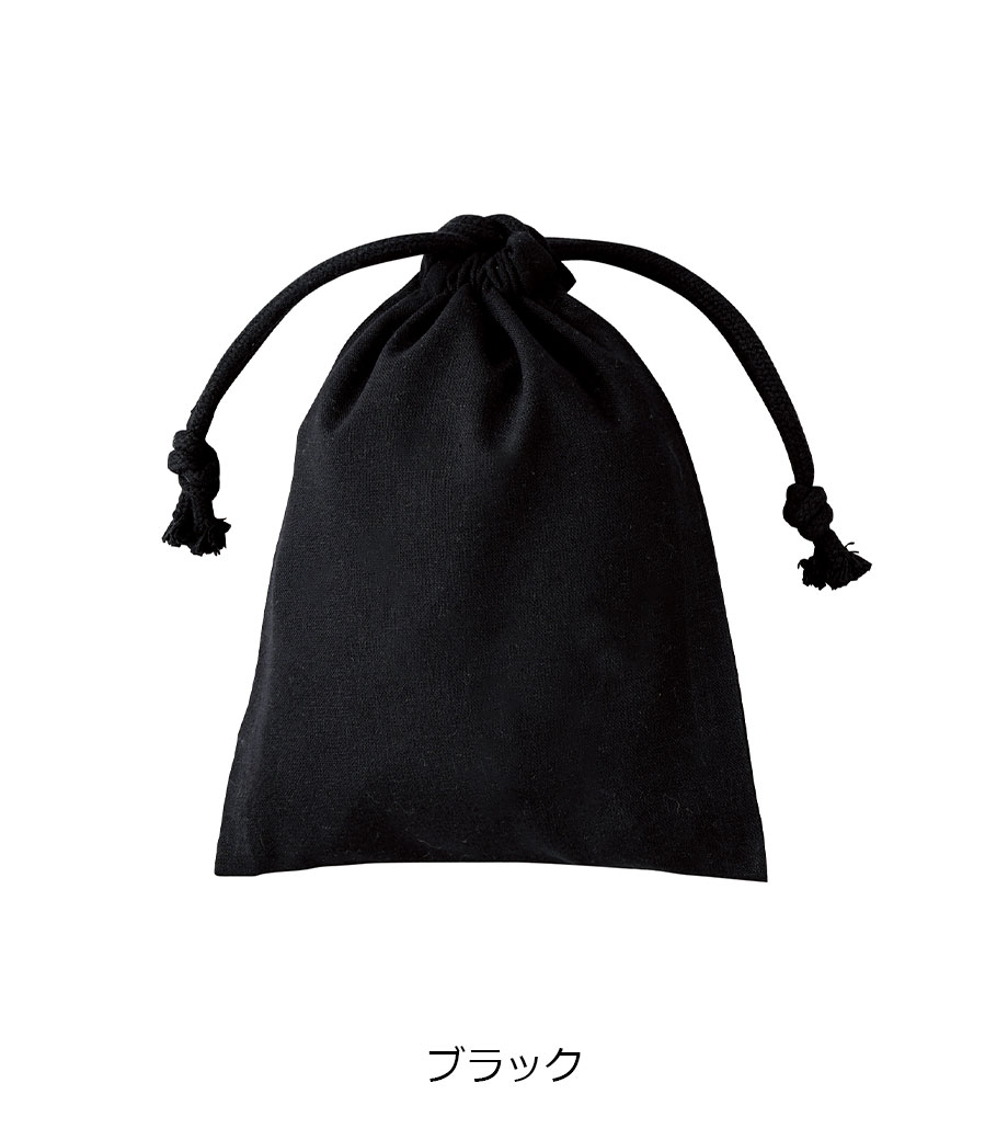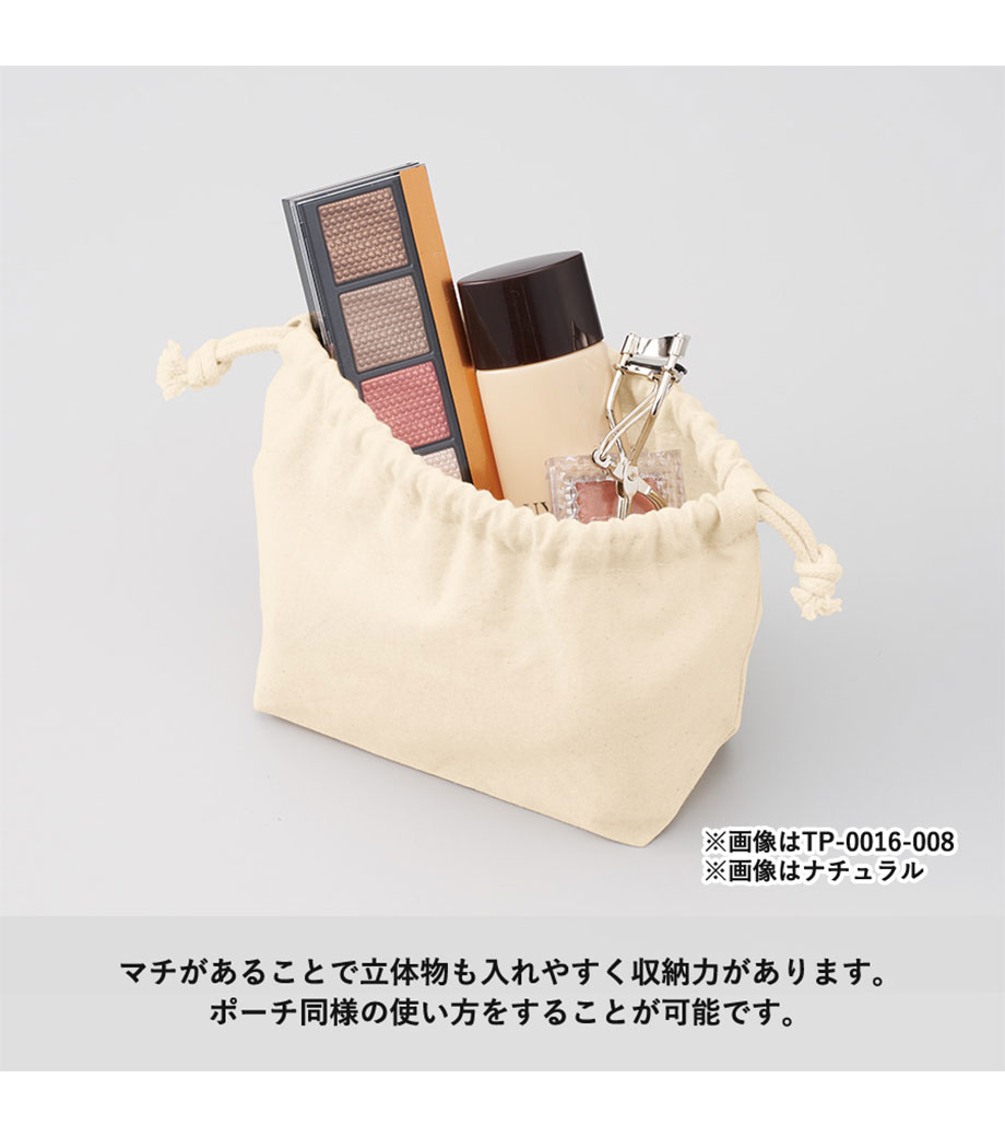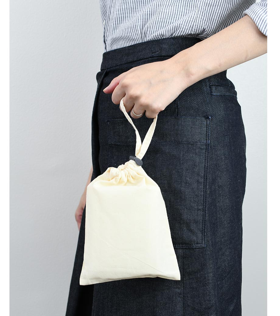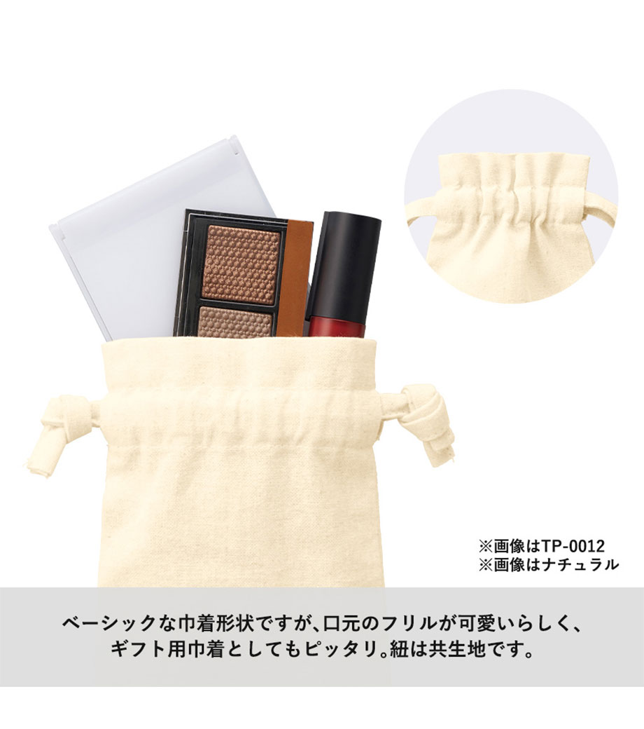 ベーシックで使いやすい5オンスの厚手コットン巾着。マチなしでリップや目薬など小物収納にぴったりです。紐部分は共生地を使用。安価でも高級感のある印象です。