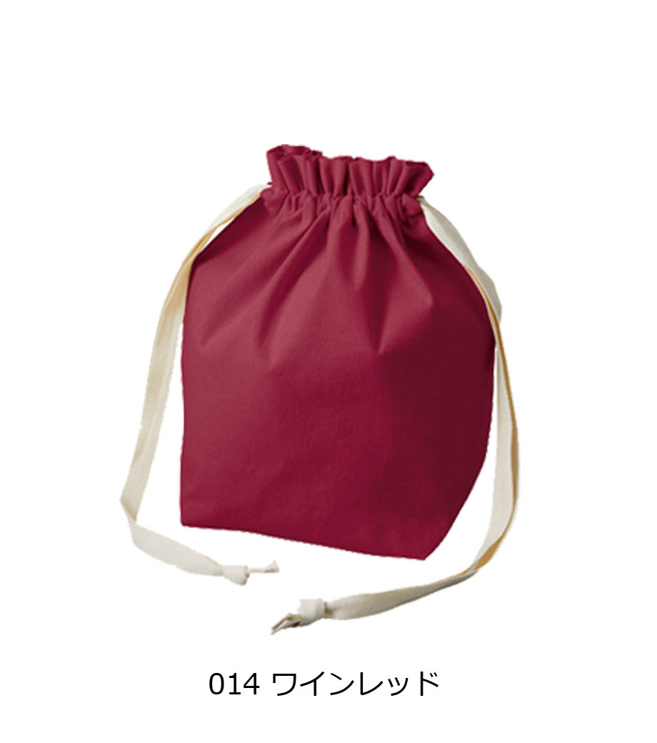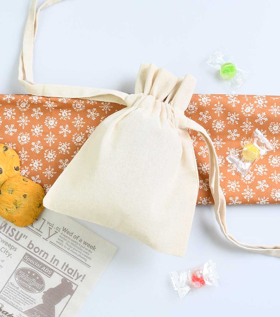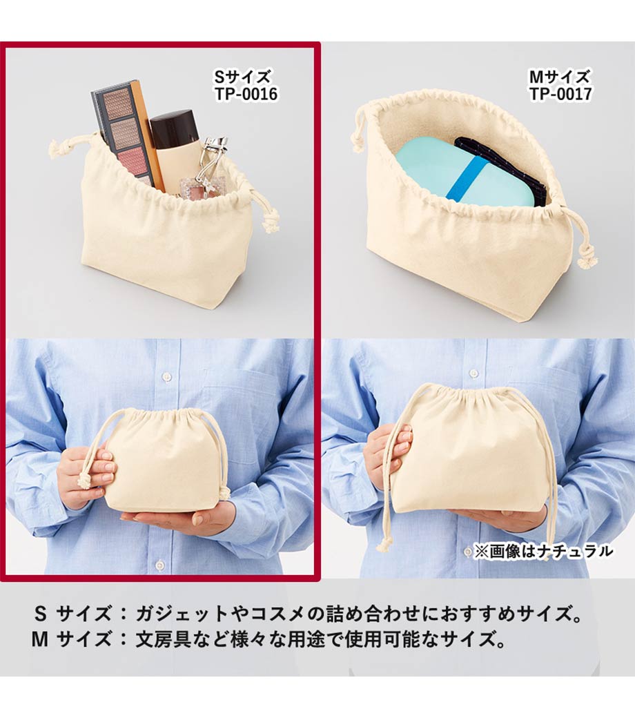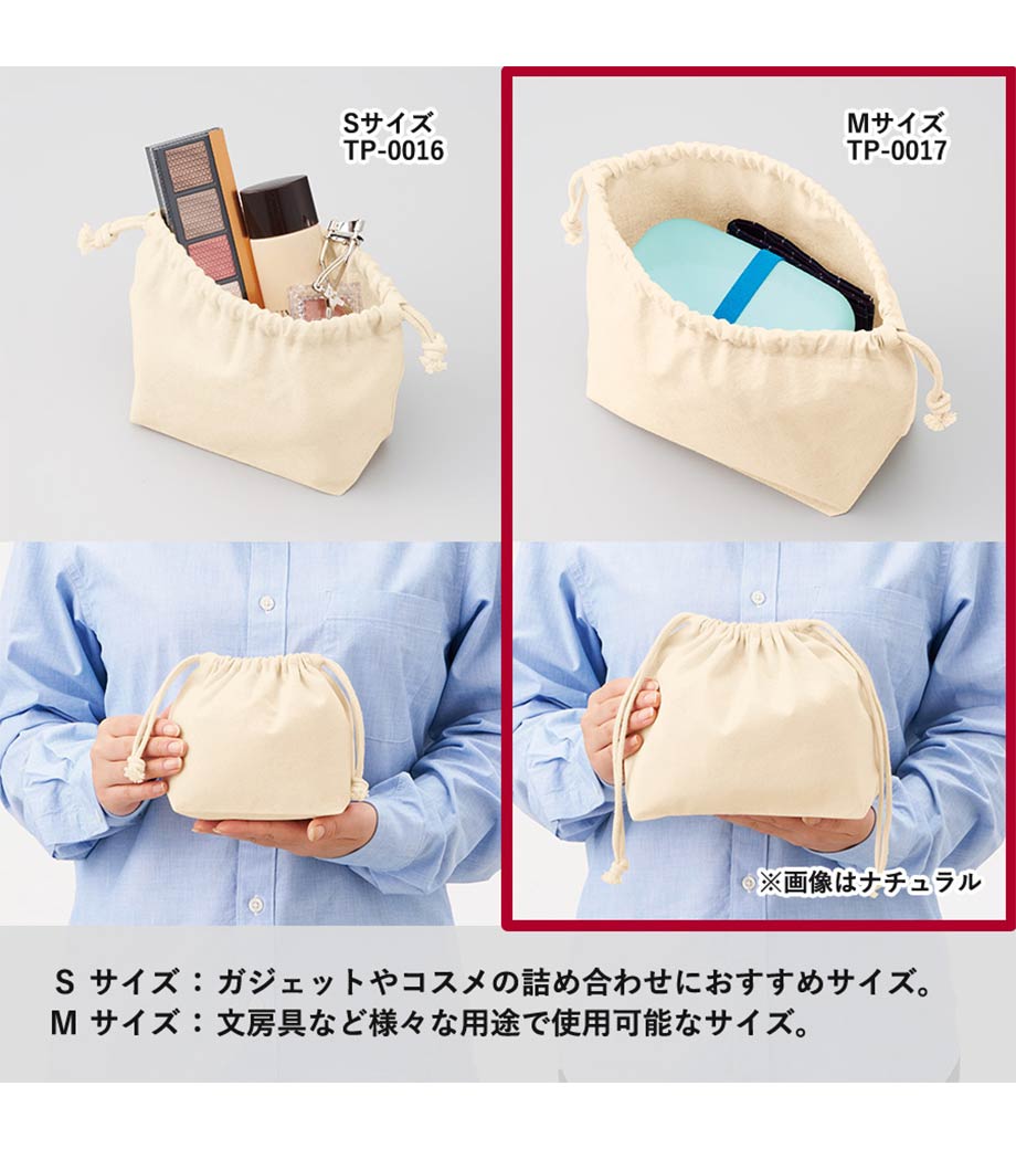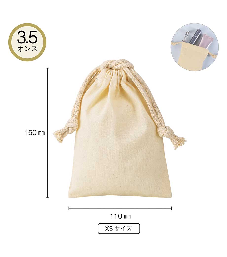 ベーシックで使いやすい5オンスの厚手コットン巾着。マチなしでリップや目薬など小物収納にぴったりです。紐部分は共生地を使用。安価でも高級感のある印象です。