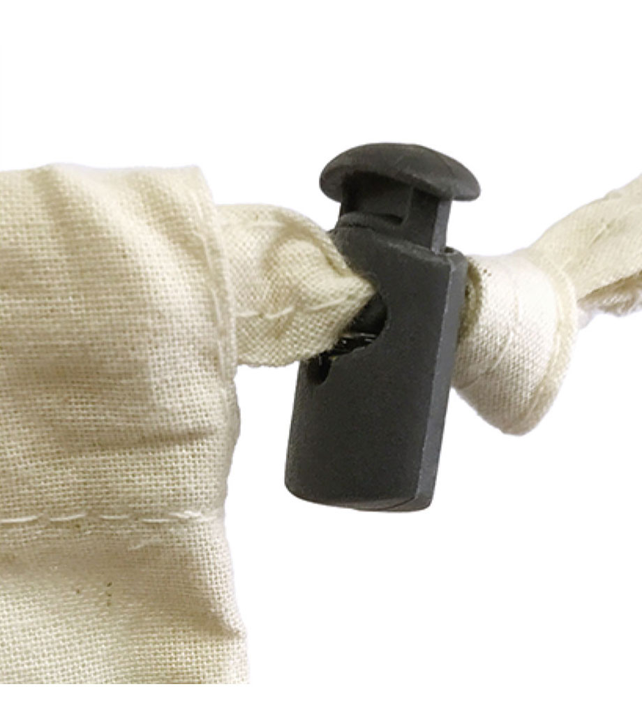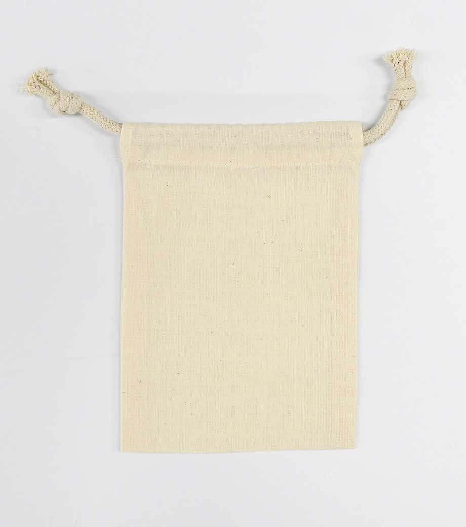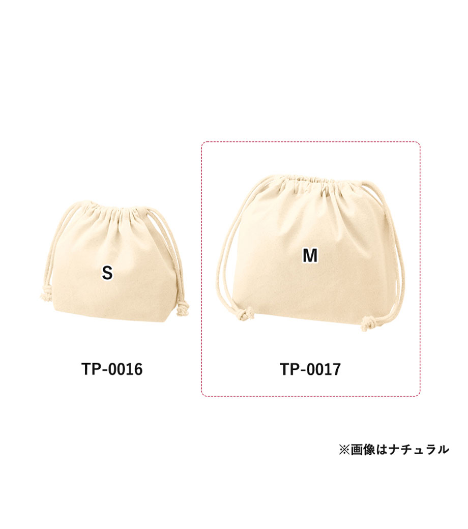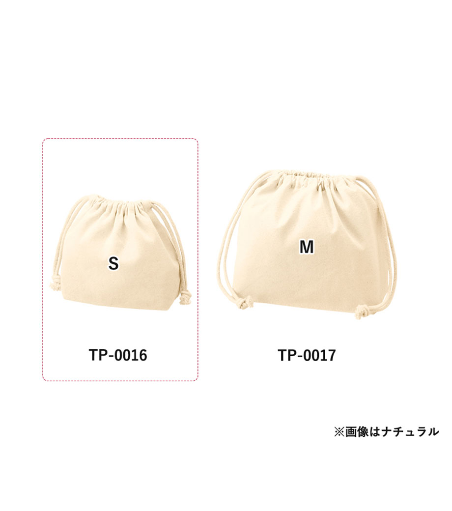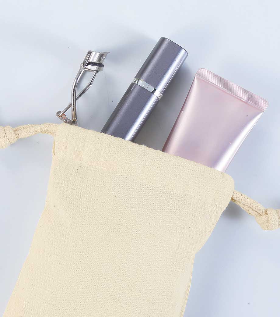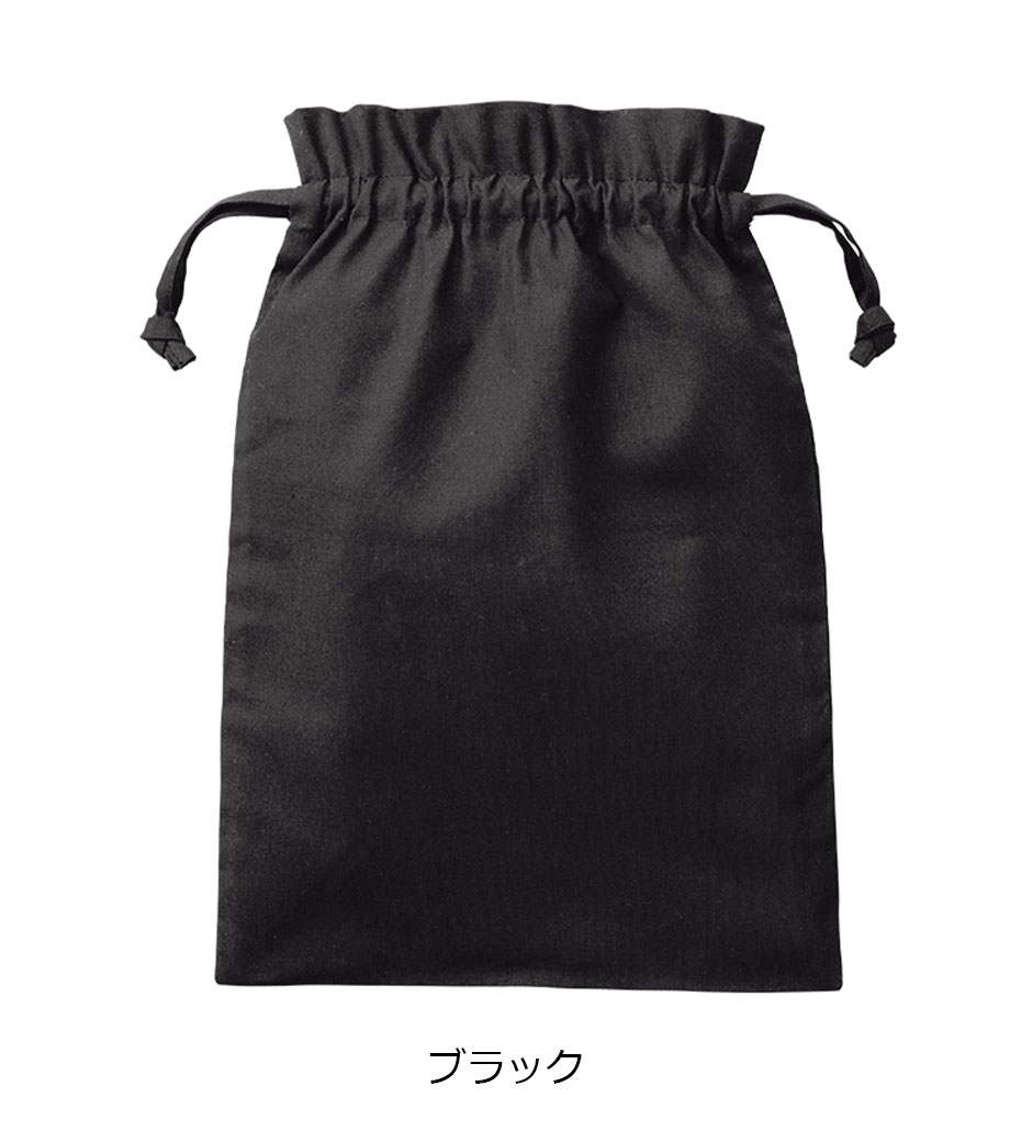 ベーシックで使いやすい5オンスの厚手コットン巾着。マチなしでリップや目薬など小物収納にぴったりです。紐部分は共生地を使用。安価でも高級感のある印象です。