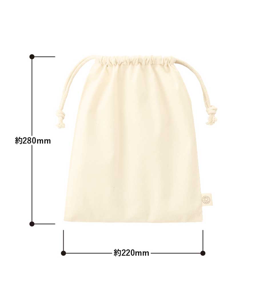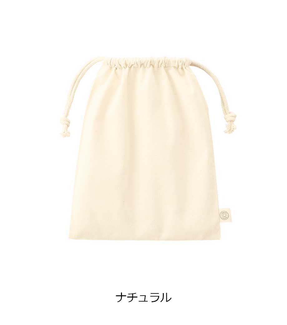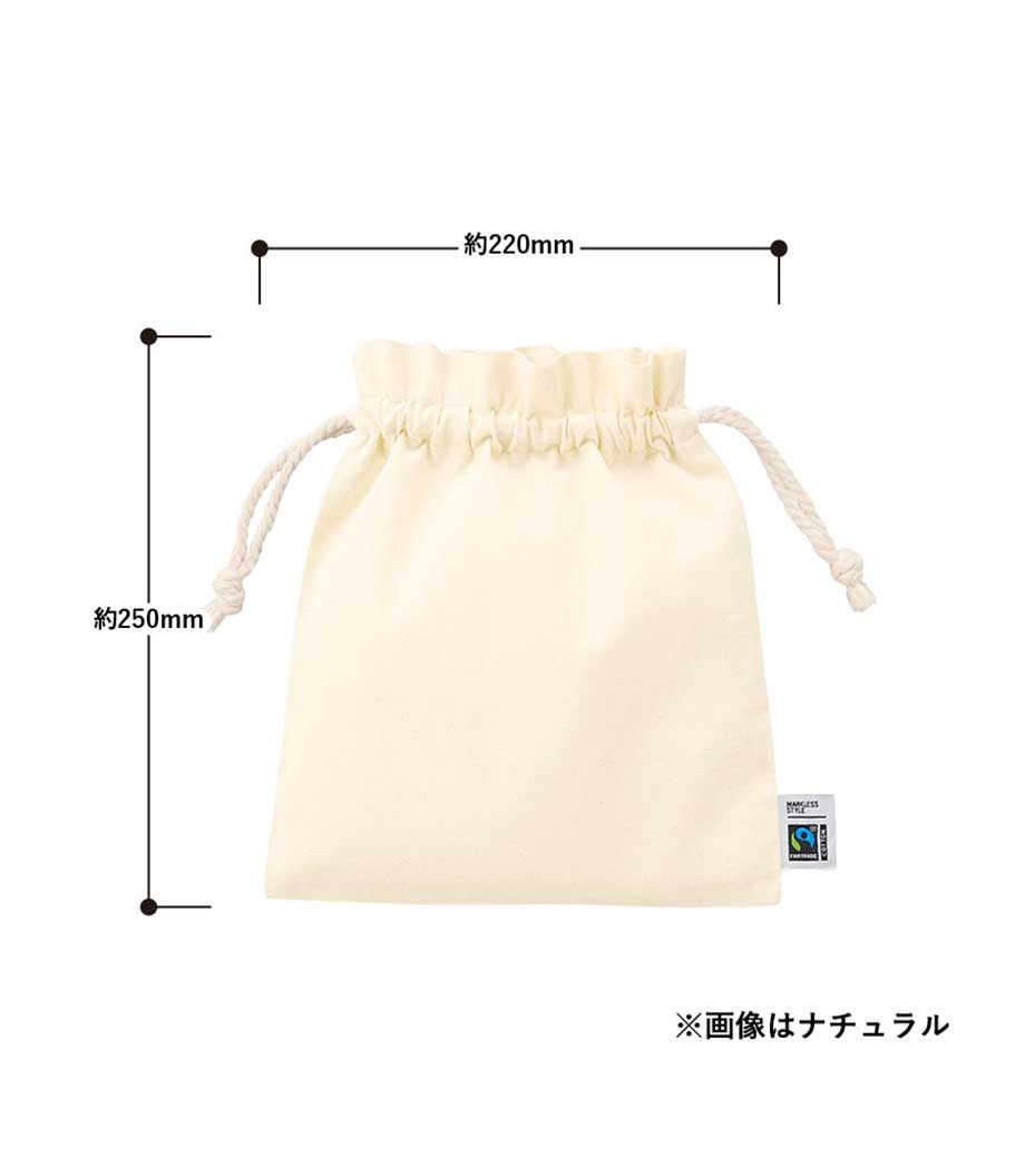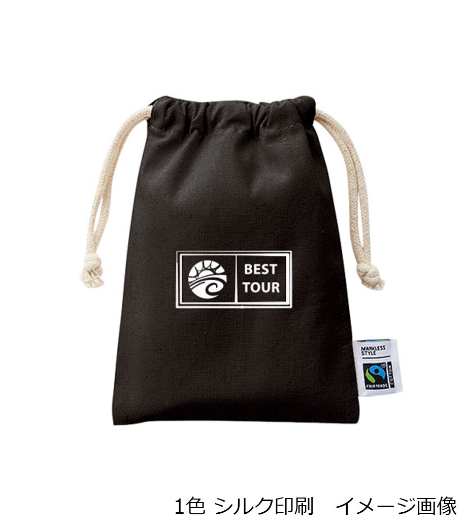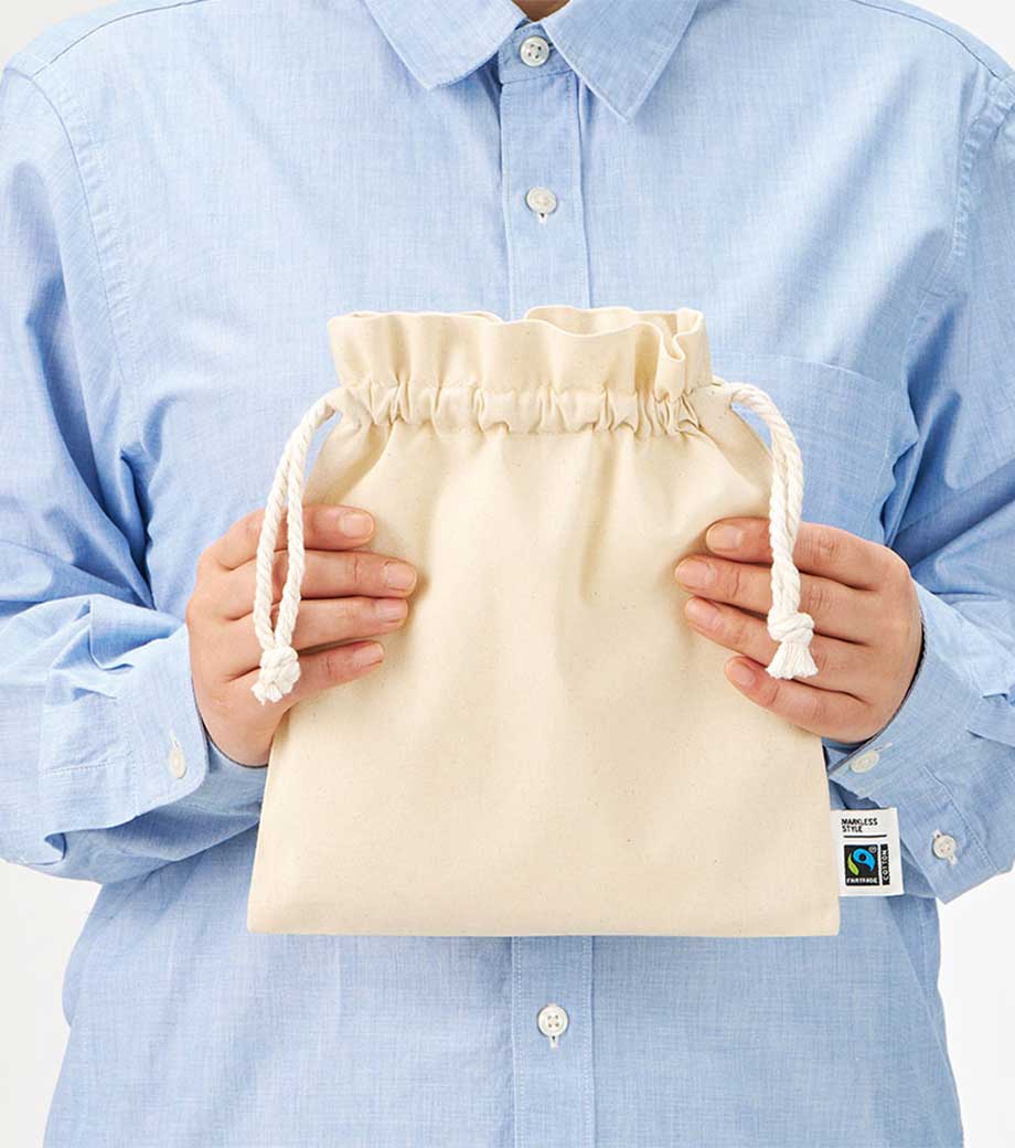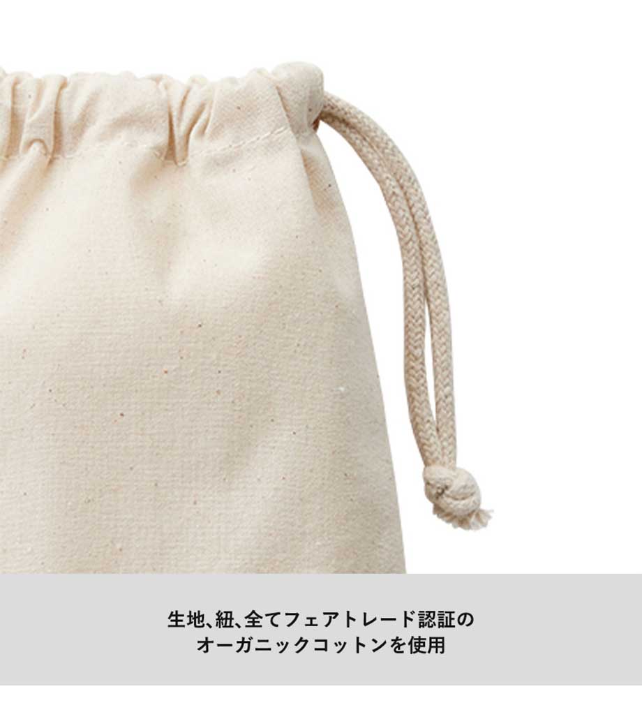 名入れ印刷が可能。ロゴやイベント名を印刷してオリジナル巾着が作れます。フェアトレード商品で持続可能な発展を支え、温かみあふれるオーガニックコットン。SDGsに取り組む企業のノベルティとしておすすめです。