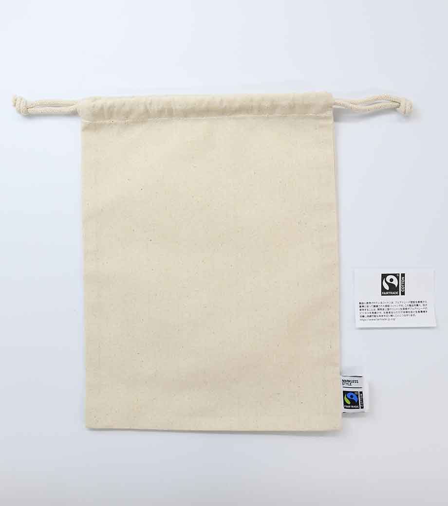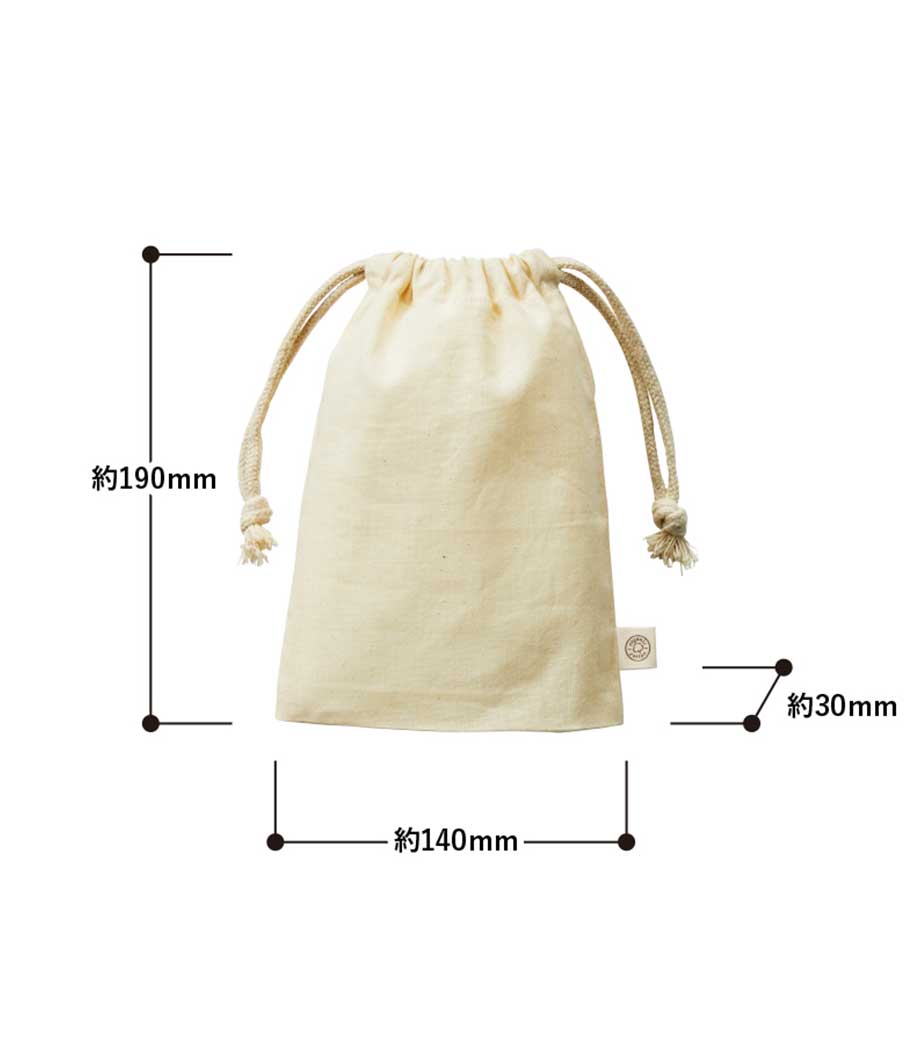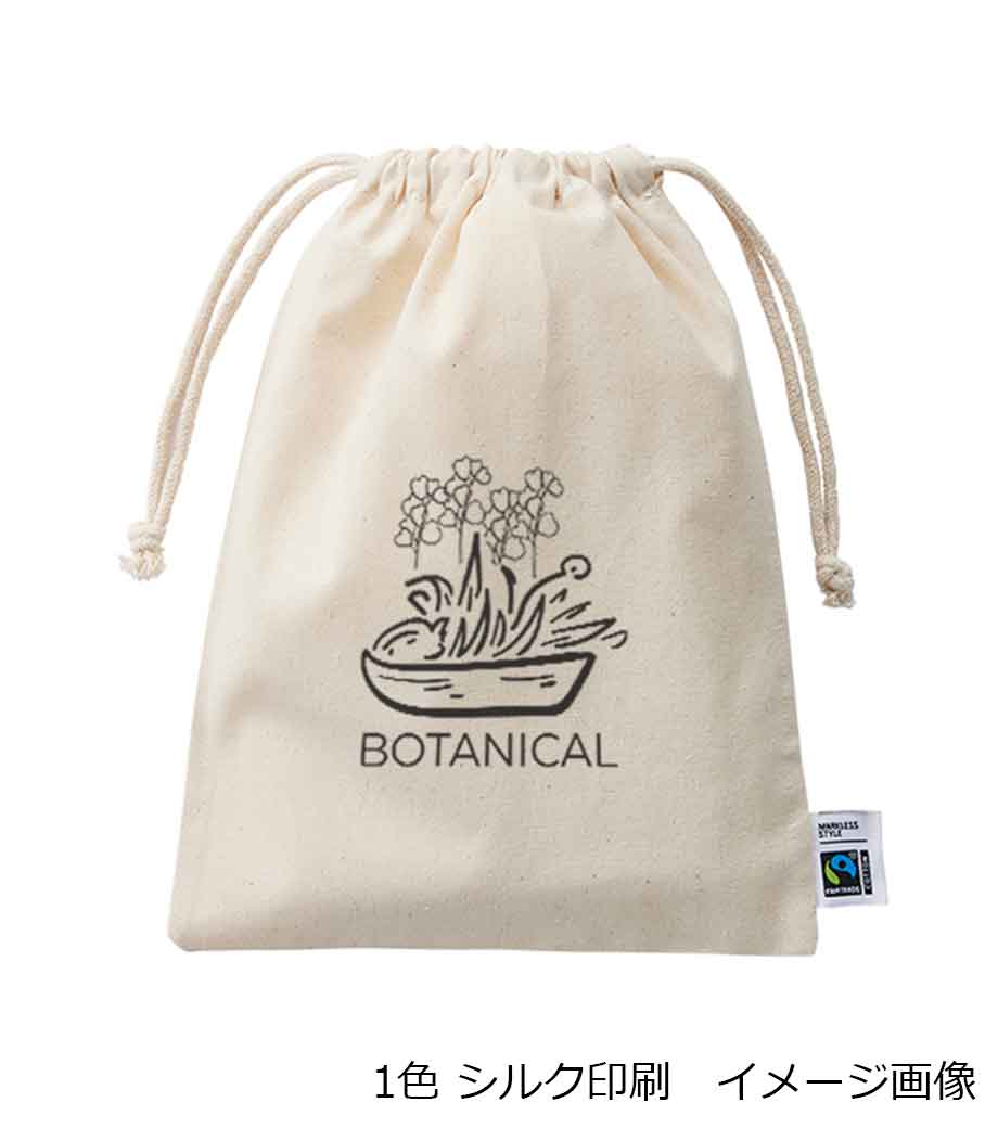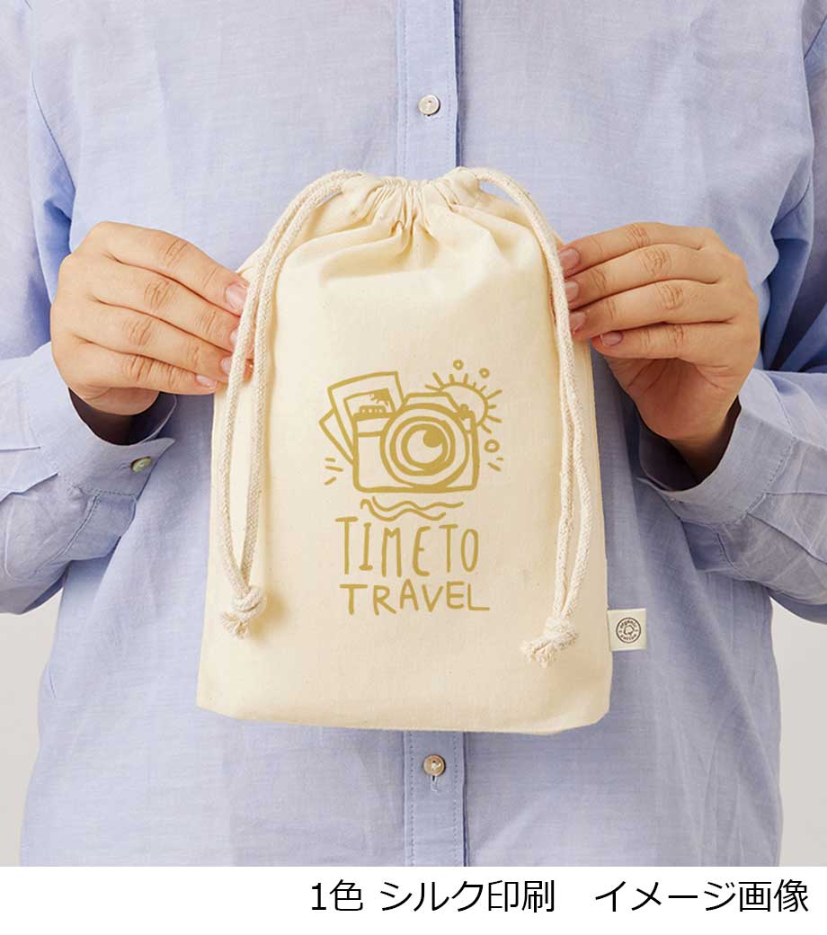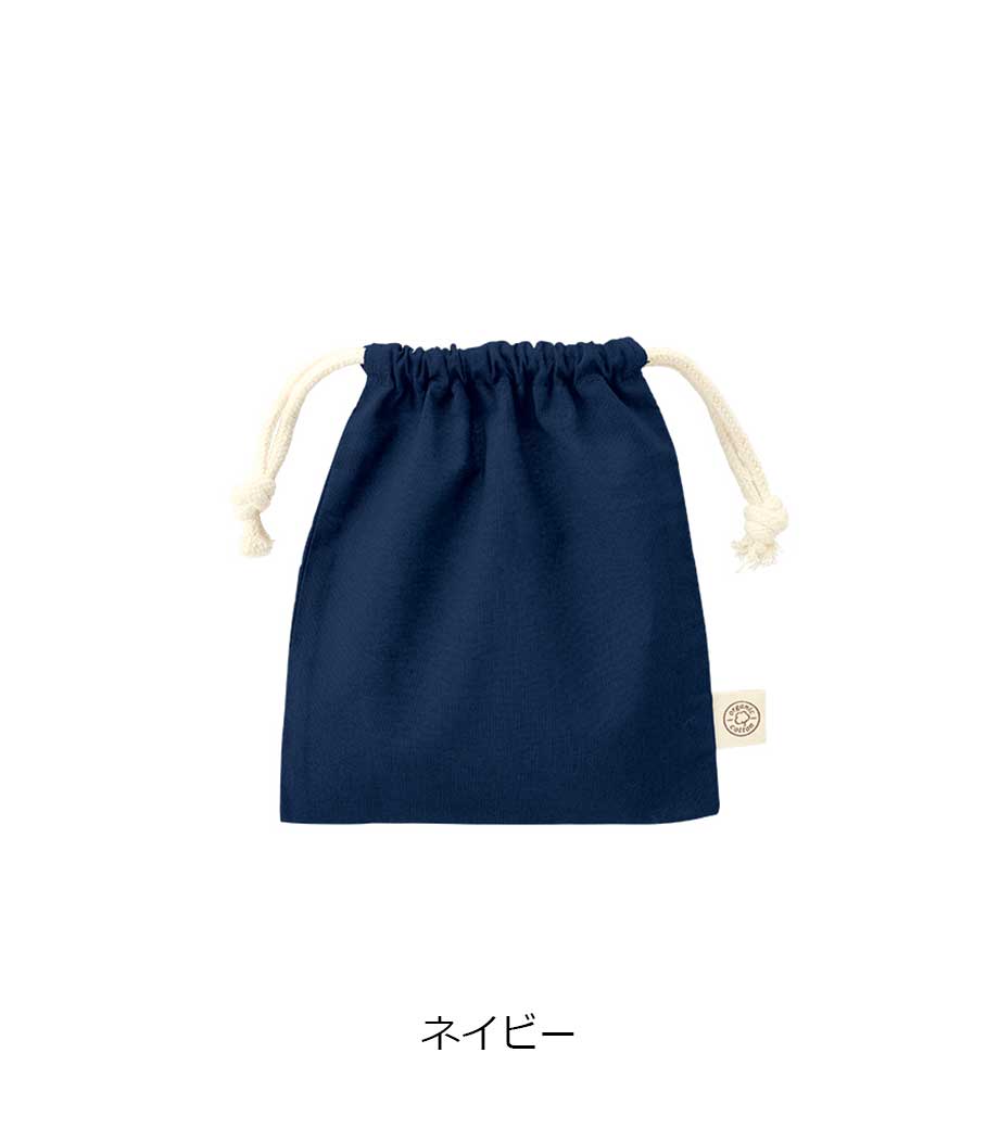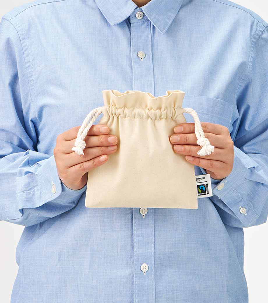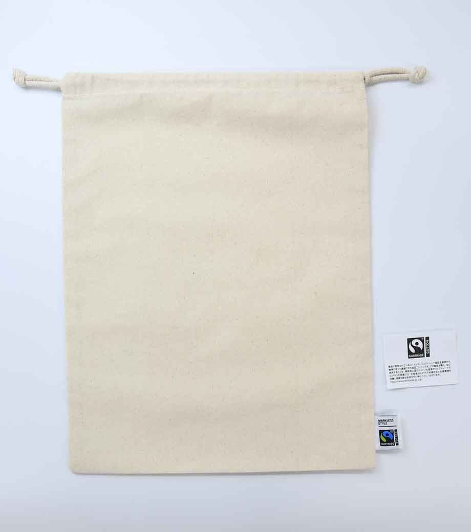名入れ印刷が可能。ロゴやイベント名を印刷してオリジナル巾着が作れます。フェアトレード商品で持続可能な発展を支え、温かみあふれるオーガニックコットン。SDGsに取り組む企業のノベルティとしておすすめです。