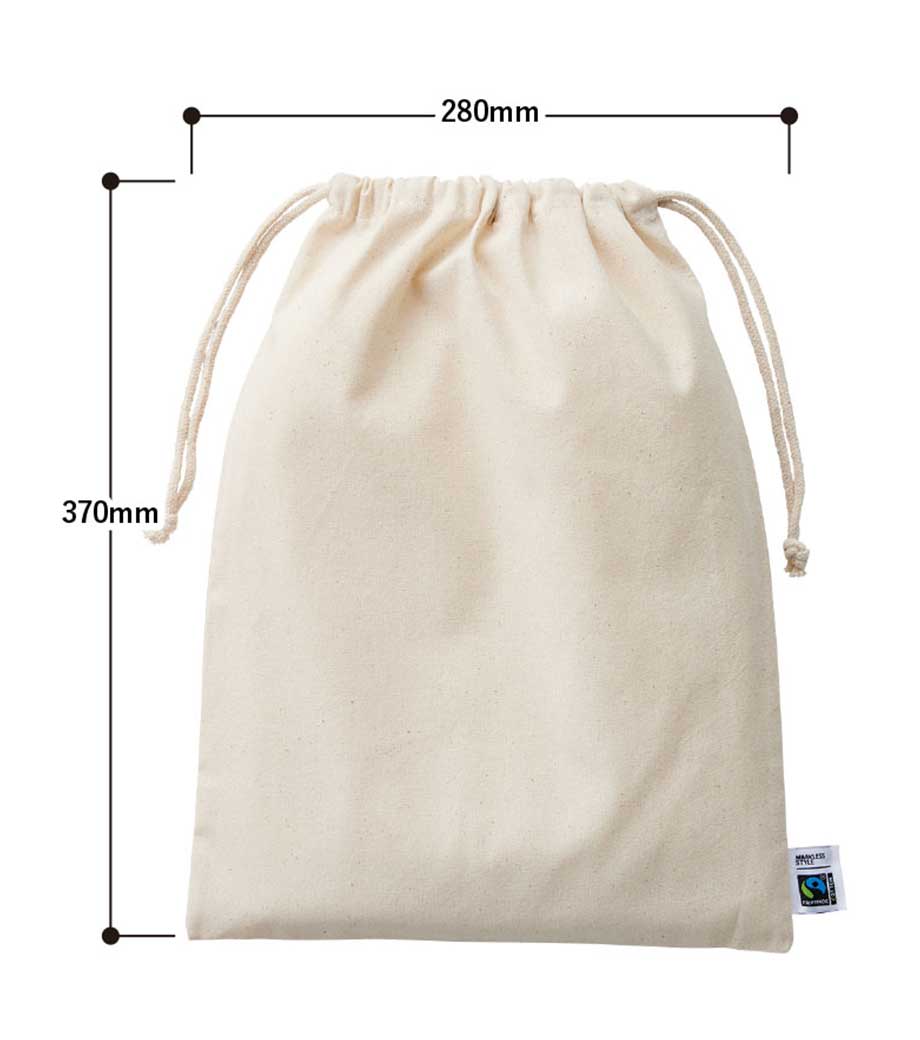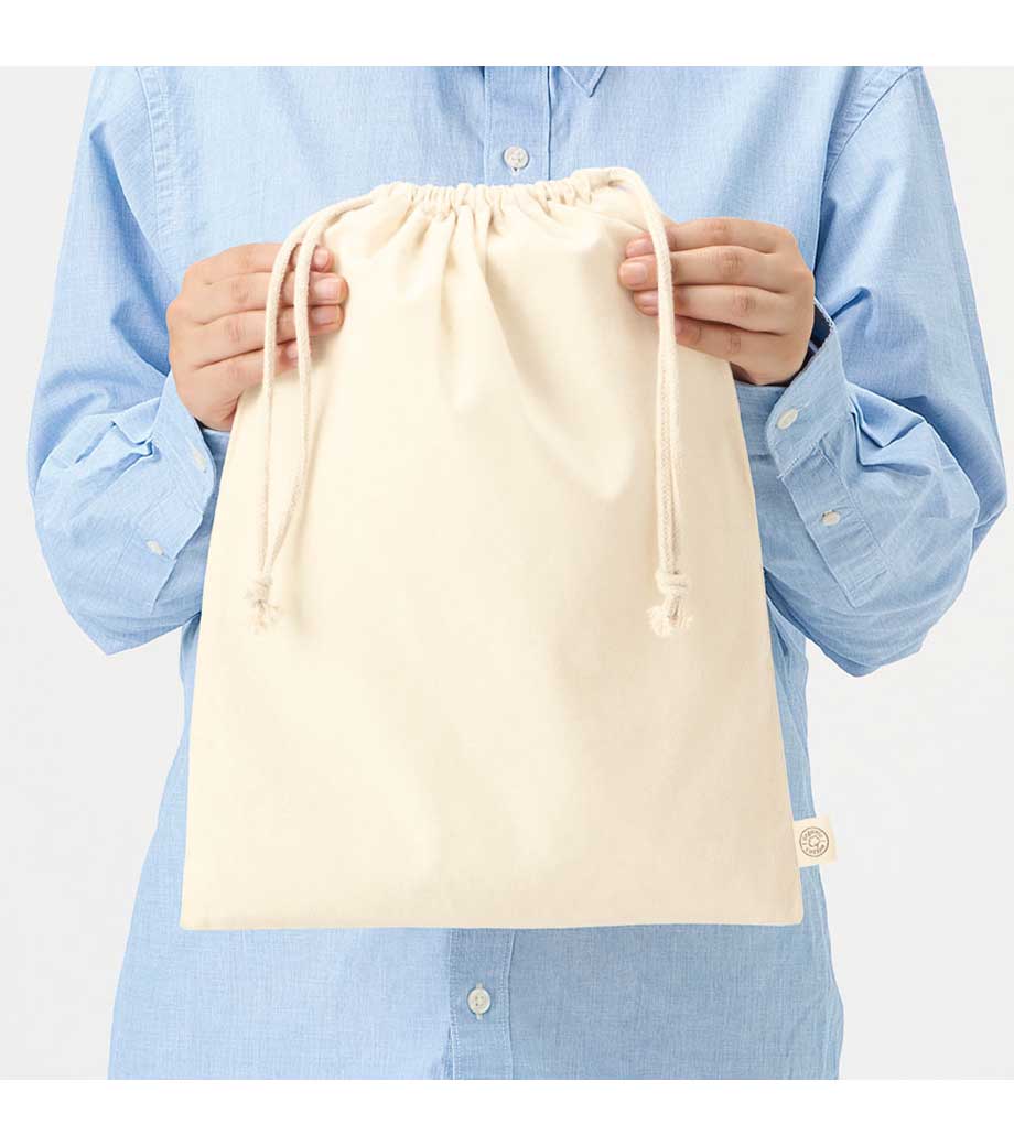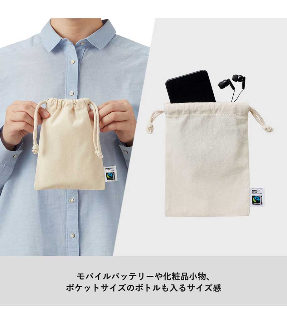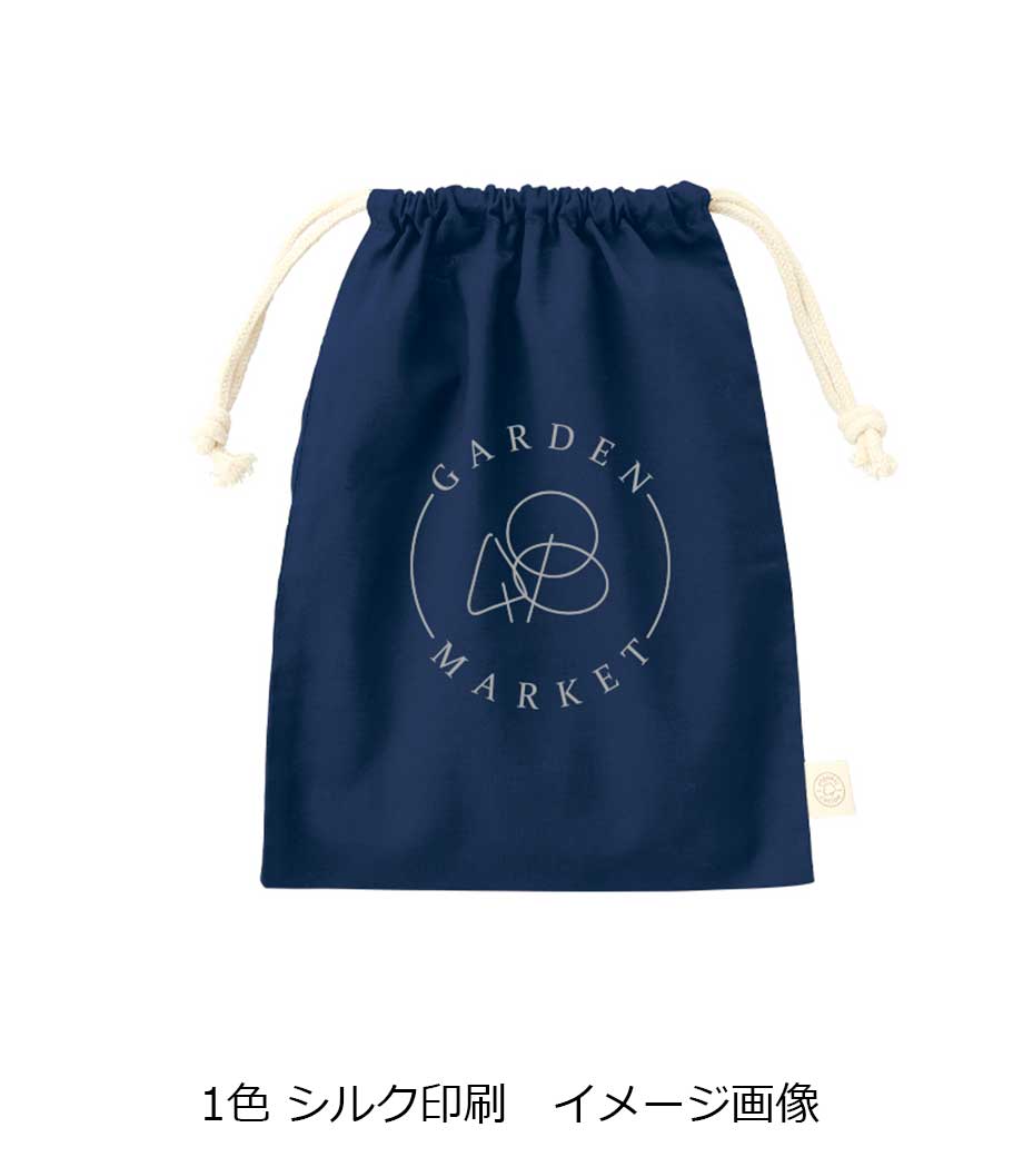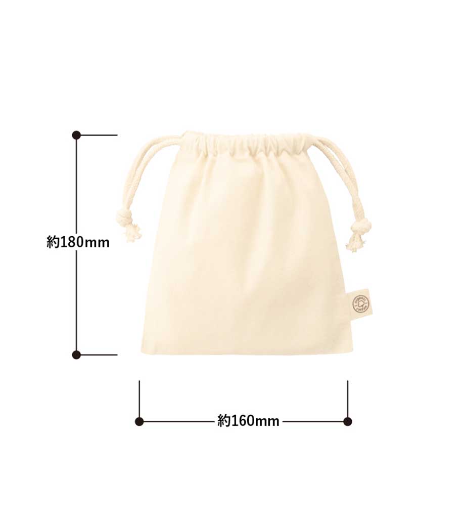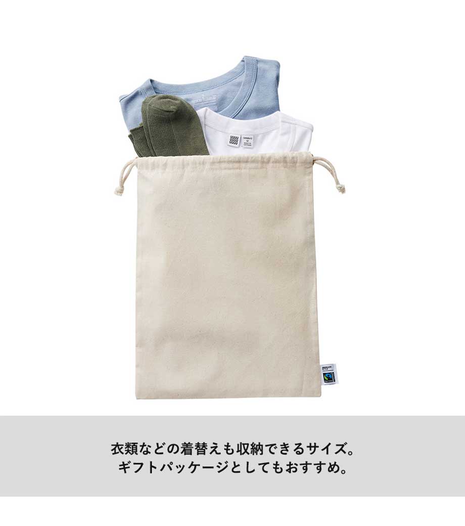 名入れ印刷が可能。ロゴやイベント名を印刷してオリジナル巾着が作れます。フェアトレード商品で持続可能な発展を支え、温かみあふれるオーガニックコットン。SDGsに取り組む企業のノベルティとしておすすめです。