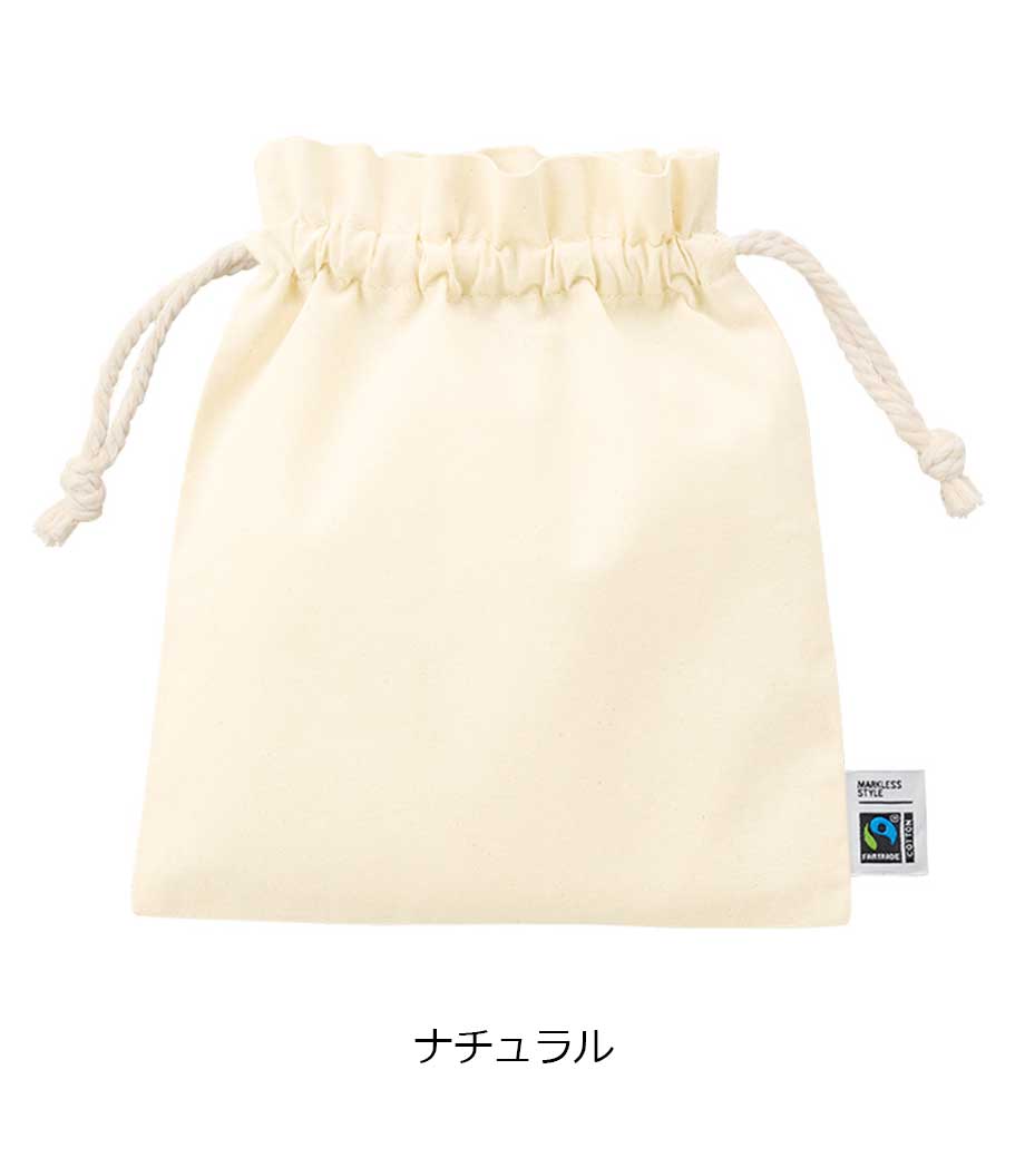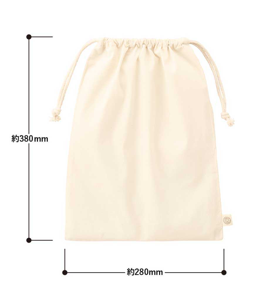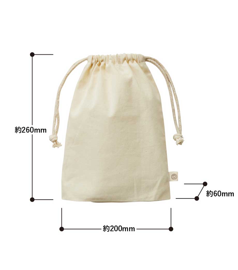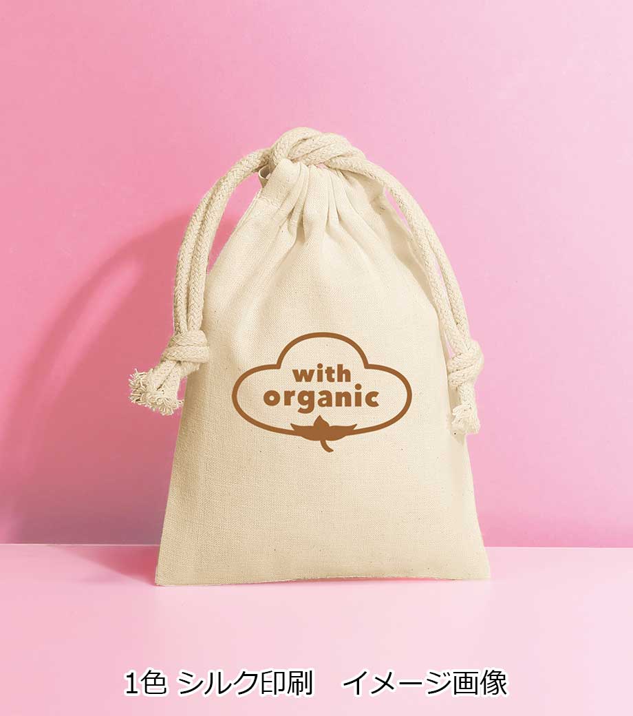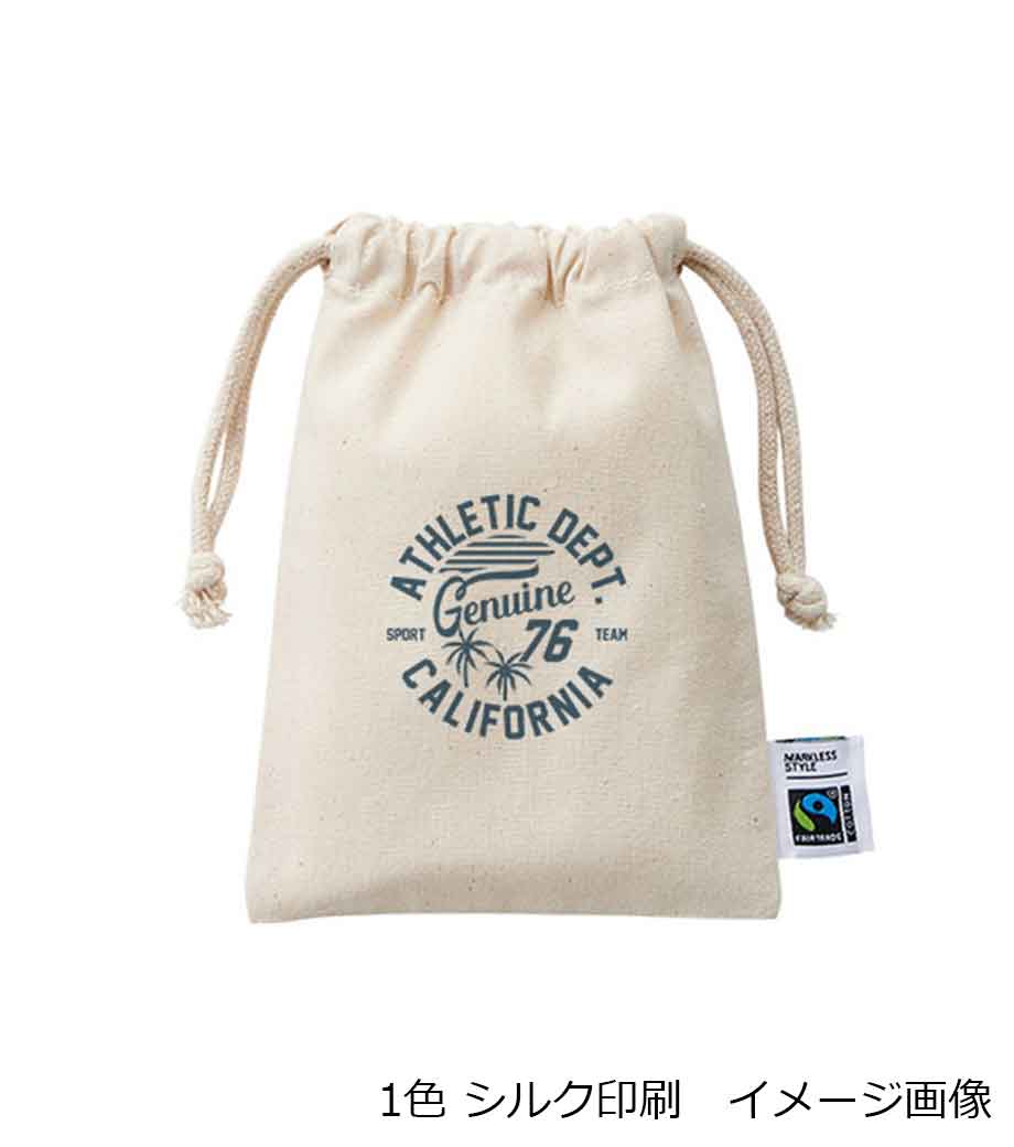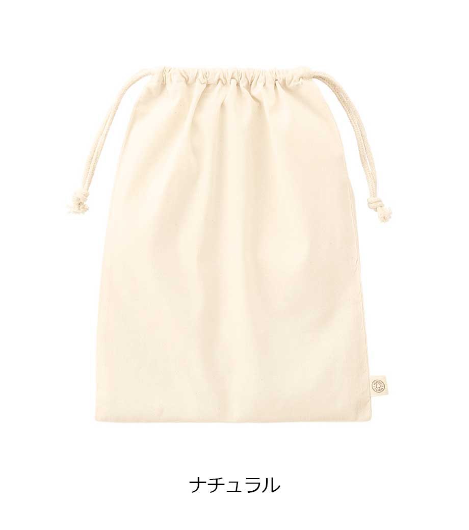 名入れ印刷が可能。ロゴやイベント名を印刷してオリジナル巾着が作れます。フェアトレード商品で持続可能な発展を支え、温かみあふれるオーガニックコットン。SDGsに取り組む企業のノベルティとしておすすめです。