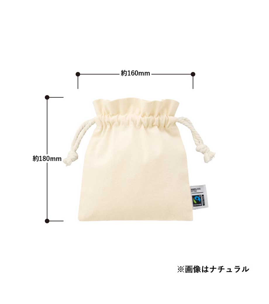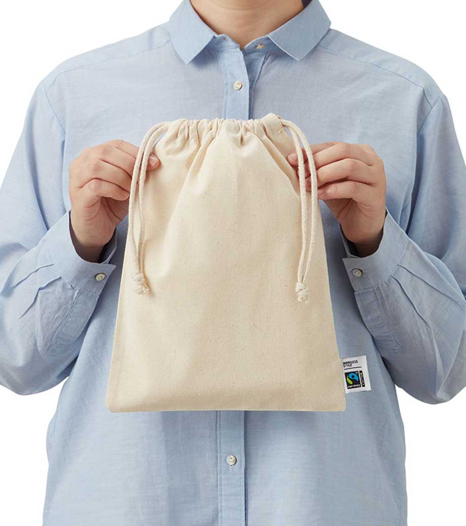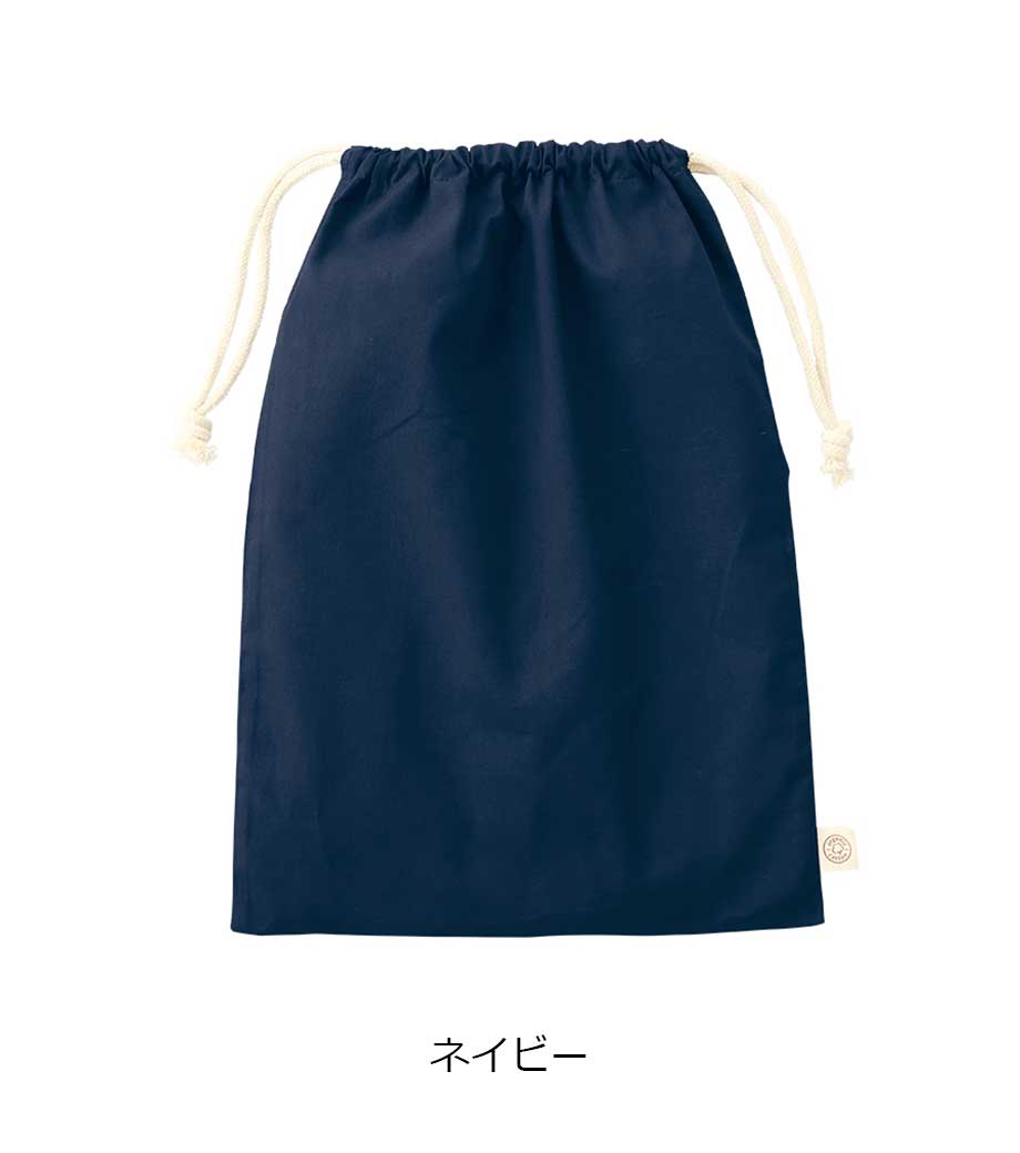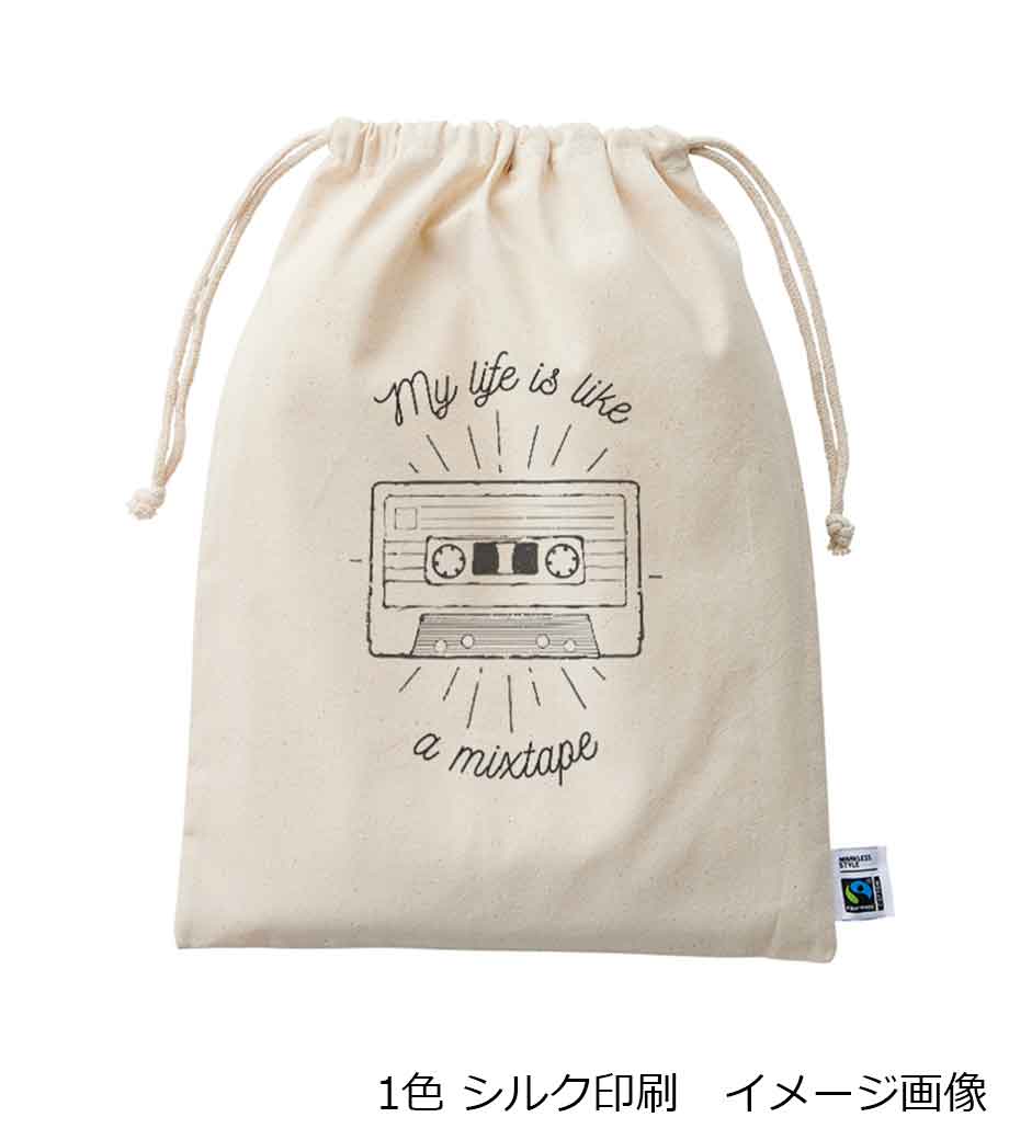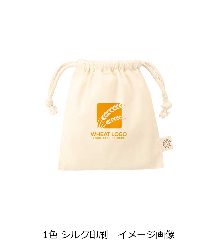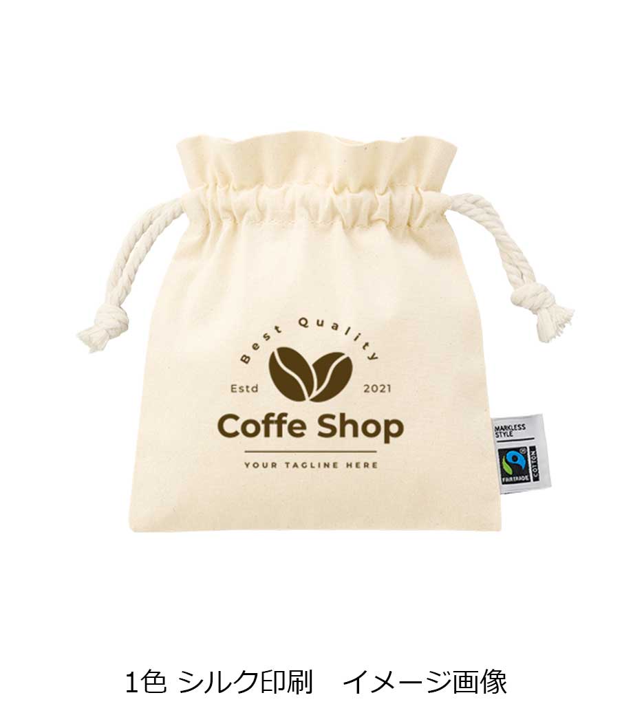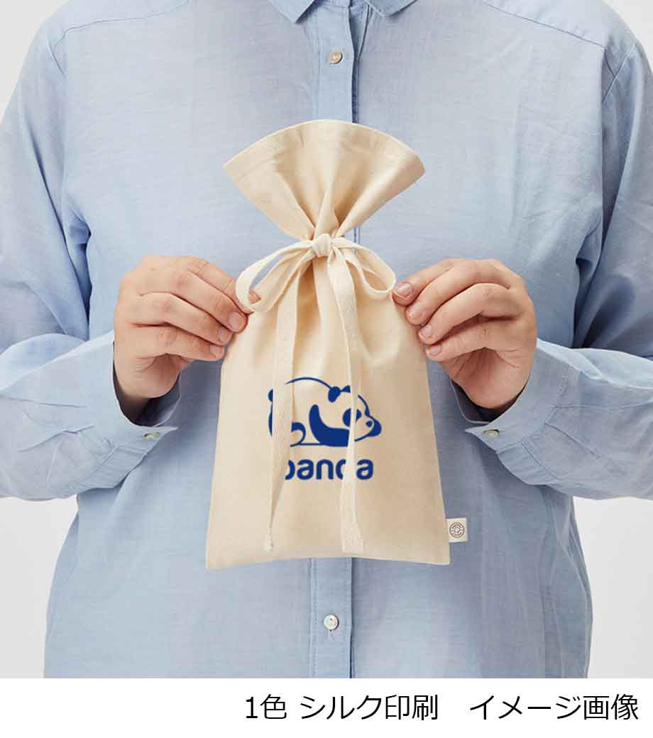 名入れ印刷が可能。ロゴやイベント名を印刷してオリジナル巾着が作れます。フェアトレード商品で持続可能な発展を支え、温かみあふれるオーガニックコットン。SDGsに取り組む企業のノベルティとしておすすめです。