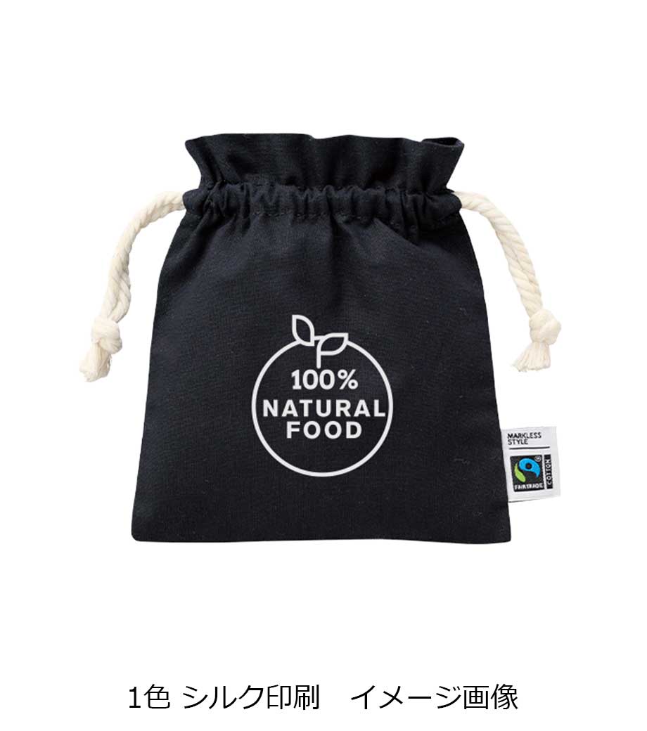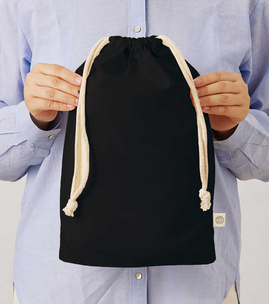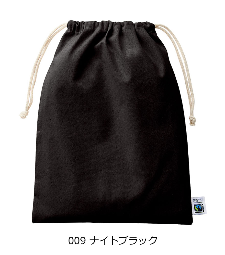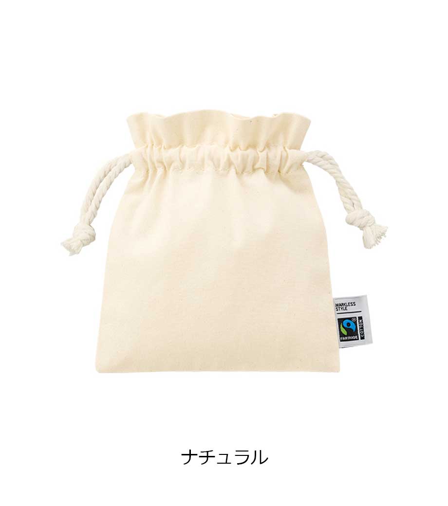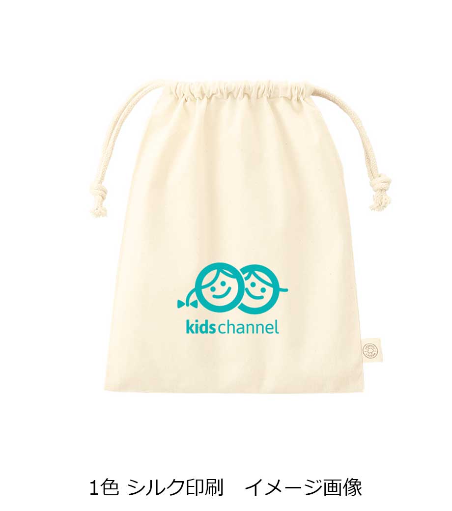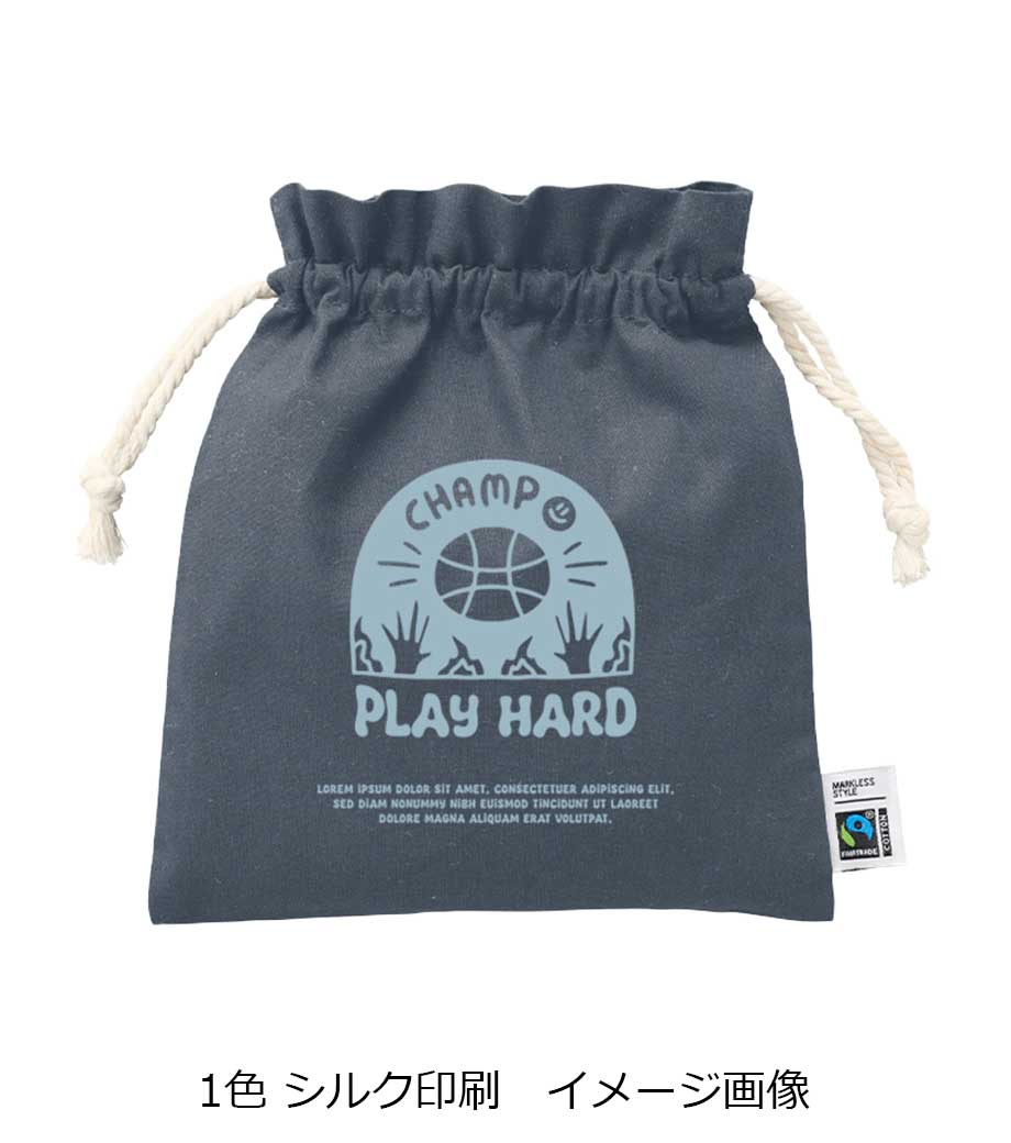 名入れ印刷が可能。ロゴやイベント名を印刷してオリジナル巾着が作れます。フェアトレード商品で持続可能な発展を支え、温かみあふれるオーガニックコットン。SDGsに取り組む企業のノベルティとしておすすめです。