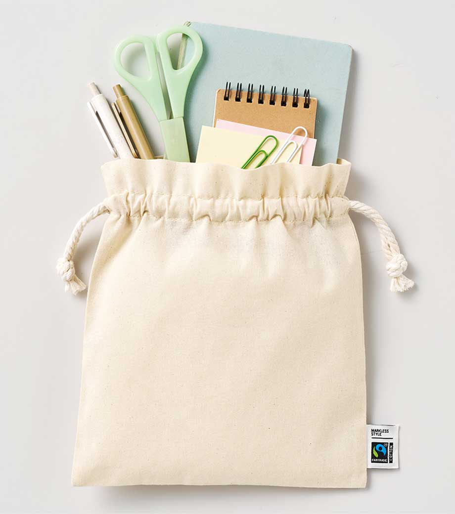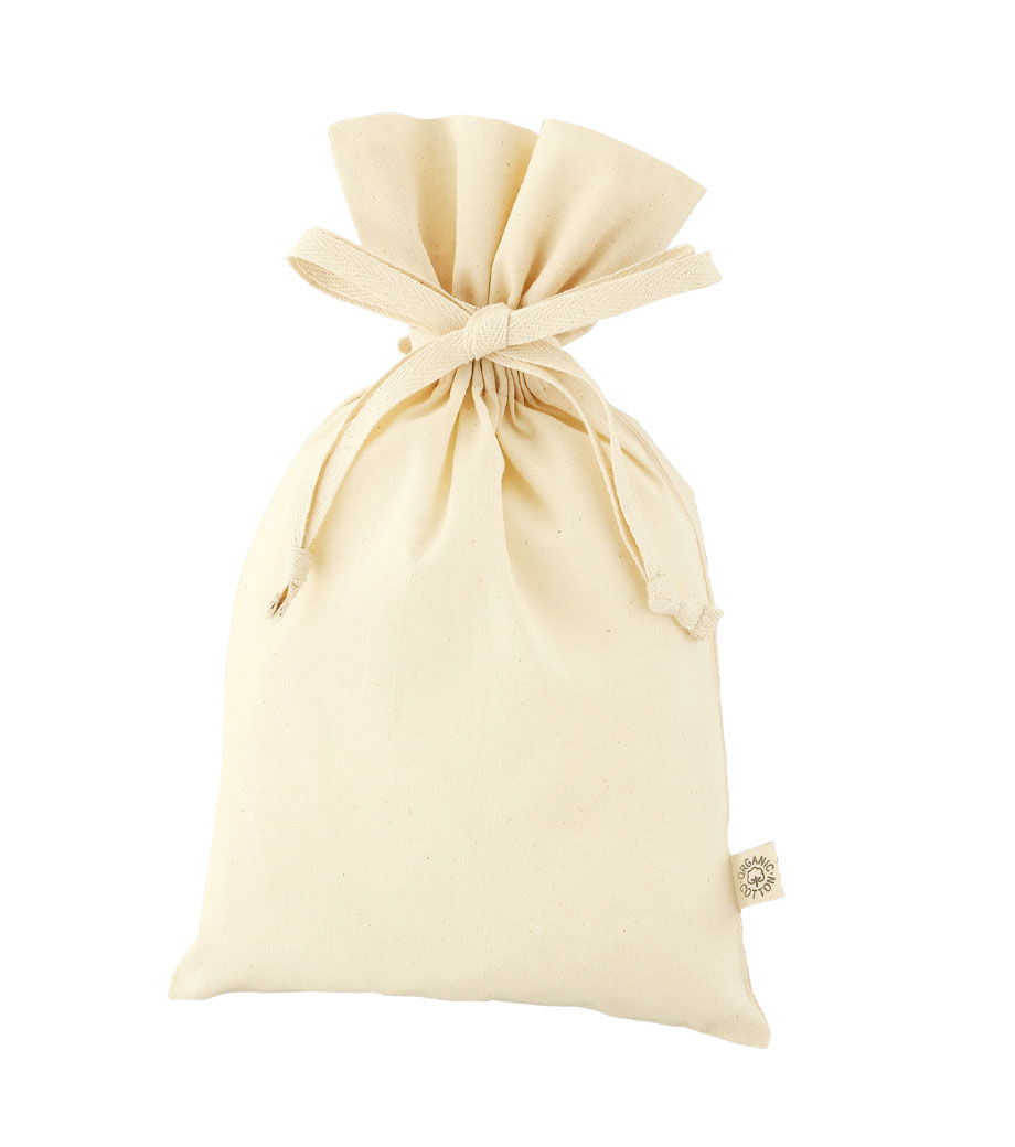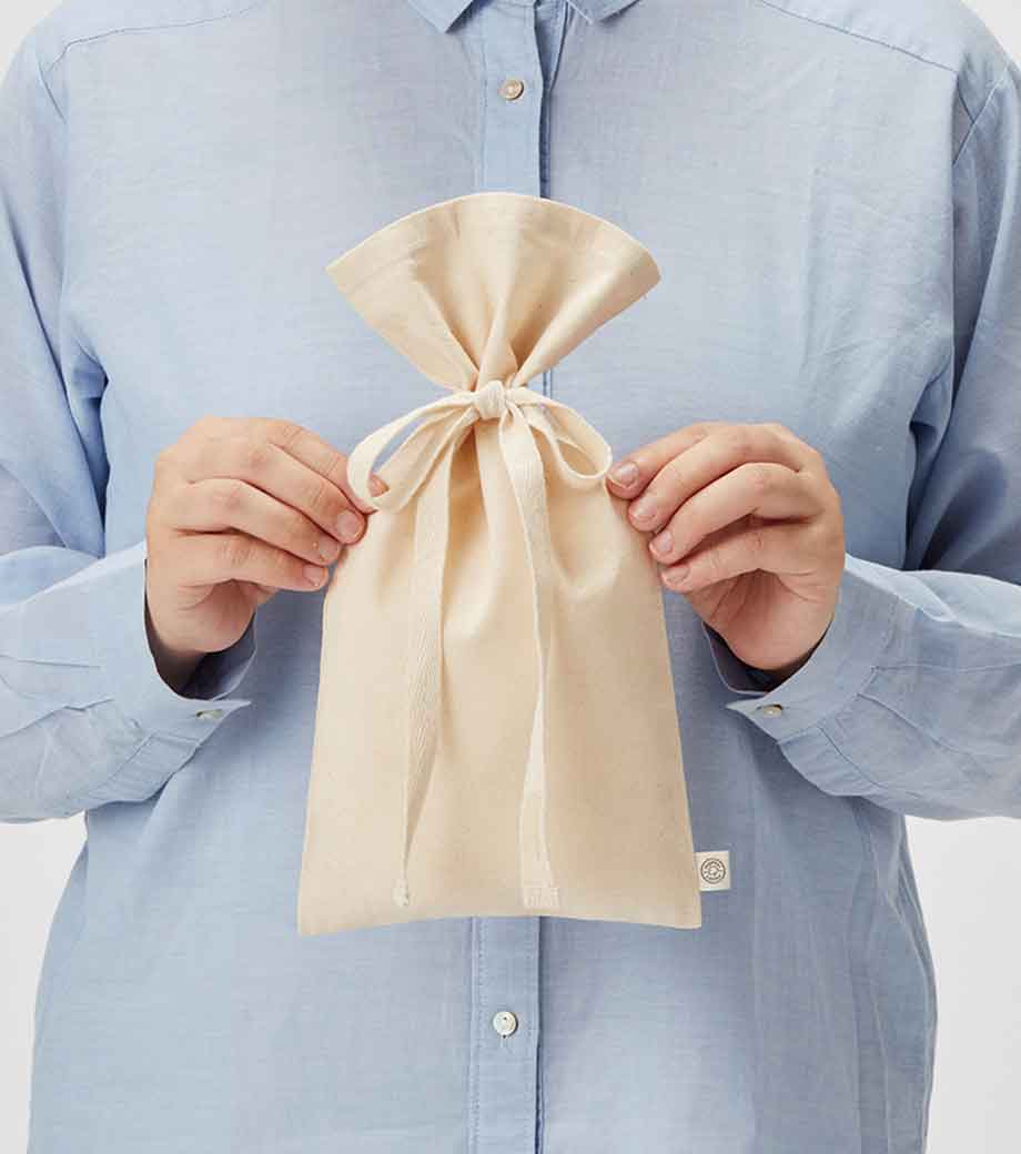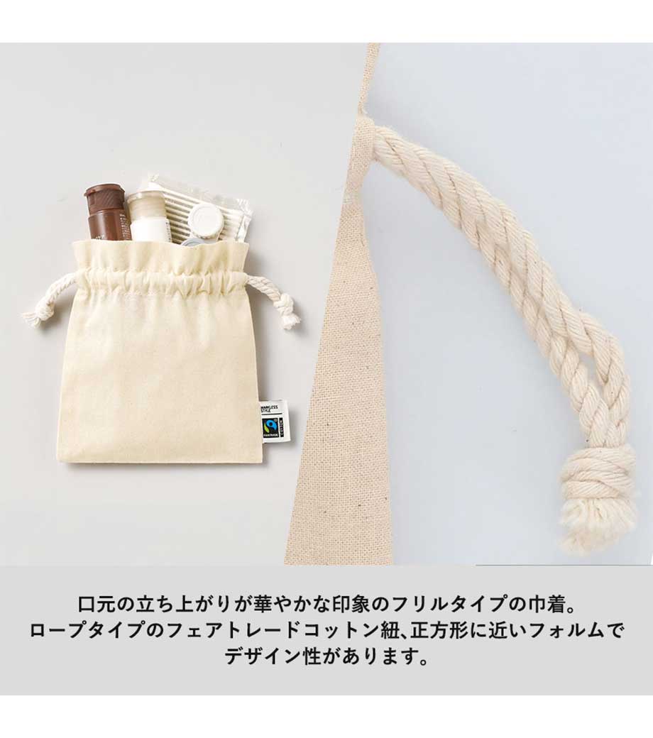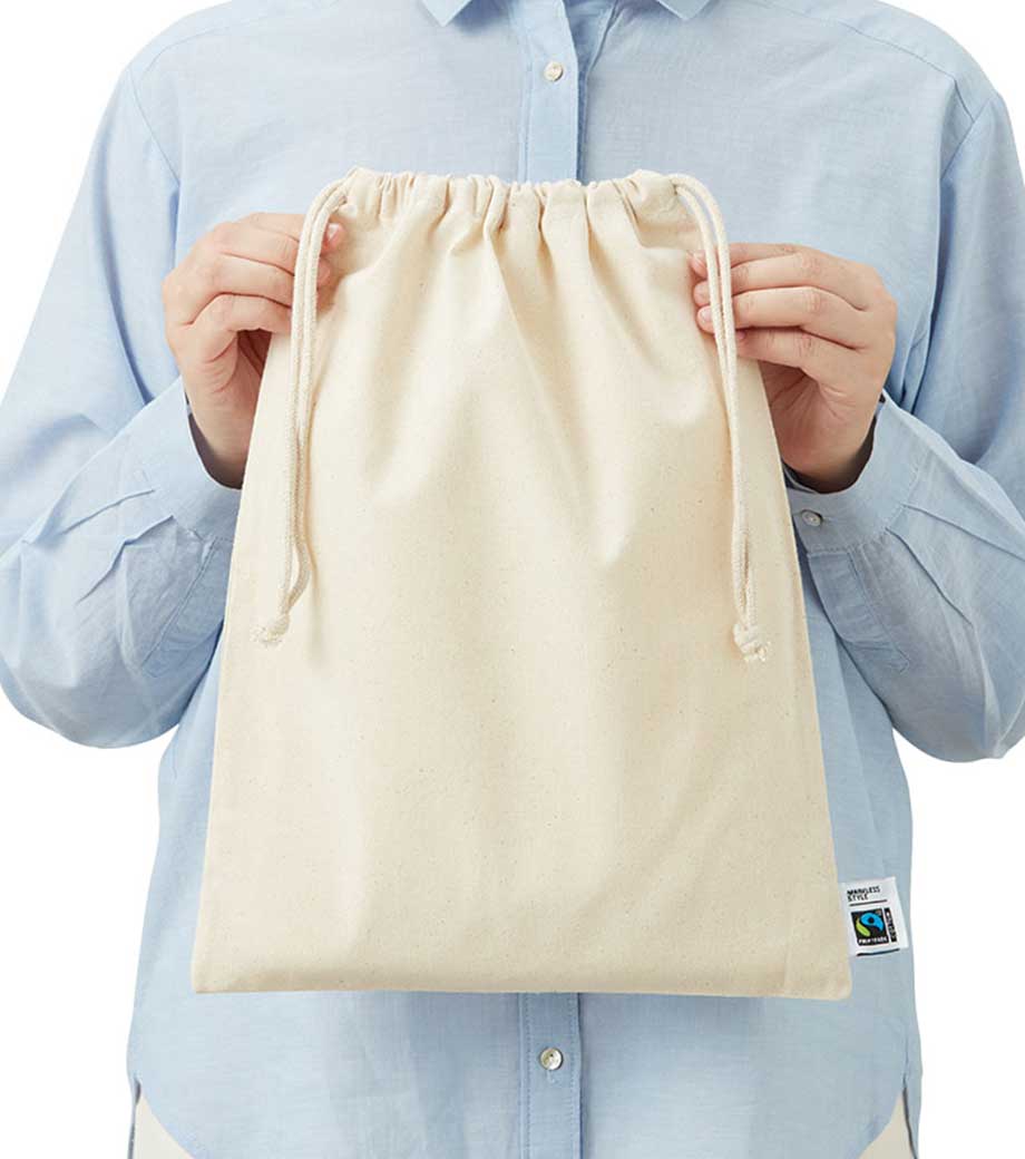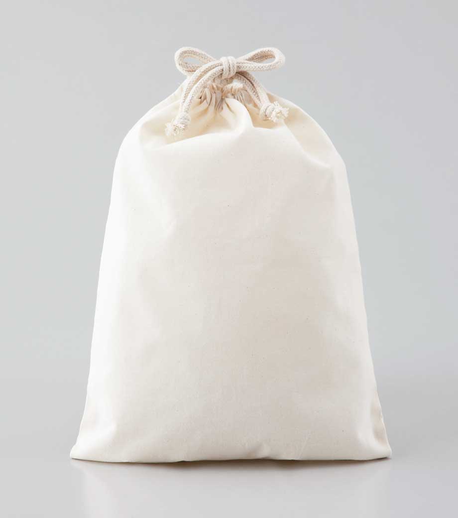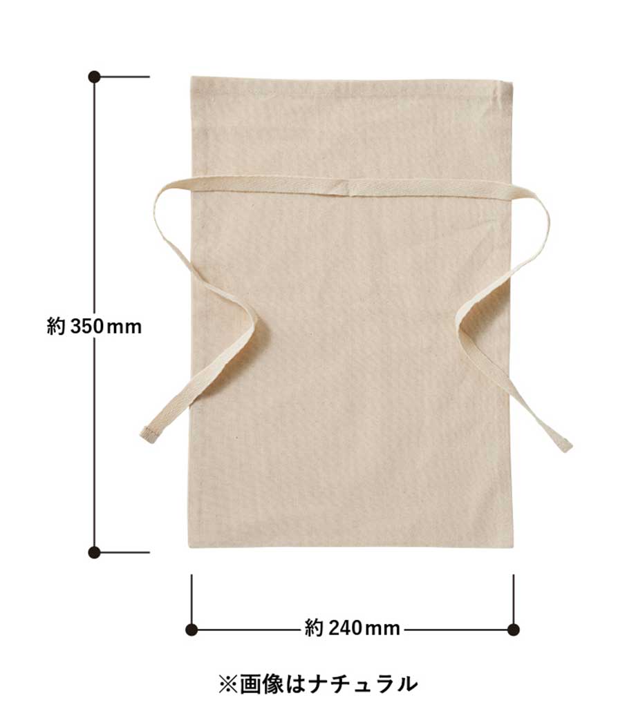 名入れ印刷が可能。ロゴやイベント名を印刷してオリジナル巾着が作れます。フェアトレード商品で持続可能な発展を支え、温かみあふれるオーガニックコットン。SDGsに取り組む企業のノベルティとしておすすめです。