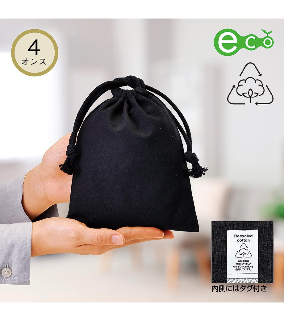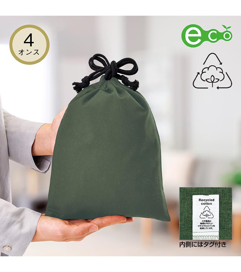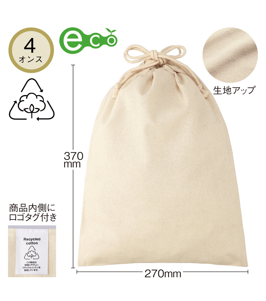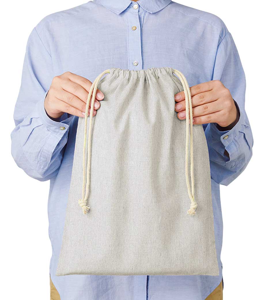スフィア・リサイクルコットン巾着(L)は工場などで廃棄される生地をリサイクルした糸を使用したエコ商品。約4オンスと薄手ですが、リサイクル素材のためややハリのある生地感です。内側にはオリジナルのリサイクルコットンマークが付いており、SDGsを意識したノベルティを製作できます。
