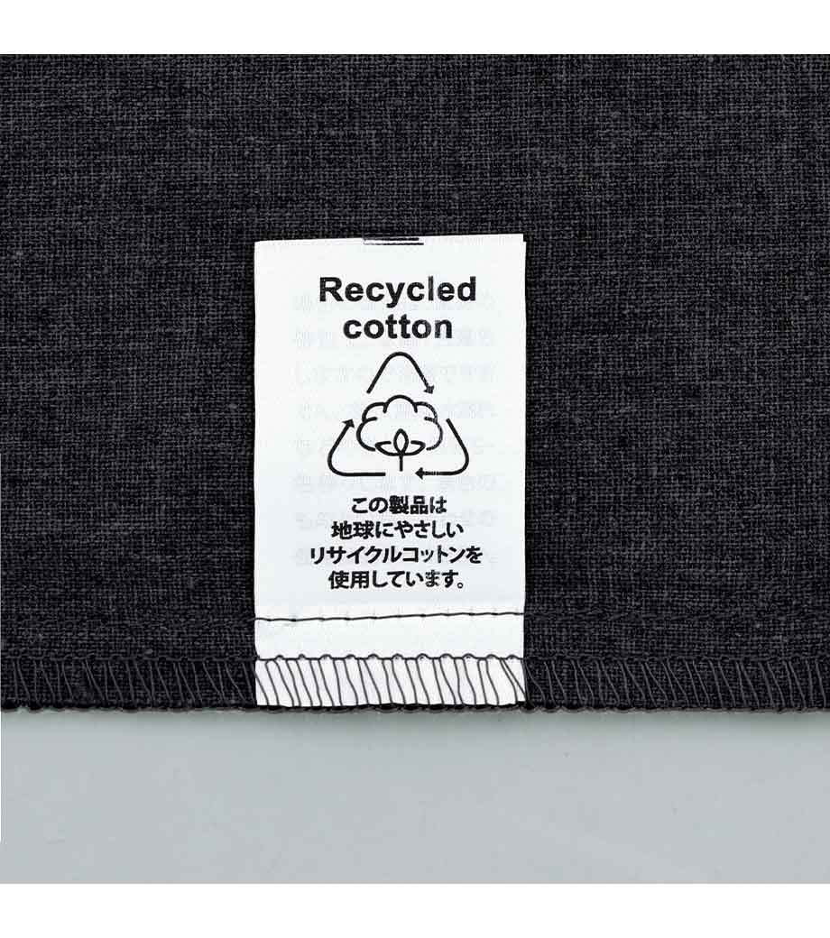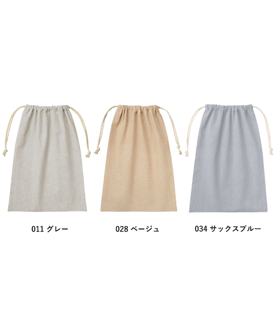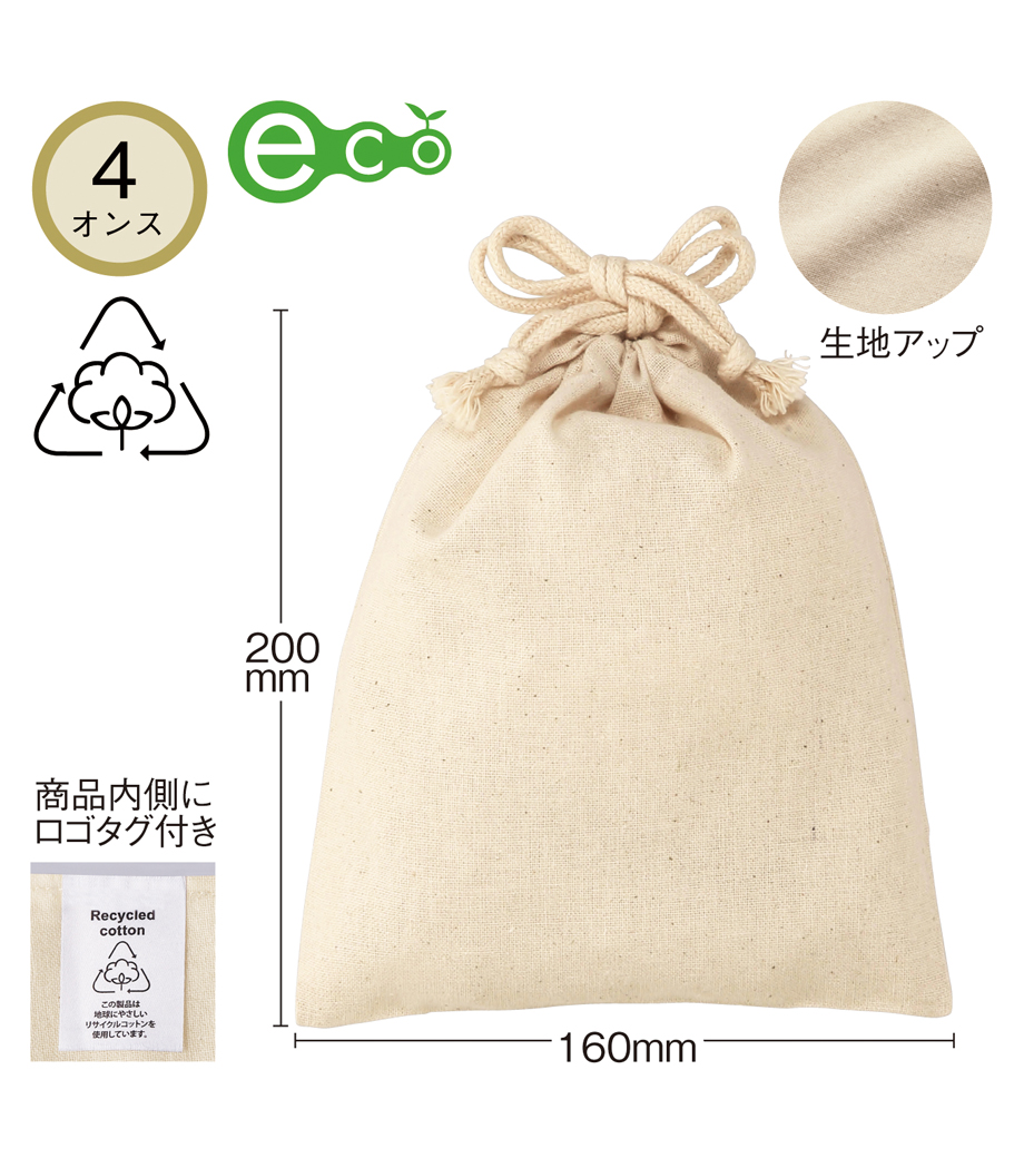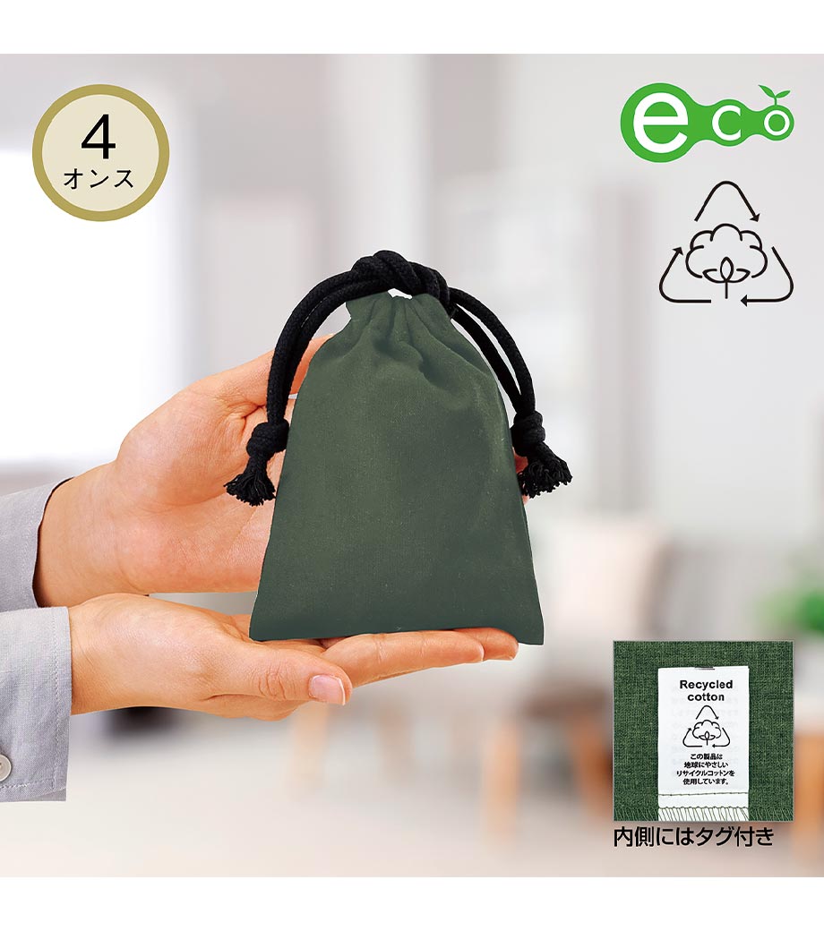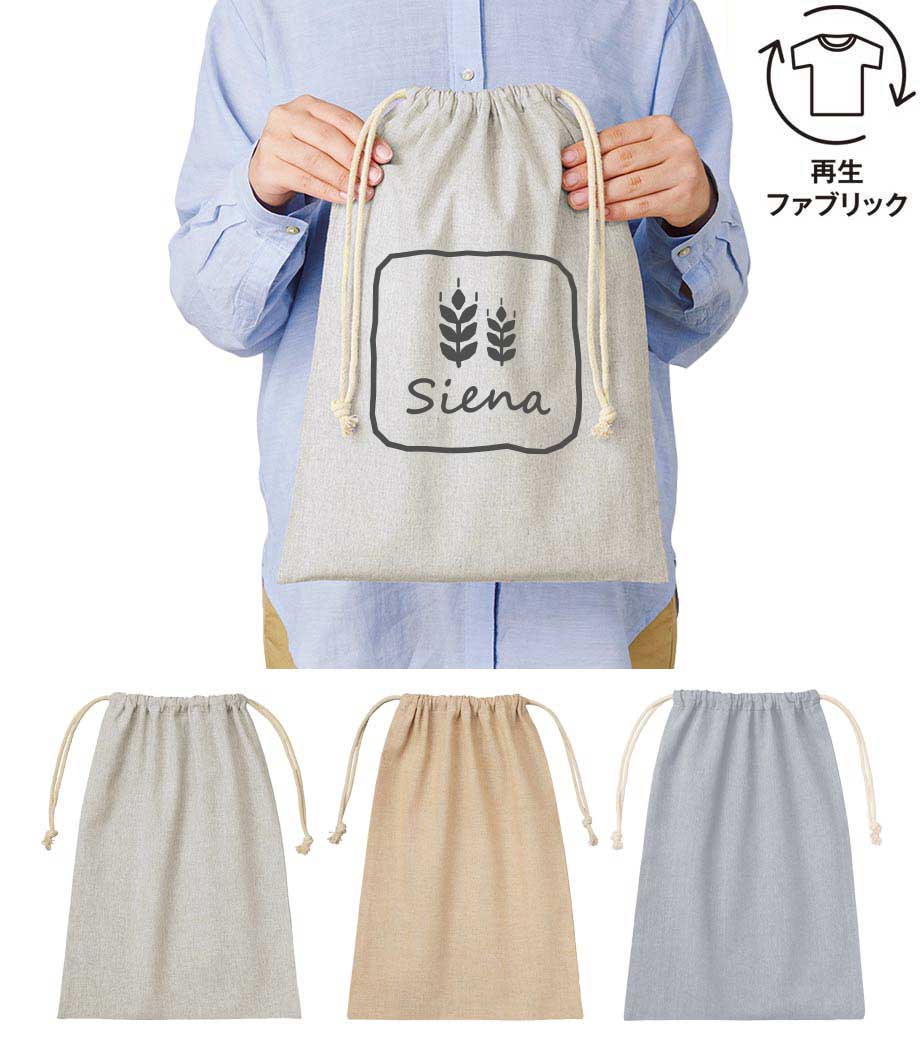 スフィア・リサイクルコットン巾着(L)は工場などで廃棄される生地をリサイクルした糸を使用したエコ商品。約4オンスと薄手ですが、リサイクル素材のためややハリのある生地感です。内側にはオリジナルのリサイクルコットンマークが付いており、SDGsを意識したノベルティを製作できます。