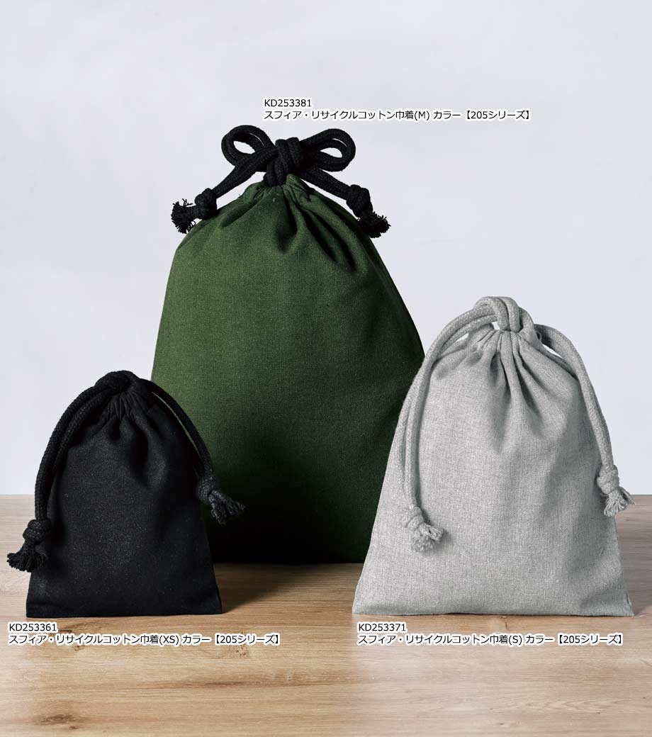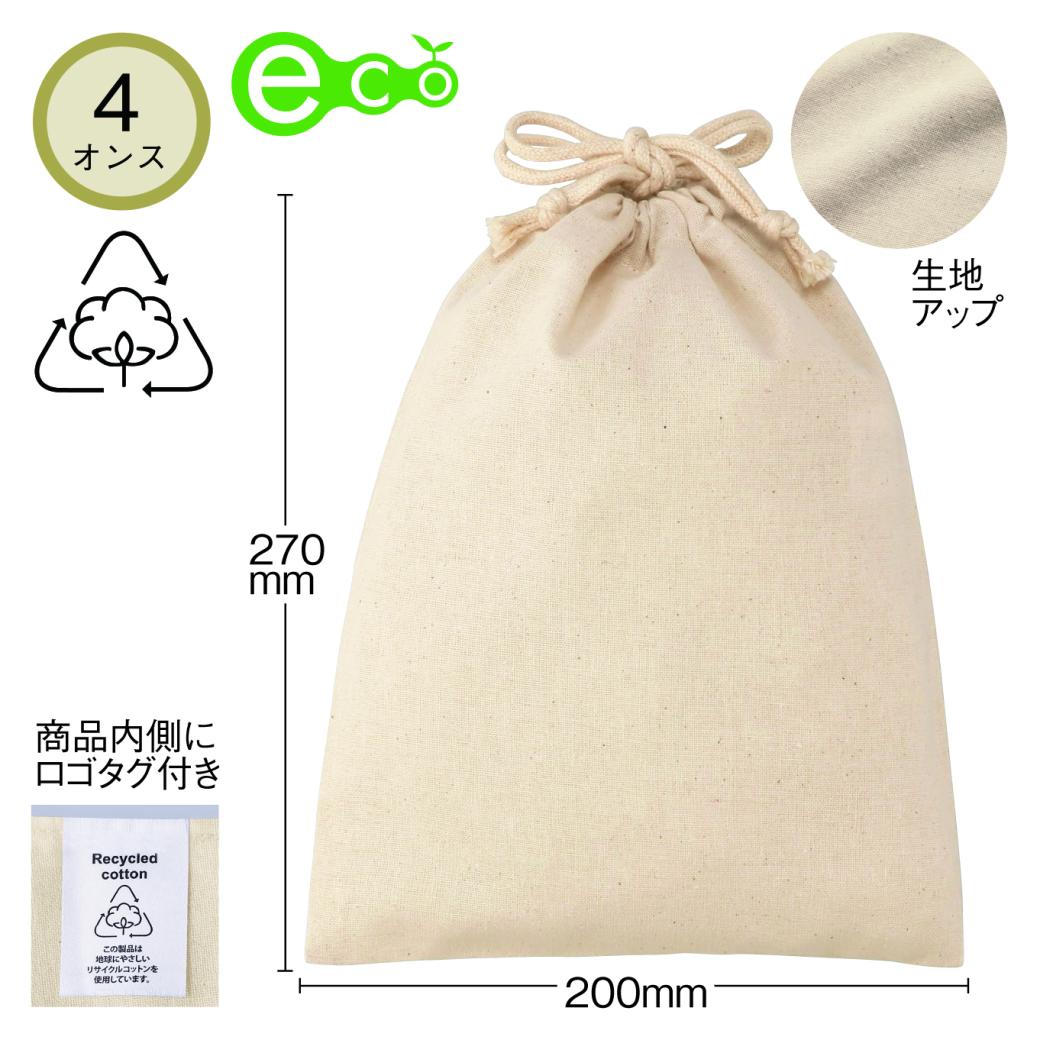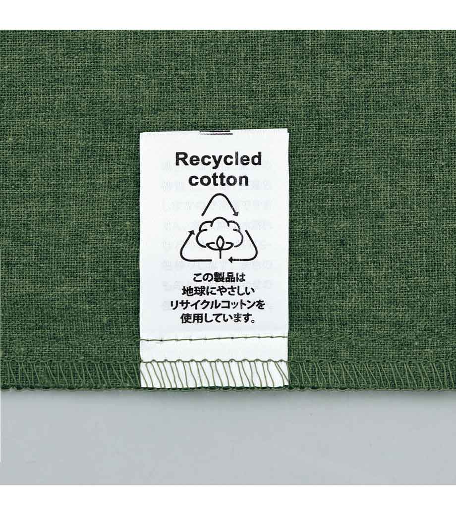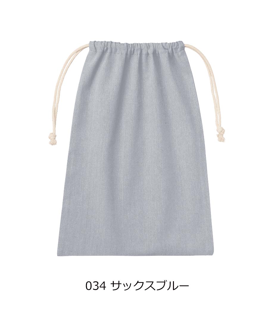 スフィア・リサイクルコットン巾着(L)は工場などで廃棄される生地をリサイクルした糸を使用したエコ商品。約4オンスと薄手ですが、リサイクル素材のためややハリのある生地感です。内側にはオリジナルのリサイクルコットンマークが付いており、SDGsを意識したノベルティを製作できます。