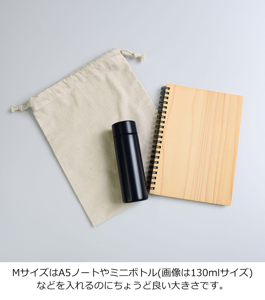 「コットン巾着(M)」は自然の風合いがやさしい、コットン素材の巾着袋です。やや薄手のシーチング生地で、旅行用の化粧品や、小物をまとめるのにちょうどよい大きさです。シンプルな巾着タイプは、デイリー使いにぴったり。