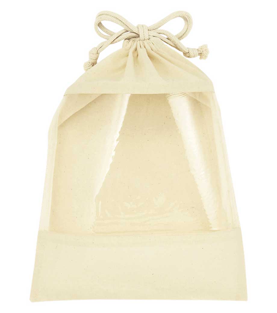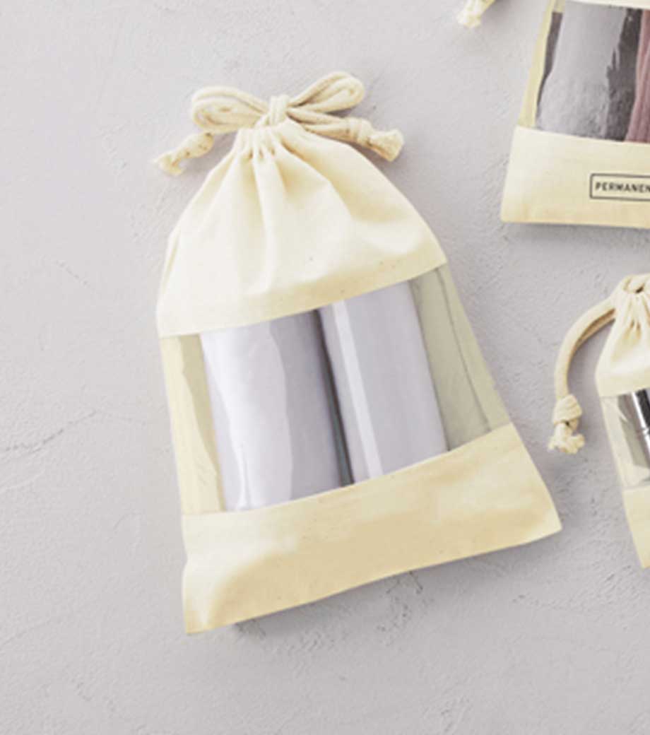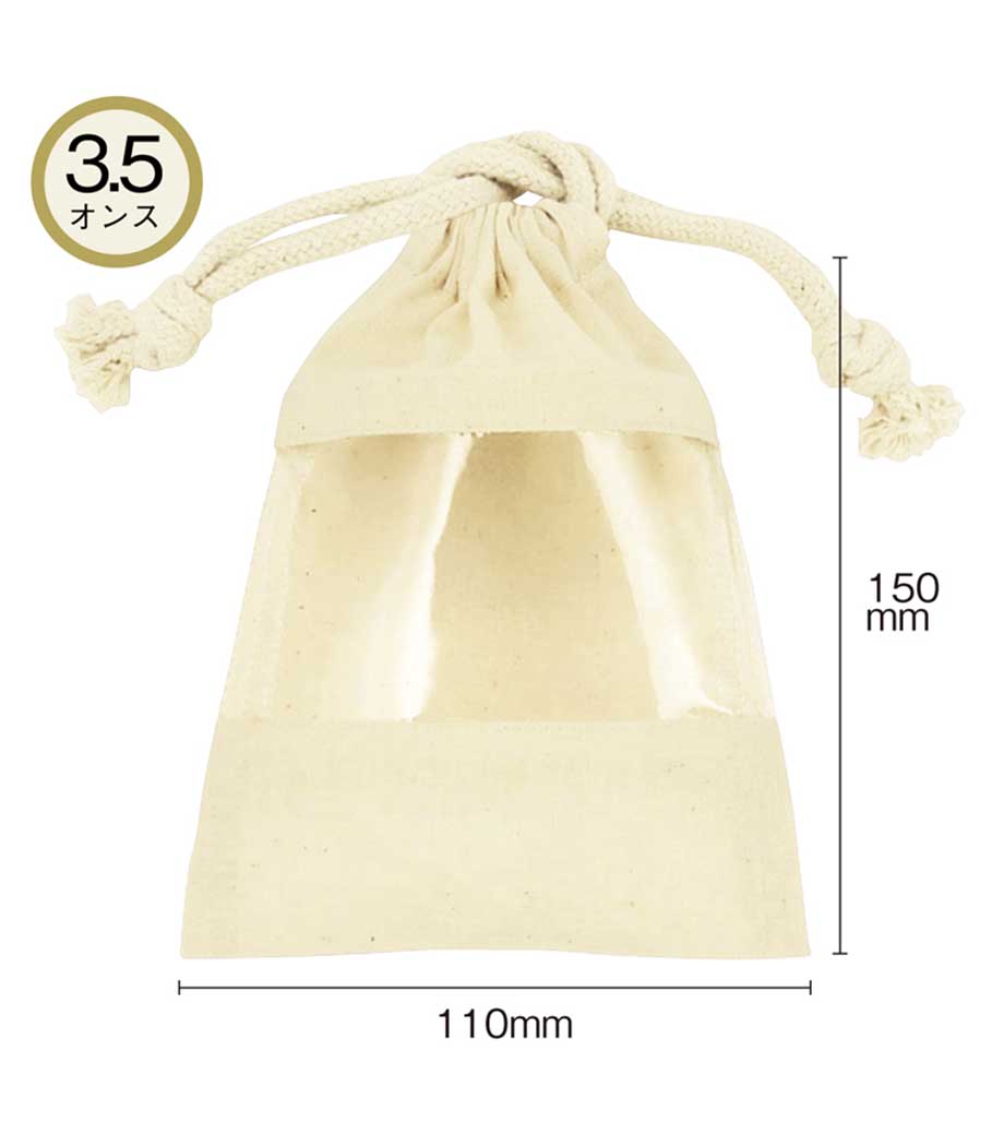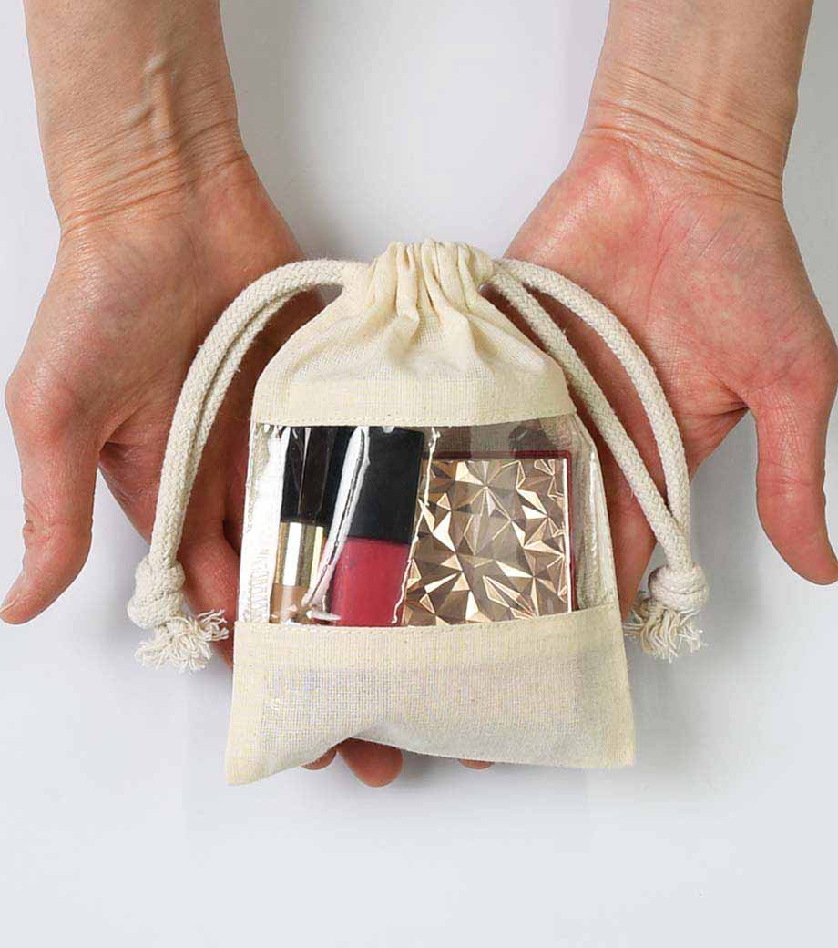 コットンクリア・ギフト巾着(S)は中央がクリア素材になっているコットン巾着。クリア部分はPVC素材で汚れがつきにくく、中身が見えるのが特徴です。コスメやガジェットなど、小物のプレゼント用ラッピングにおすすめ!手気軽にお渡しできるサイズ感が魅力です。コットン部分は薄手の約3.5オンス。生地が柔らかいので、ラッピングの量がたくさんあってもスムーズに包装できますよ。