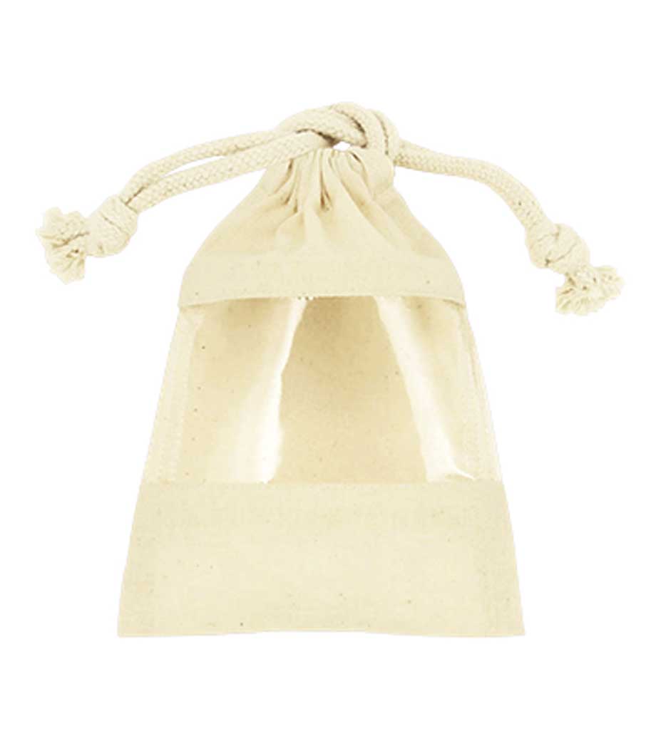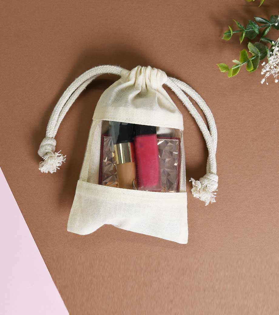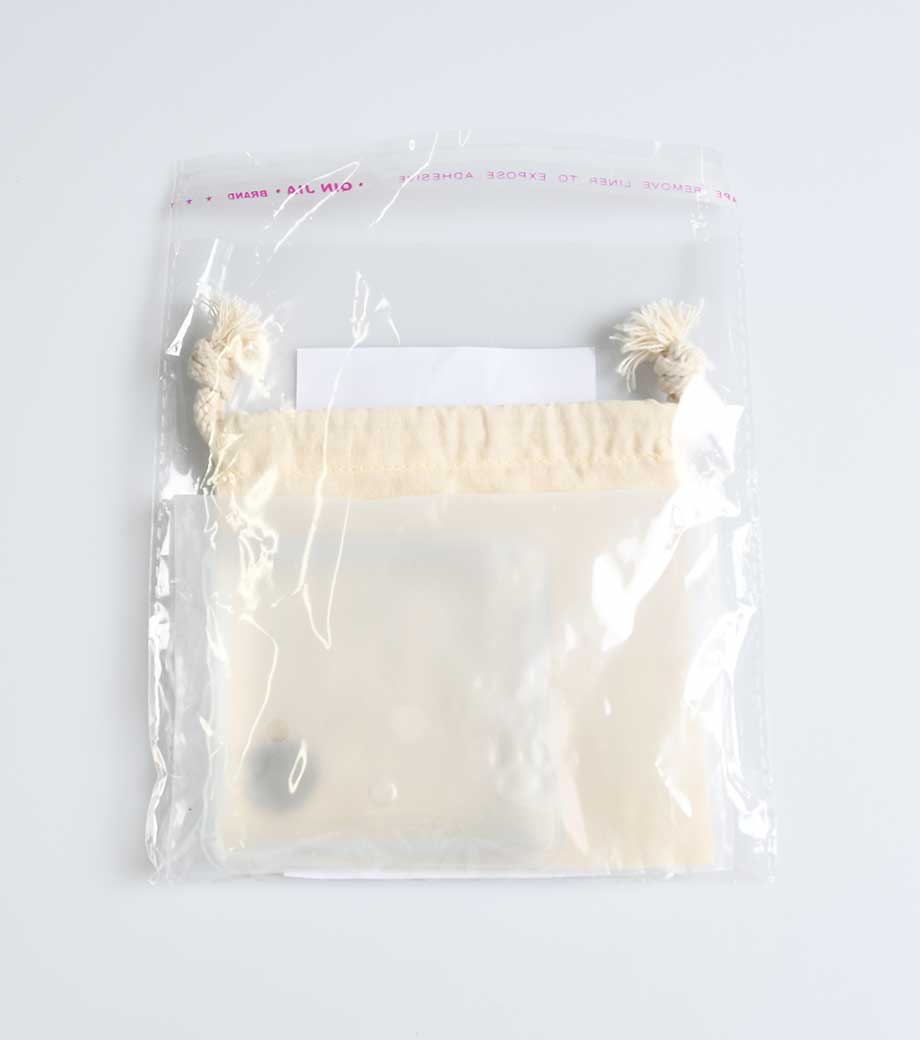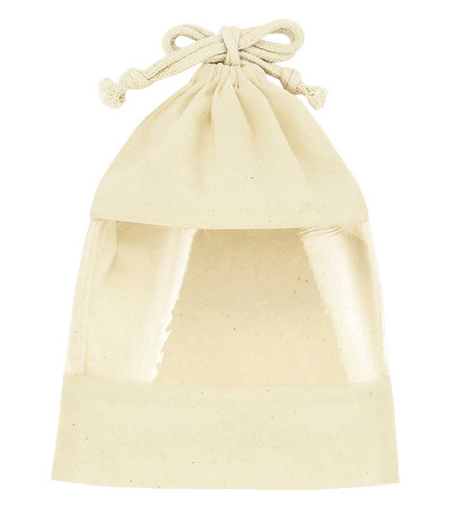 コットンクリア・ギフト巾着(S)は中央がクリア素材になっているコットン巾着。クリア部分はPVC素材で汚れがつきにくく、中身が見えるのが特徴です。コスメやガジェットなど、小物のプレゼント用ラッピングにおすすめ!手気軽にお渡しできるサイズ感が魅力です。コットン部分は薄手の約3.5オンス。生地が柔らかいので、ラッピングの量がたくさんあってもスムーズに包装できますよ。