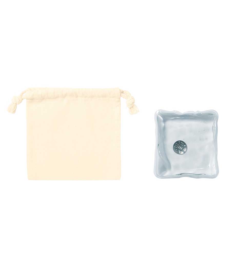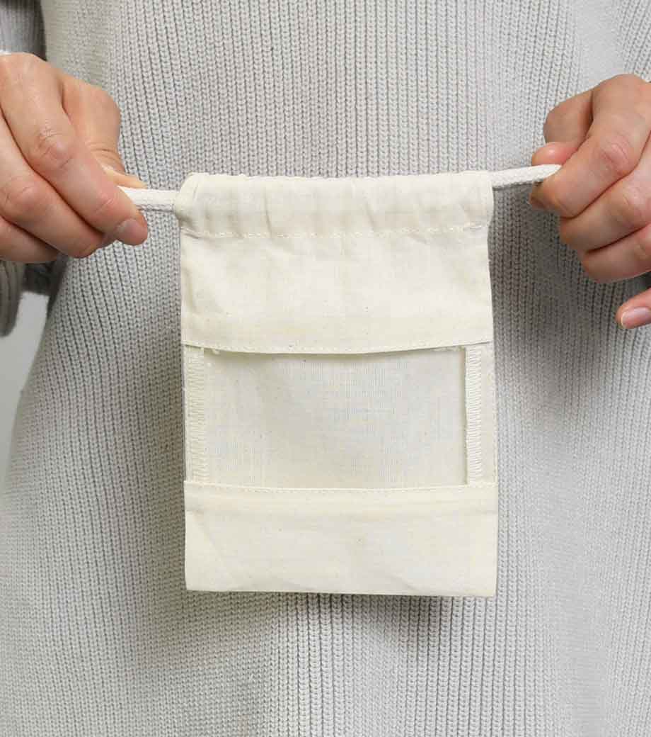 ネット素材と5オンスのコットン生地がドッキング。巾着上部のネットから中身が見えるのでギフトパッケージやラッピングに使ってもおしゃれです。コットン生地は5オンスで程よい薄さ。使い勝手の良い正方形サイズは普段使いのほか、アメニティやモバイルグッズをひとまとめにするのにも便利です。