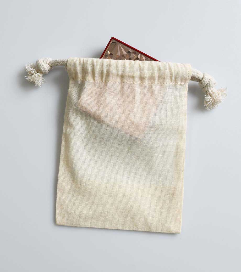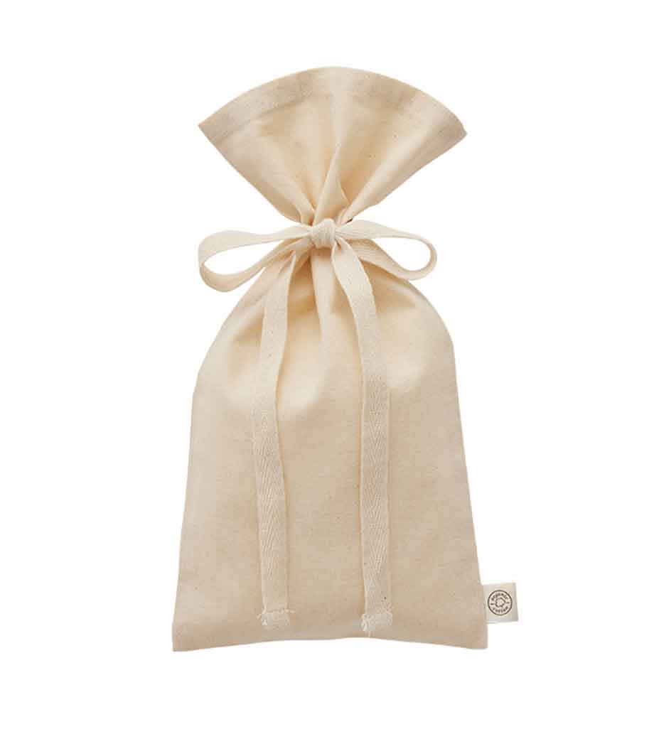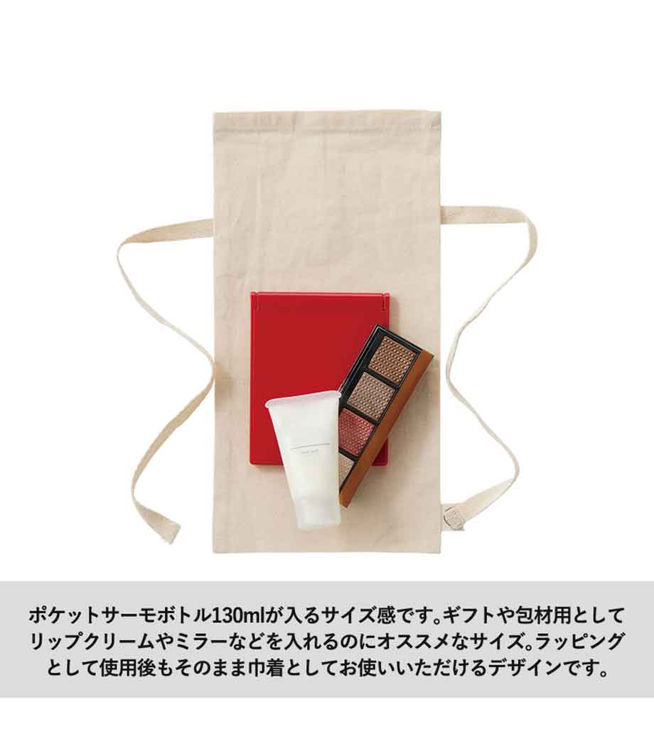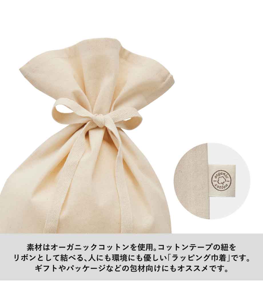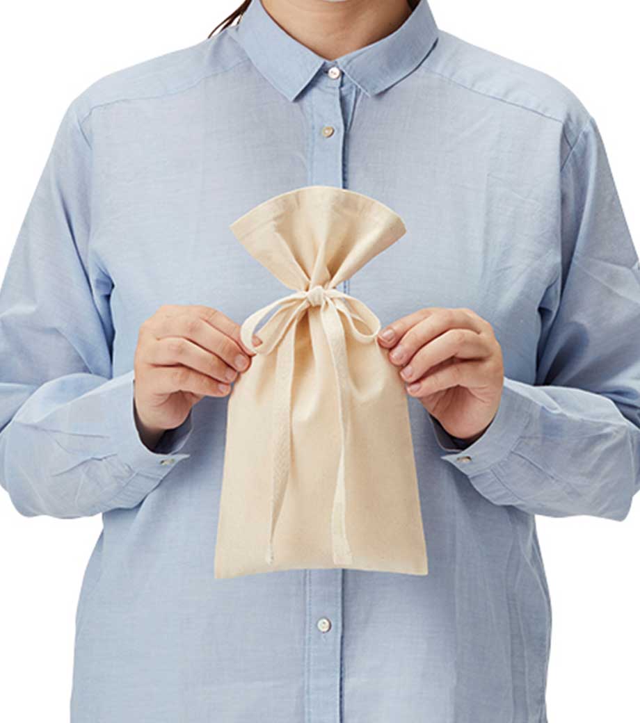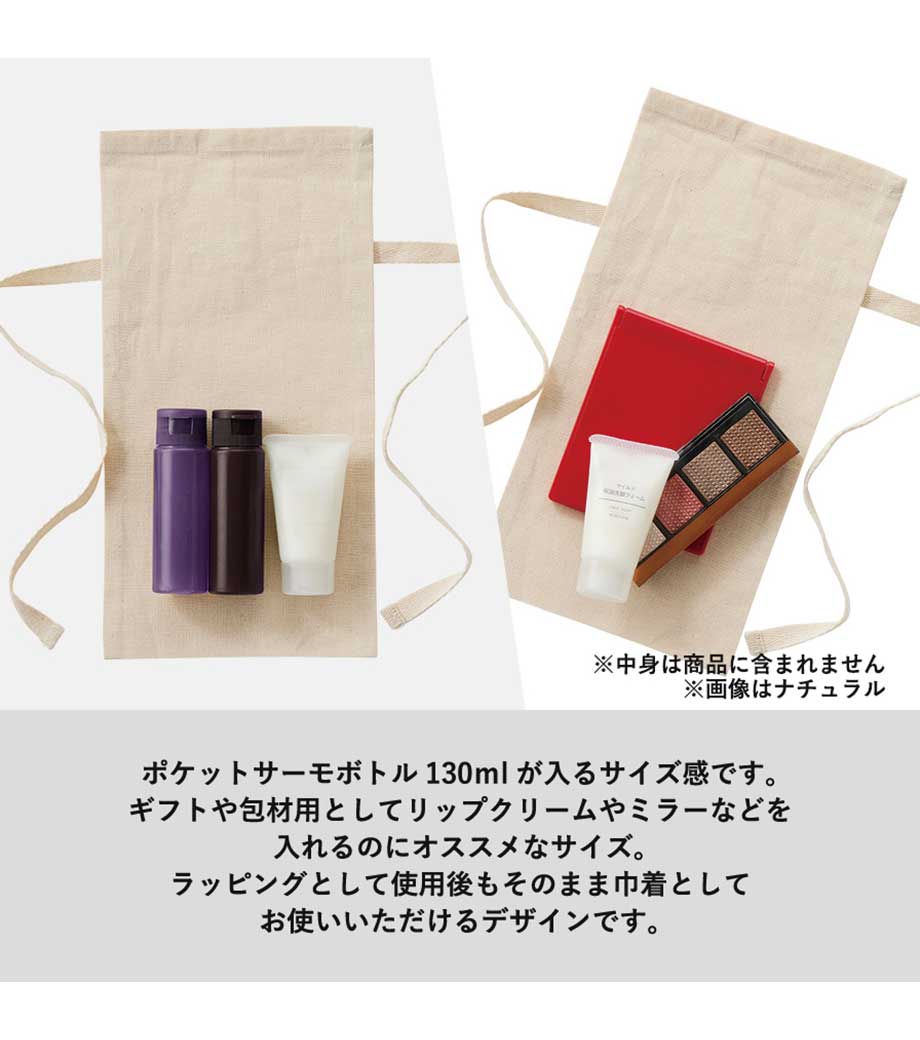 オーガニックコットンラッピング巾着(S)は、サステナブル素材として注目されているオーガニックコットン製。環境負荷が少ない生産工程で作られた、SDGsの目標に貢献できるノベルティです。130ml程度の小ぶりなボトルが入るサイズ感で、コスメグッズやコンパクトミラーなどを入れるのにピッタリ!コットンテープの紐をリボン結びにすれば、おしゃれで可愛らしいギフトラッピングが簡単にできますよ。