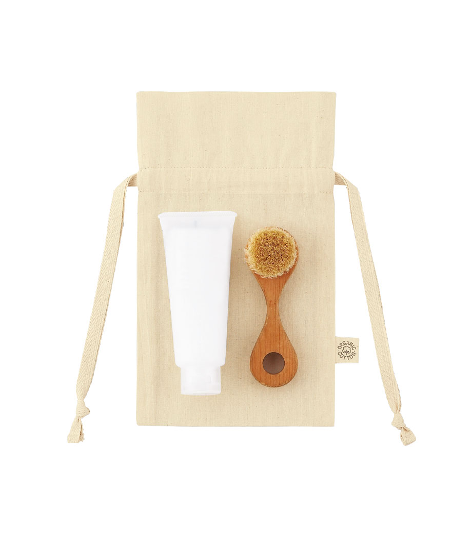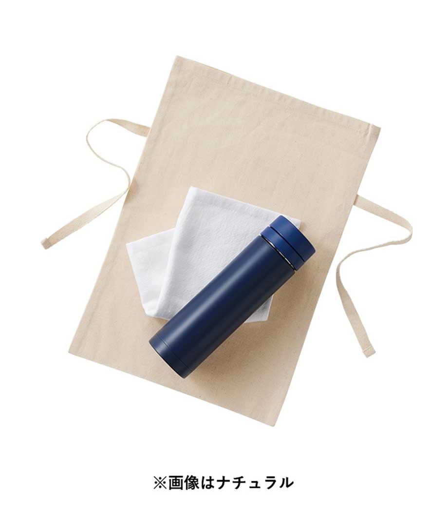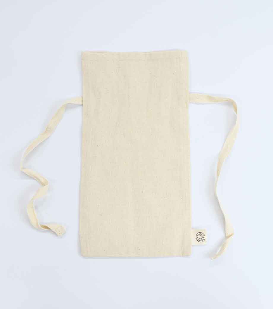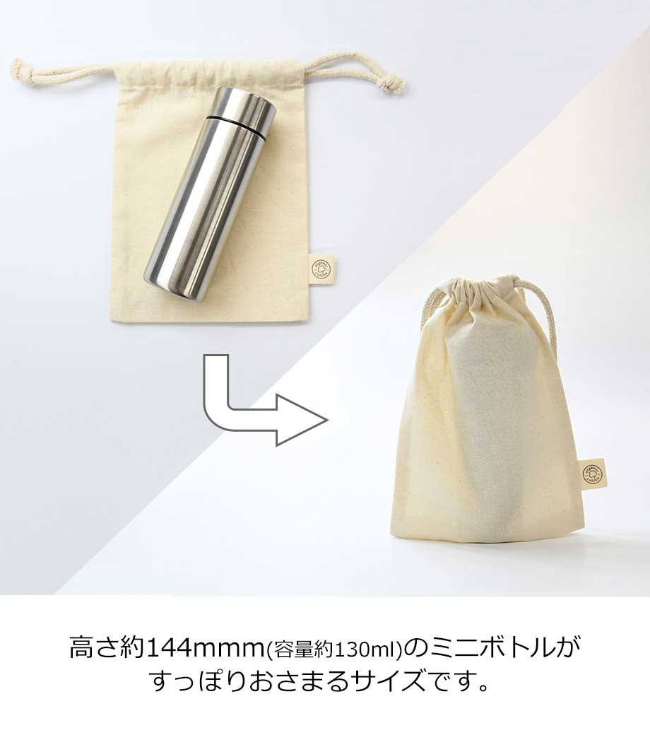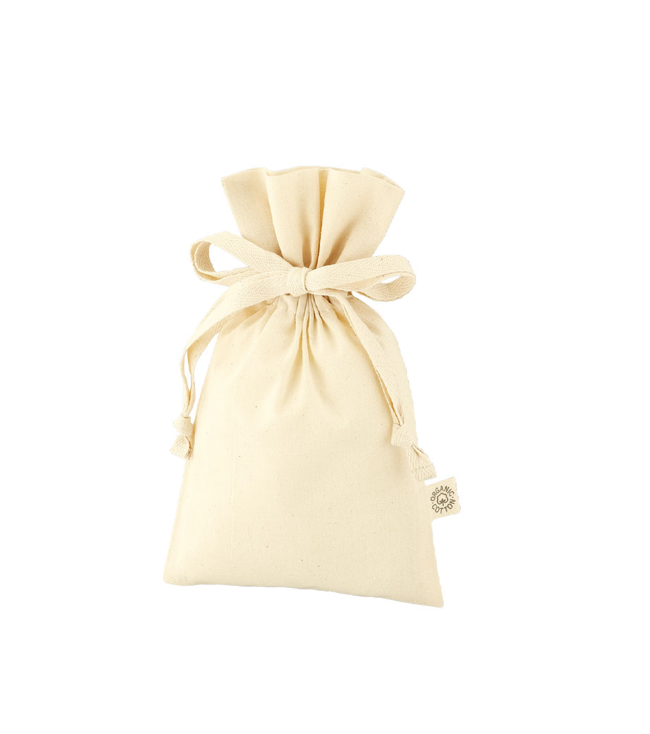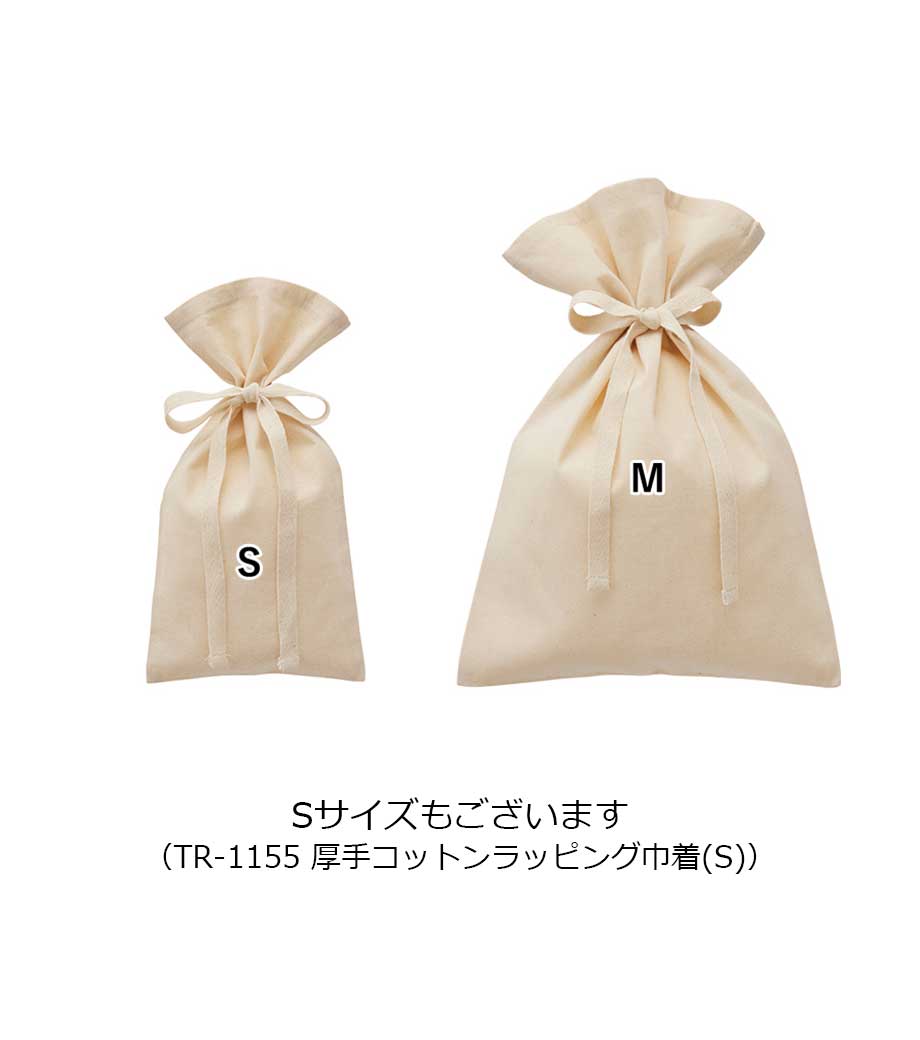 オーガニックコットンラッピング巾着(S)は、サステナブル素材として注目されているオーガニックコットン製。環境負荷が少ない生産工程で作られた、SDGsの目標に貢献できるノベルティです。130ml程度の小ぶりなボトルが入るサイズ感で、コスメグッズやコンパクトミラーなどを入れるのにピッタリ!コットンテープの紐をリボン結びにすれば、おしゃれで可愛らしいギフトラッピングが簡単にできますよ。