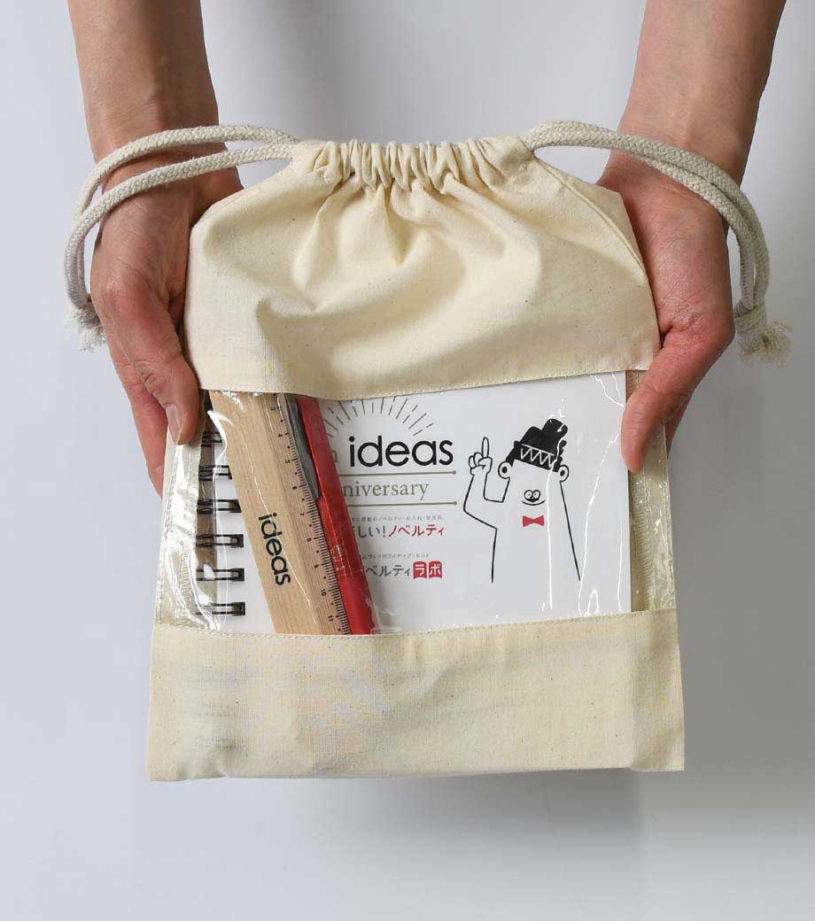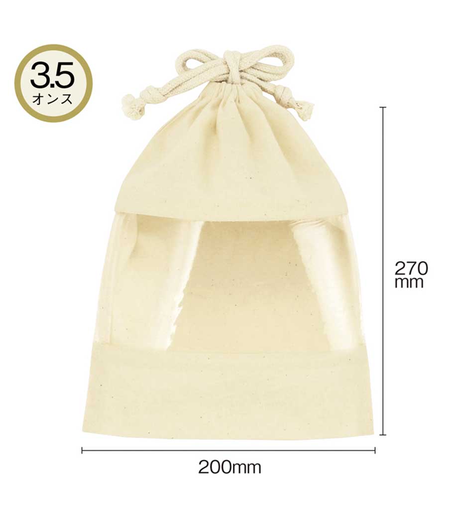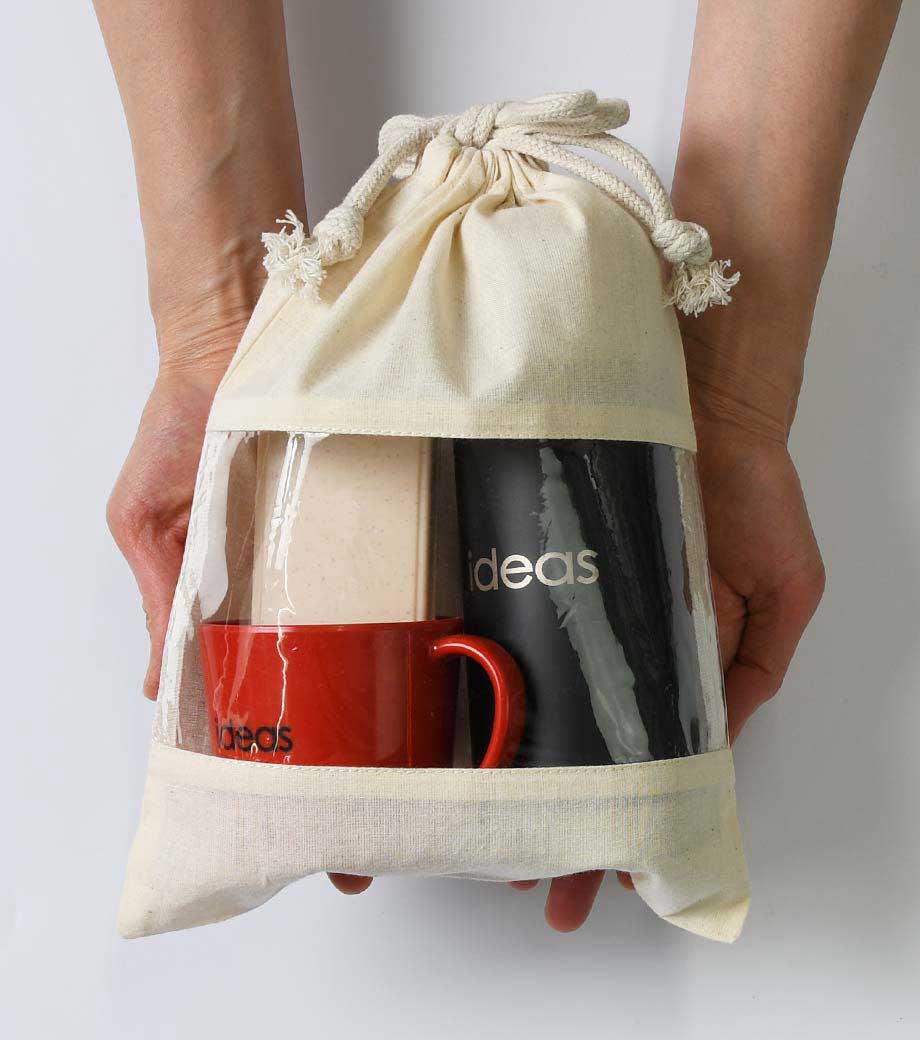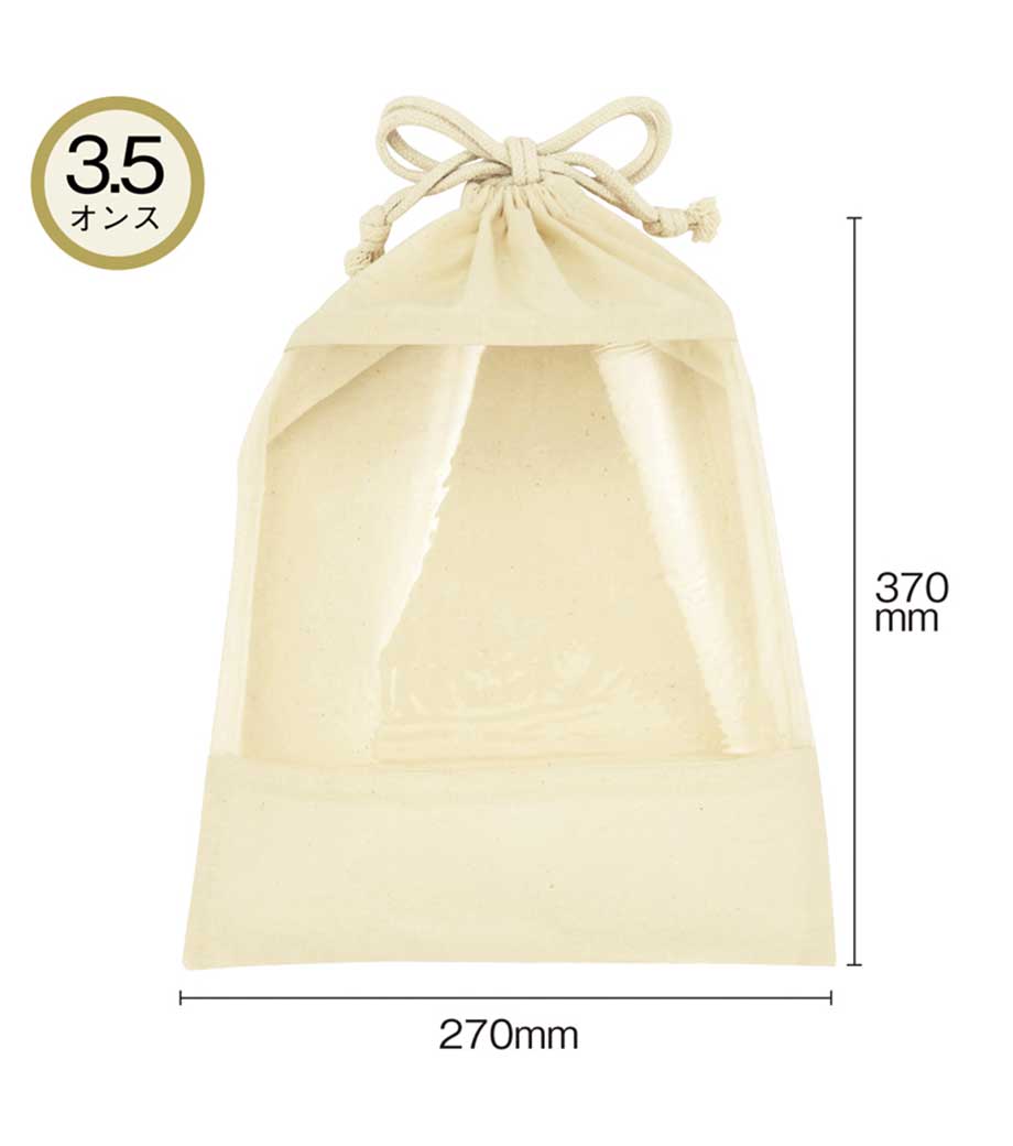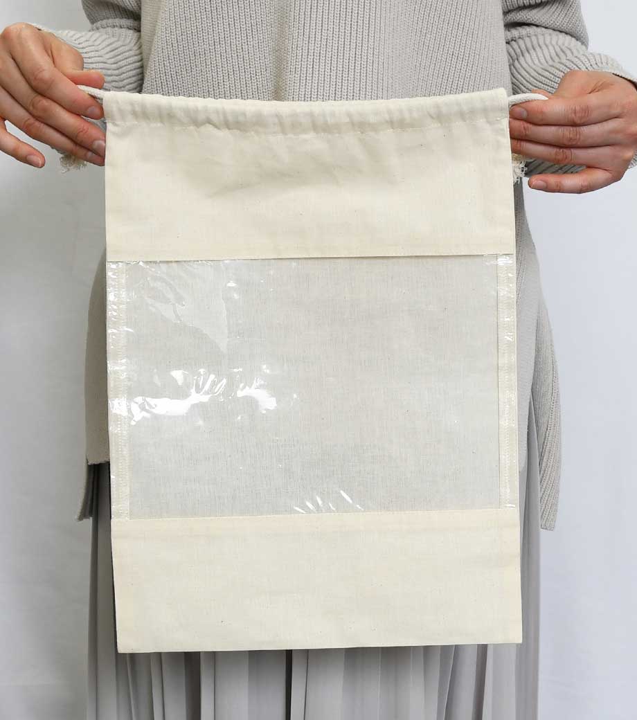 コットンクリア・ギフト巾着(L)は中央がクリア素材になっているコットン巾着。クリア部分はPVC素材で汚れがつきにくく、中身が見えるのが特徴です。Tシャツやストールなどの衣料品や、シューズなども収まる大きめサイズ。アパレルブランドの周年記念品を梱包して、ギフト用にオススメです。長く使ってもらえるので、販促効果も期待大!ブランドロゴを入れてオリジナル巾着をつくりませんか?