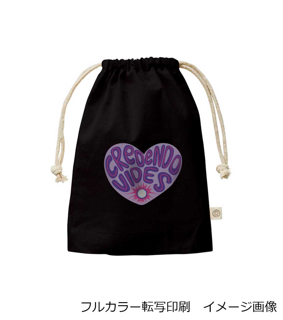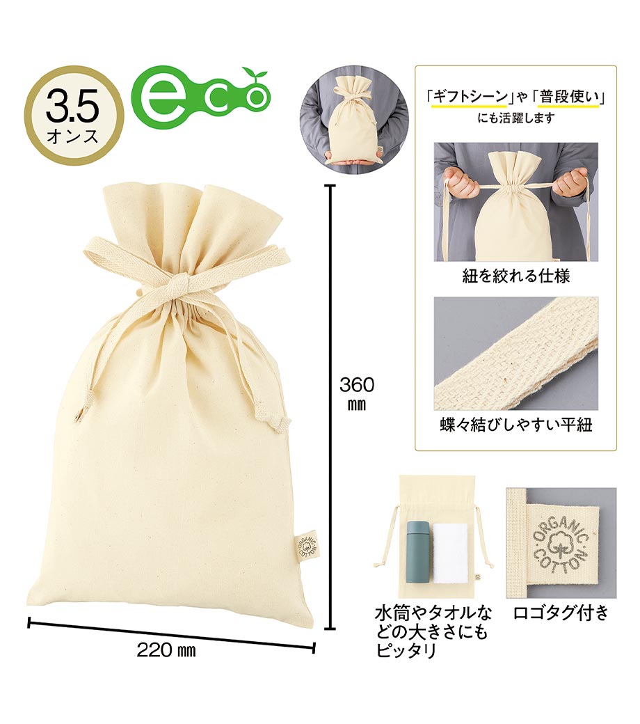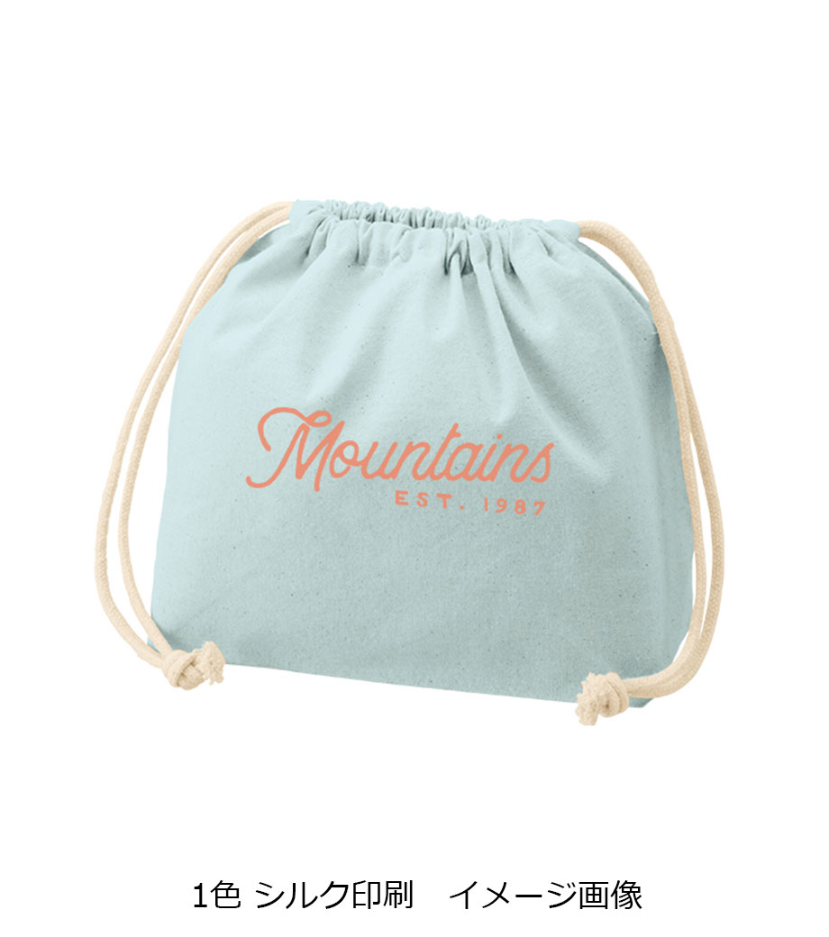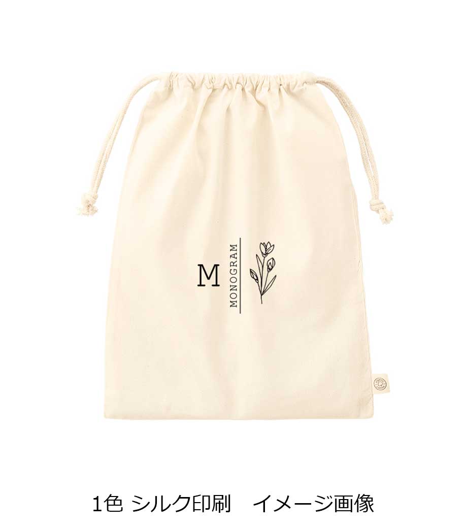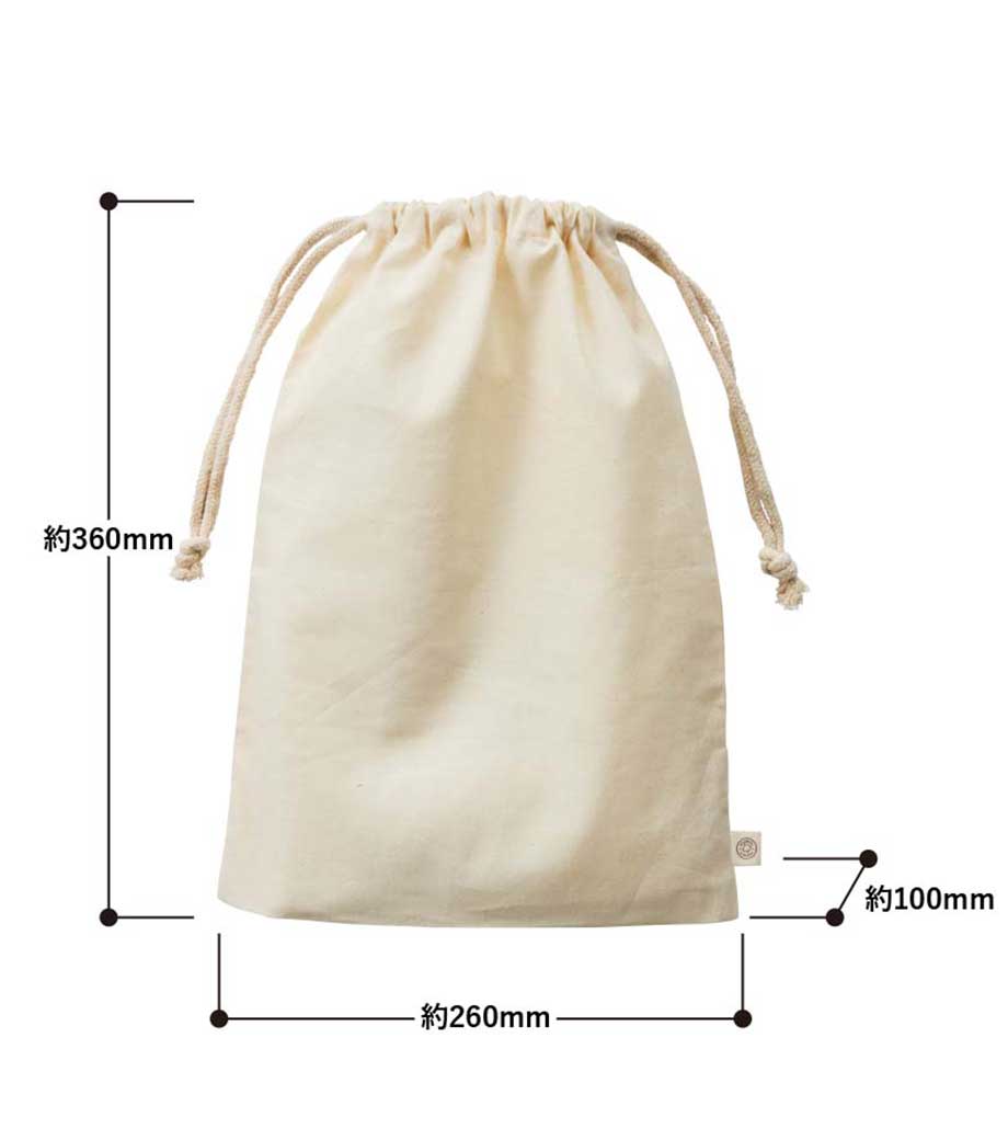 巾着は畳んだTシャツを入れられるほどのビッグサイズ。外側にはお渡しするお客様に一目で判断してもらえるオーガニックコットンマークが付いています。ギフト包装やパッケージとしてお渡しすれば、開封後も旅行時の小分け袋などに使えるのでまさにサステナブル。名入れは1色またはフルカラー印刷に対応しており、ブランドロゴなどを入れてオリジナル巾着が製作できます。