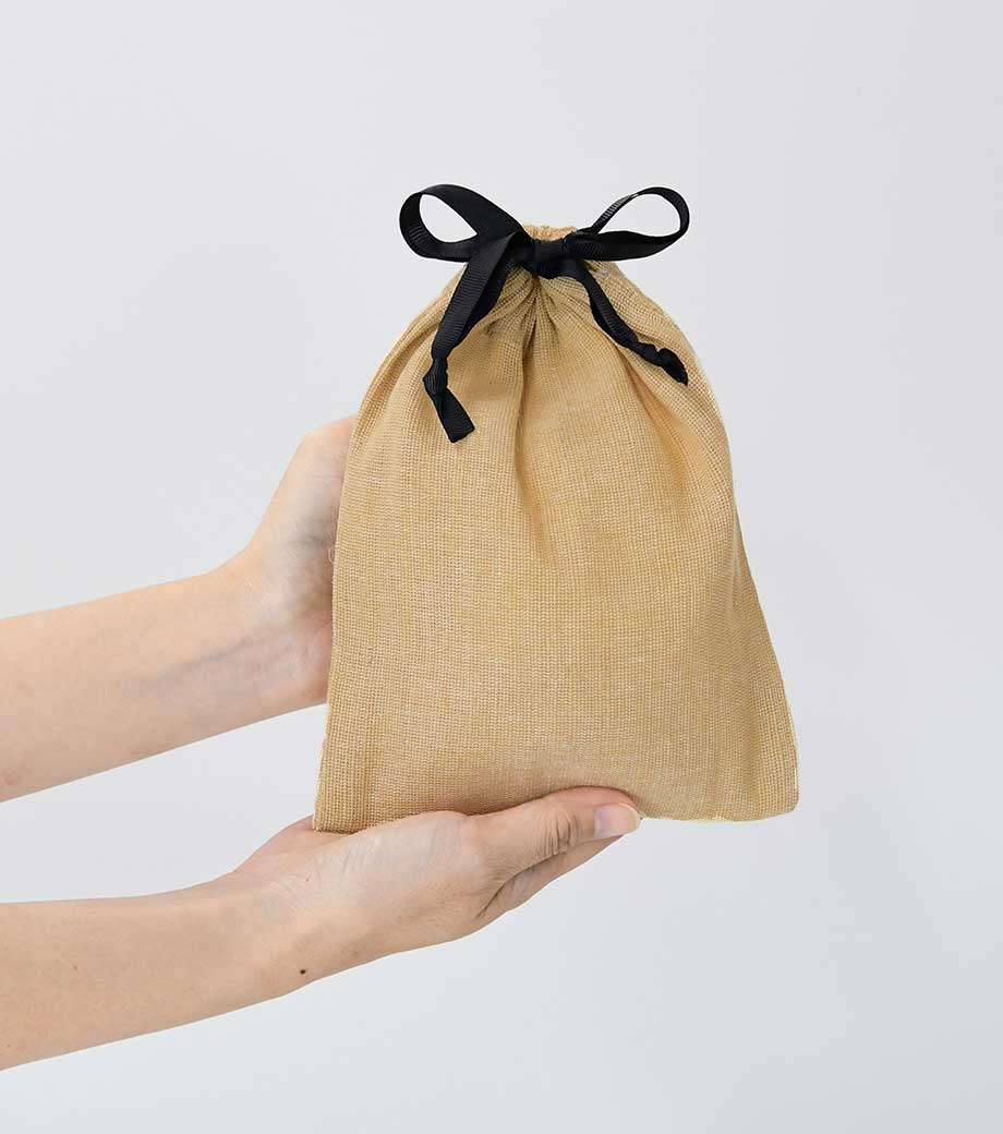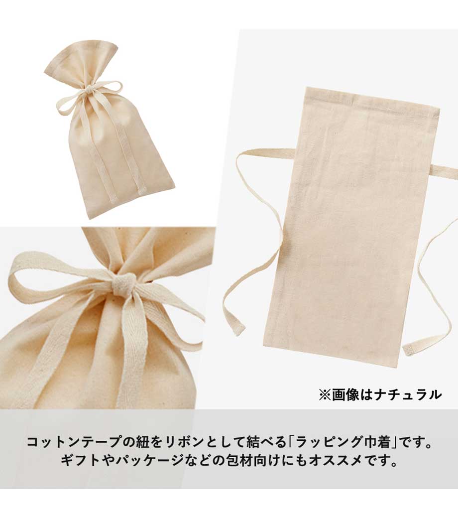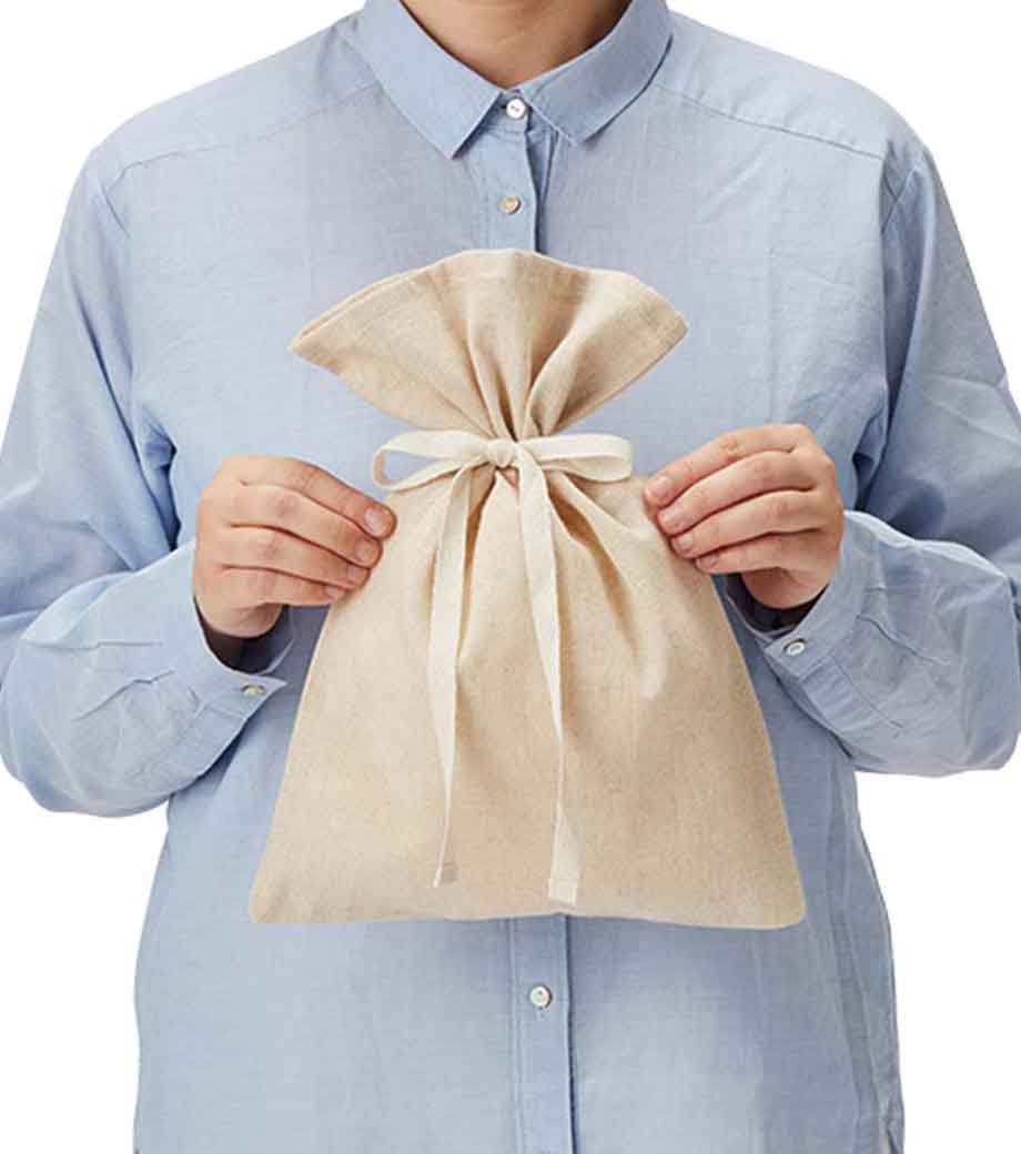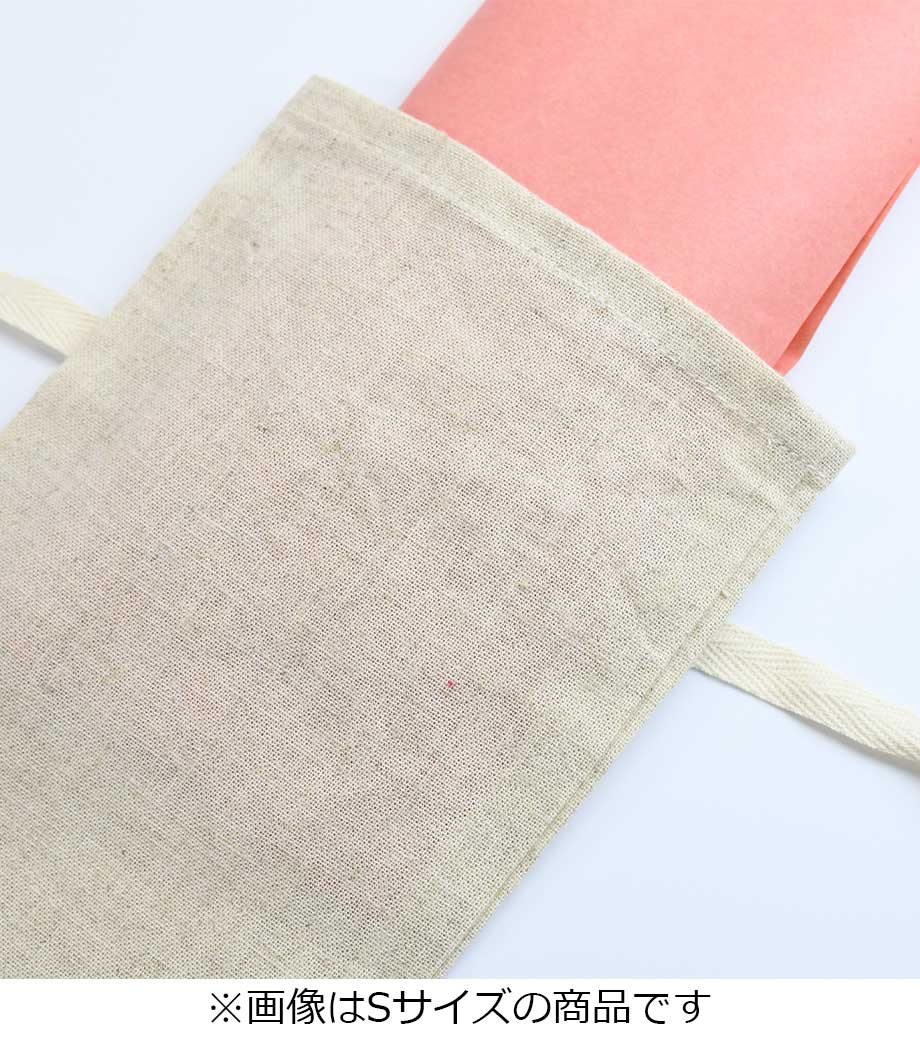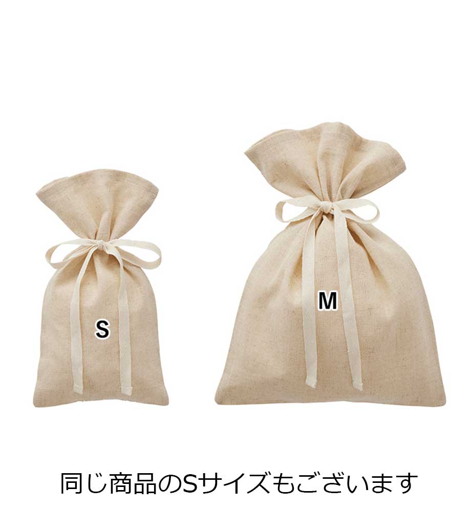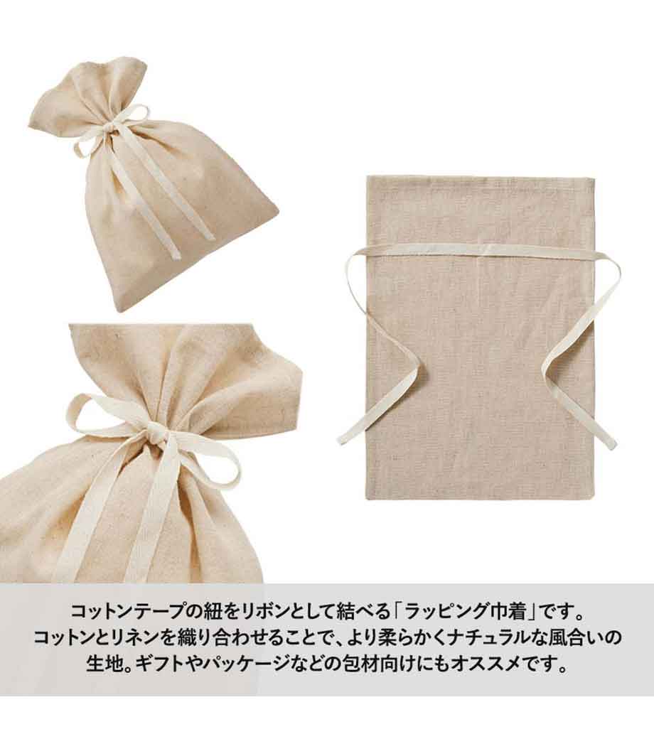 コットンリネンラッピング巾着(M)は、ナチュラルな素材感がおしゃれなラッピング資材。コットンの柔らかさと、通気性に優れたリネンの爽やかさを兼ね備えています。コットンテープをリボンのように結べば、可愛らしいギフトラッピングに。300ml程度のボトルが入るサイズ感で、箱入りの雑貨も入れやすいです。