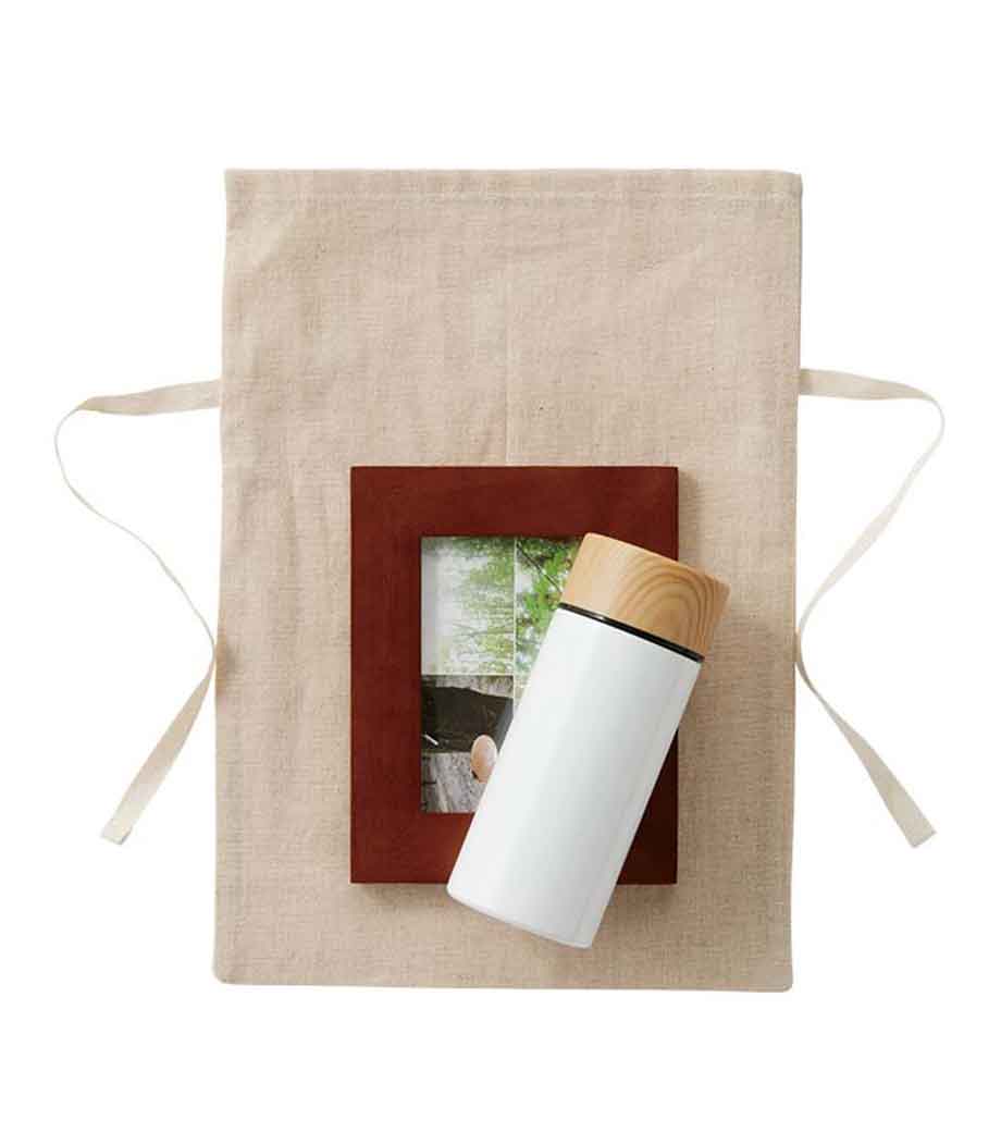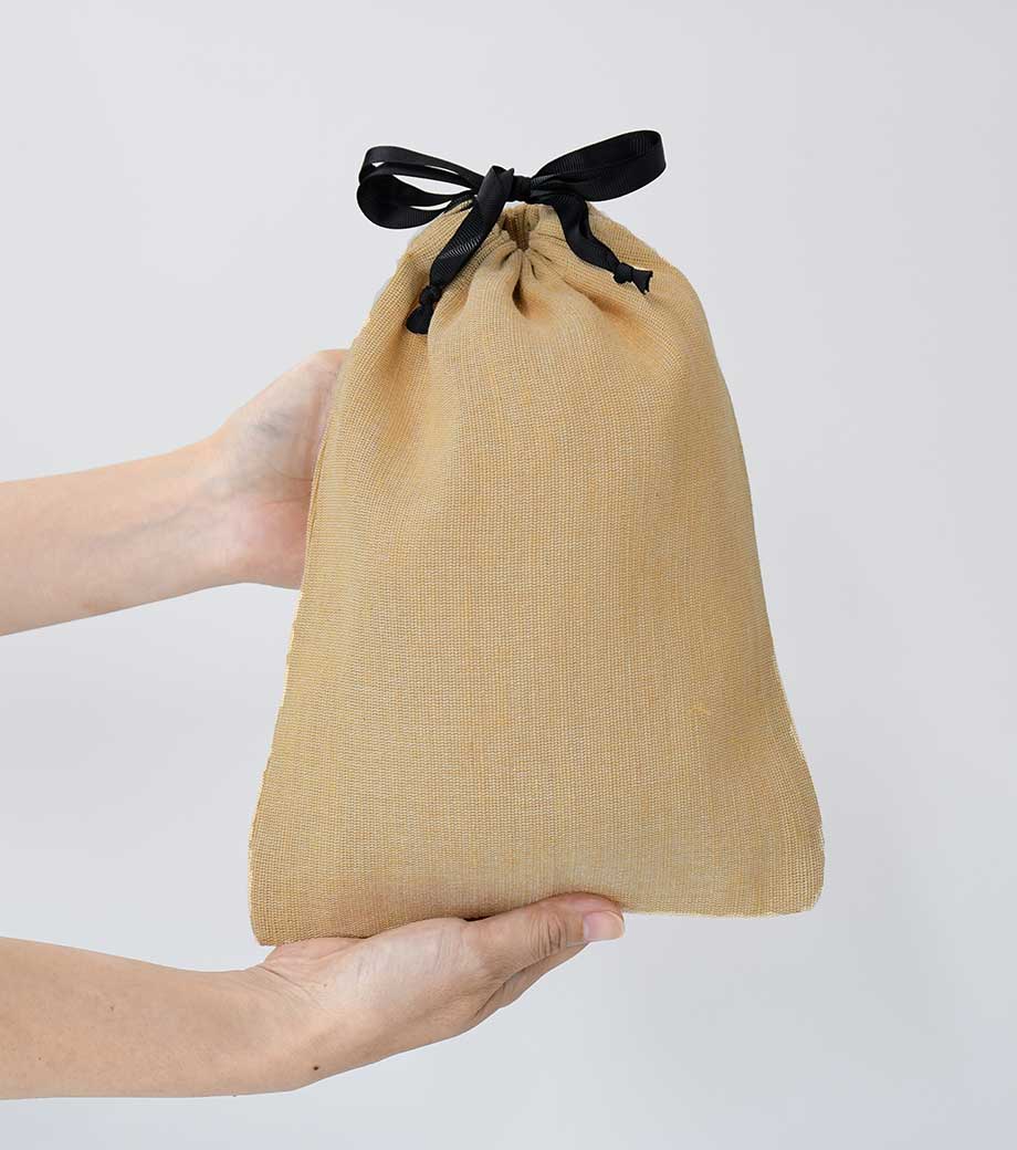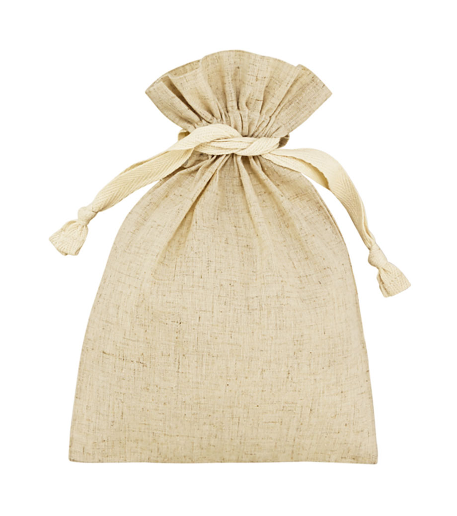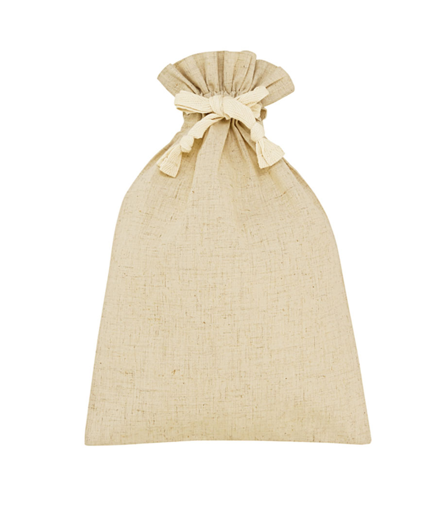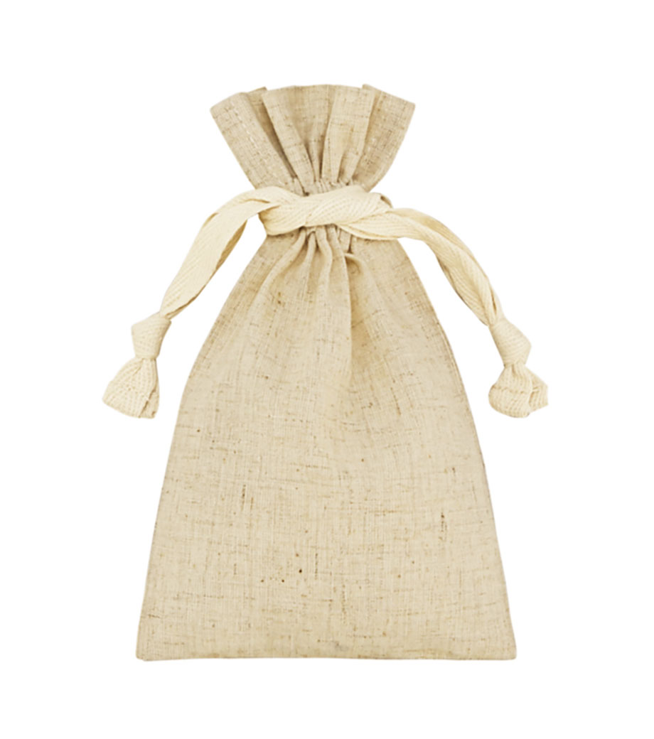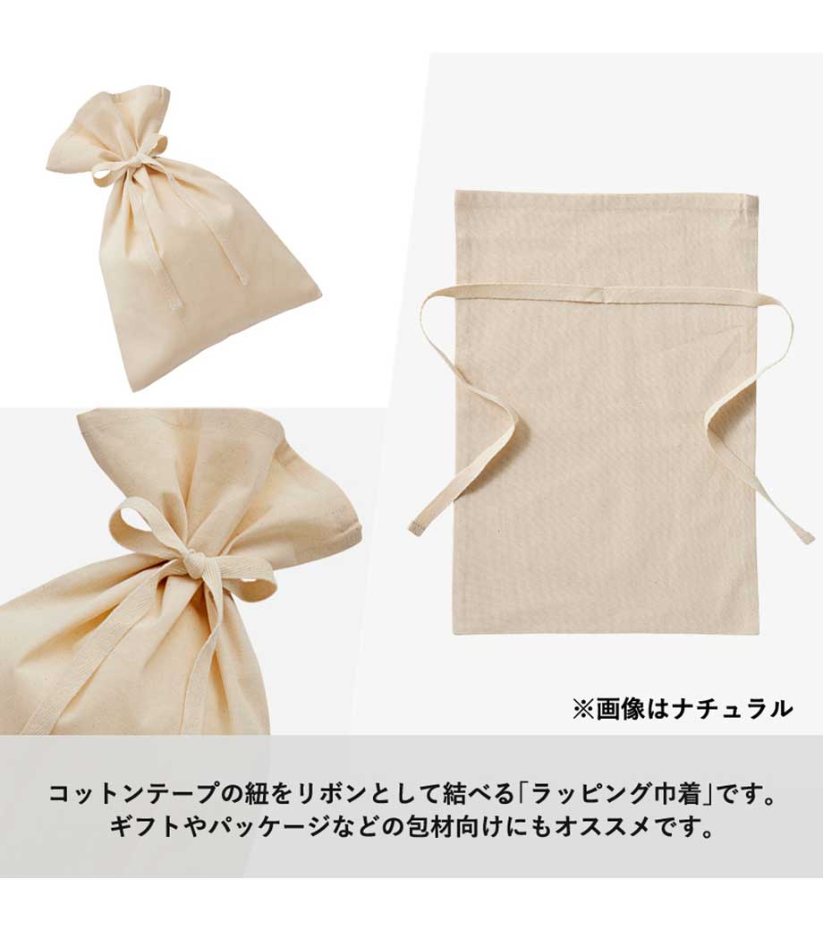 コットンリネンラッピング巾着(M)は、ナチュラルな素材感がおしゃれなラッピング資材。コットンの柔らかさと、通気性に優れたリネンの爽やかさを兼ね備えています。コットンテープをリボンのように結べば、可愛らしいギフトラッピングに。300ml程度のボトルが入るサイズ感で、箱入りの雑貨も入れやすいです。