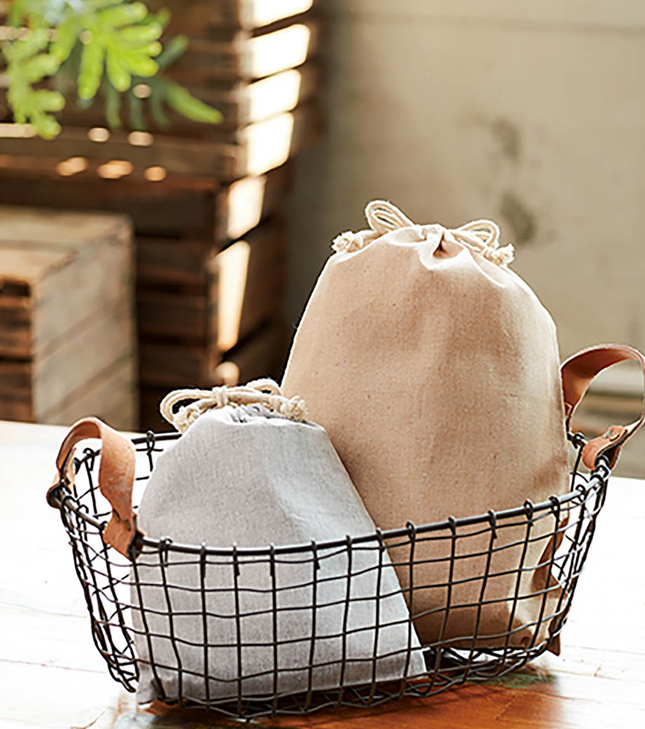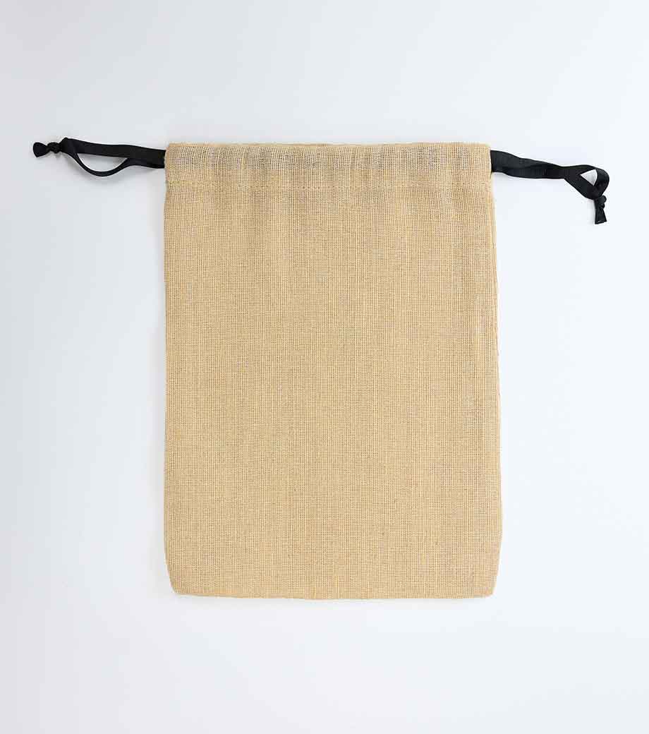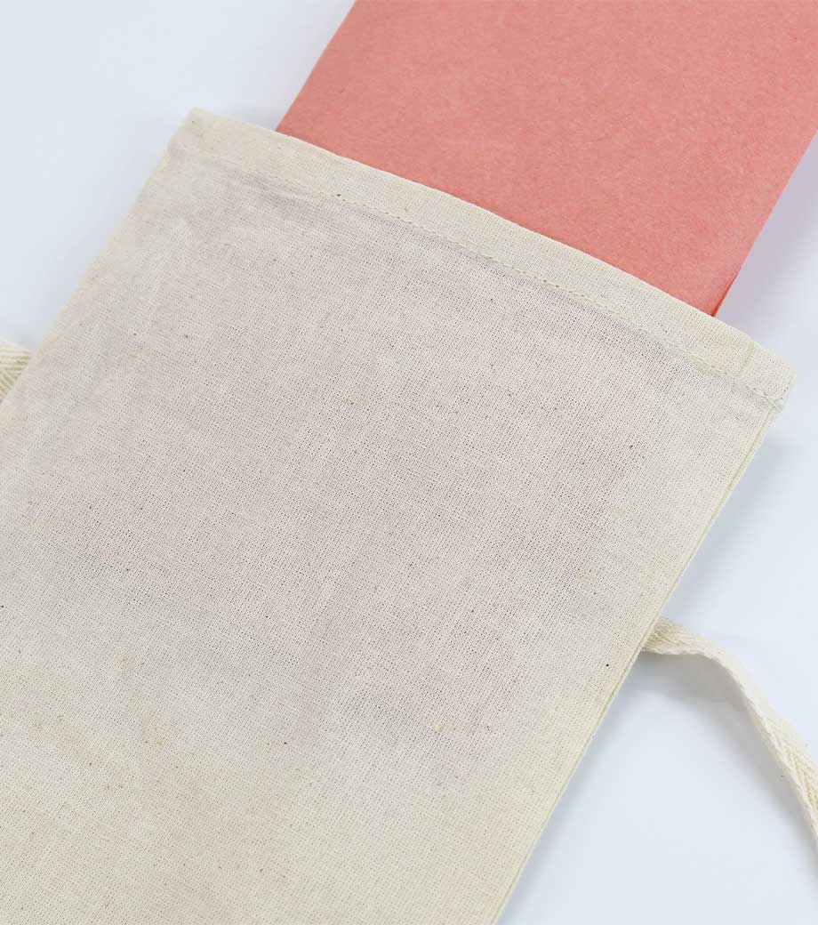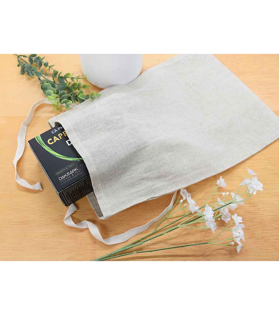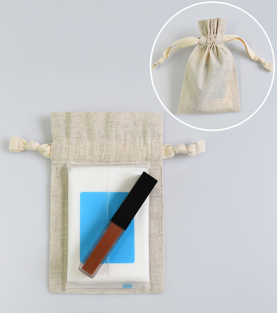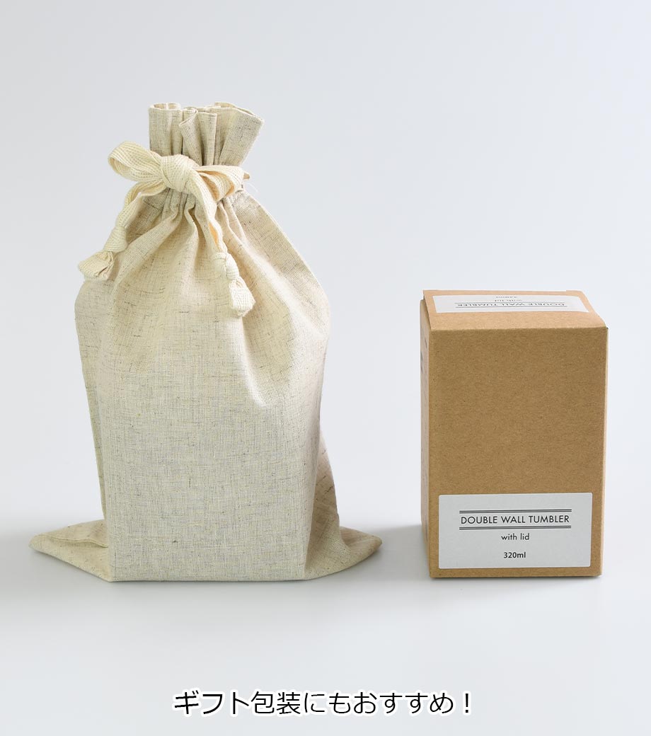 コットンリネンラッピング巾着(M)は、ナチュラルな素材感がおしゃれなラッピング資材。コットンの柔らかさと、通気性に優れたリネンの爽やかさを兼ね備えています。コットンテープをリボンのように結べば、可愛らしいギフトラッピングに。300ml程度のボトルが入るサイズ感で、箱入りの雑貨も入れやすいです。