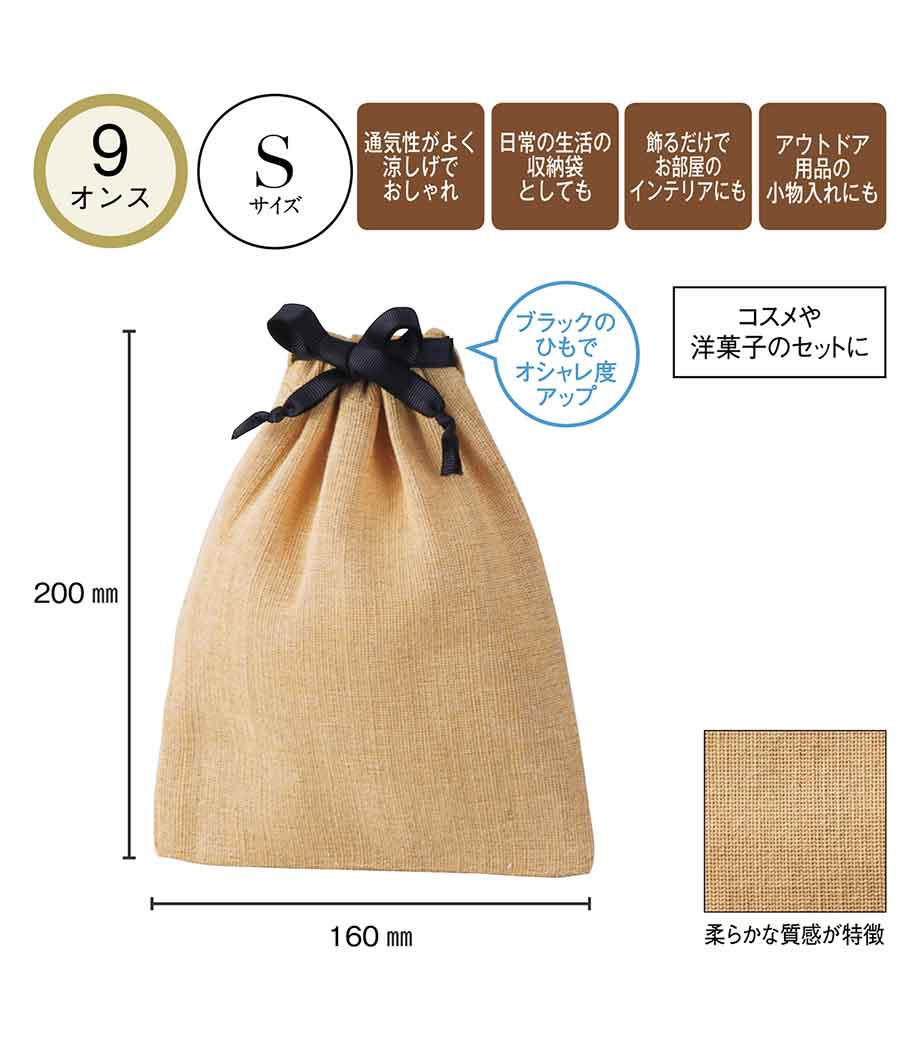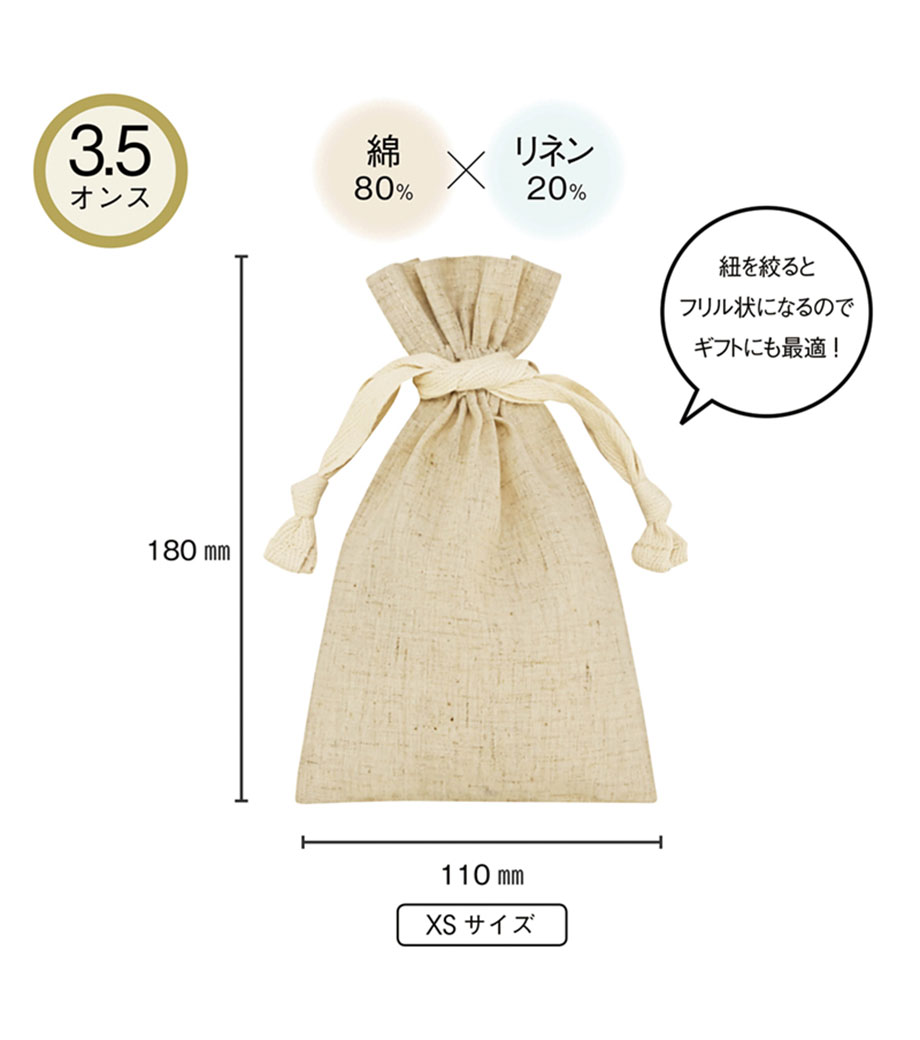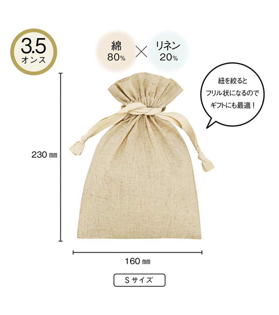 コットンリネン巾着(S)は、リネンとコットンを掛け合わせた、ナチュラルテイストの巾着袋です。