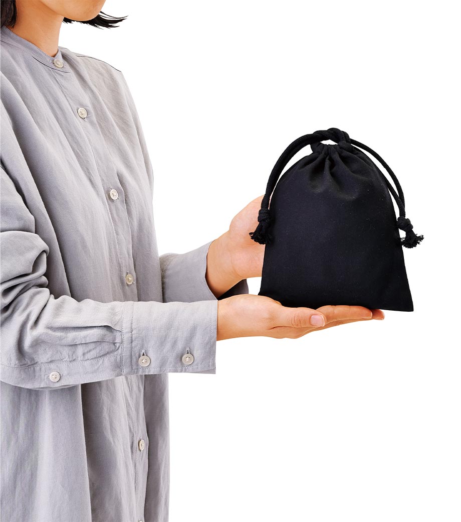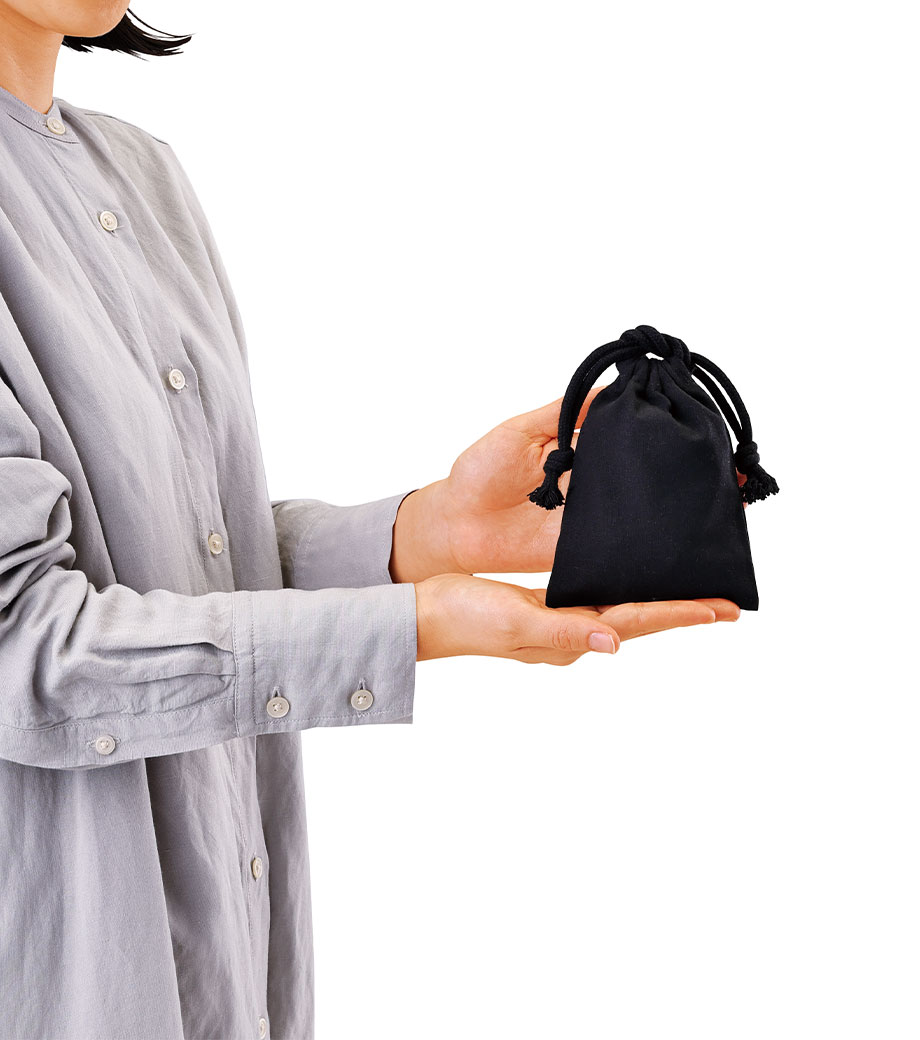 コットン巾着(SS)は、手のひらサイズの使いやすいシンプルな巾着です。ちょこんと可愛らしい小さめの巾着は、かさばらないので小物の持ち歩きに最適です。アクセサリーやコスメ、充電コードなど細かい物の収納にとっても便利。コットン素材なのでナチュラルな風合いとやさしい手触りも魅力的です。シンプルなので男女問わず使いやすいのもポイントです。ナチュラル、ネイビー、ブラックの人気の3色から選べます。