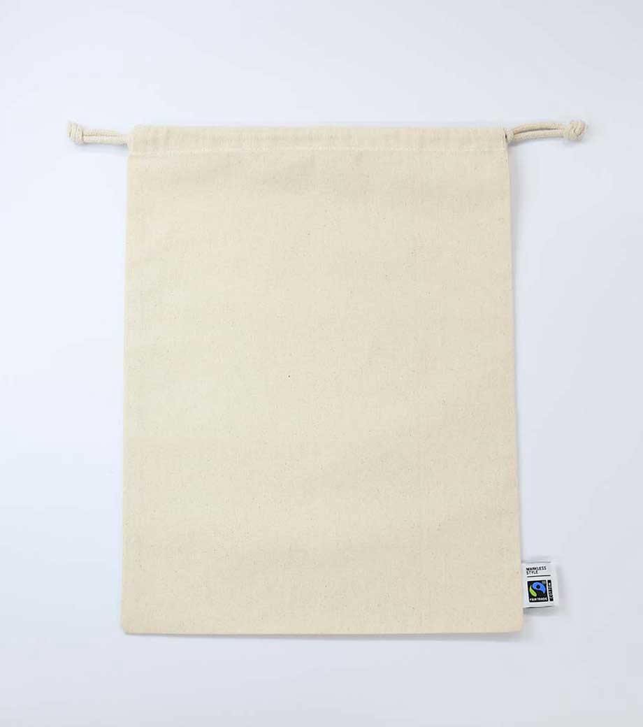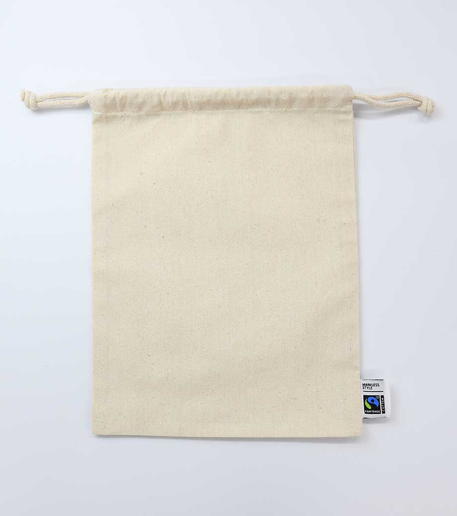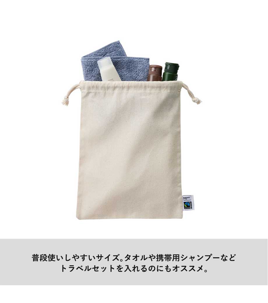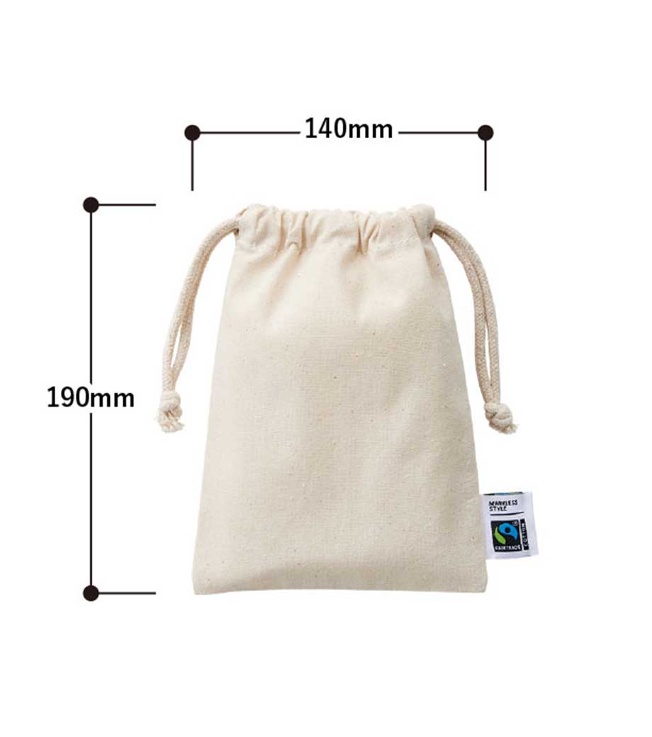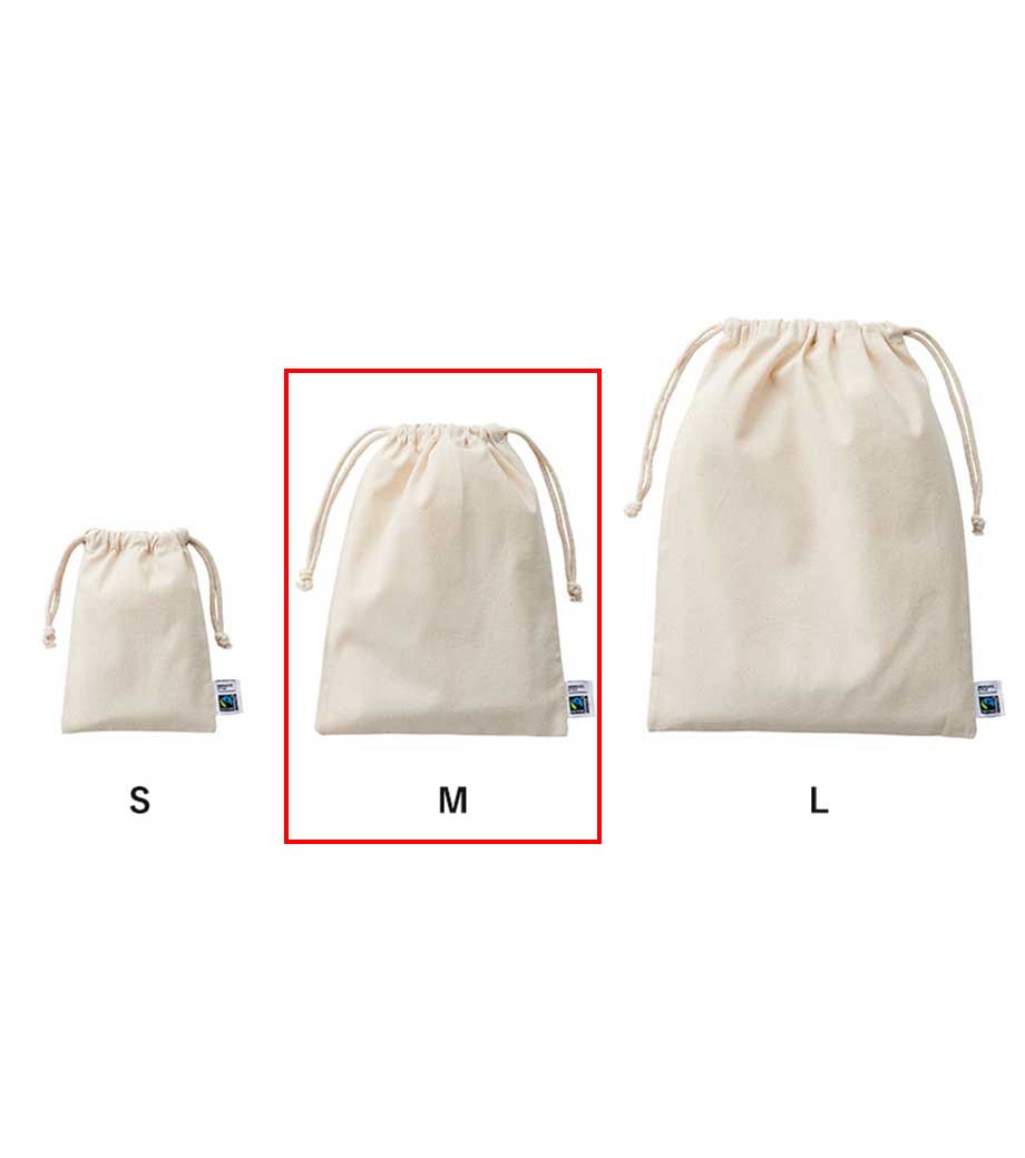 フェアトレードコットン巾着(M)は、国際フェアトレード認証ラベル付きの巾着です。B5より若干大きめで、旅行やスポーツなど荷物の仕分けに使いやすいサイズです。ナチュラルな風合いでハリのあるコットン素材。紐をぎゅっと絞って使うシンプルな巾着は年代性別問わず使いやすいのもポイントです。