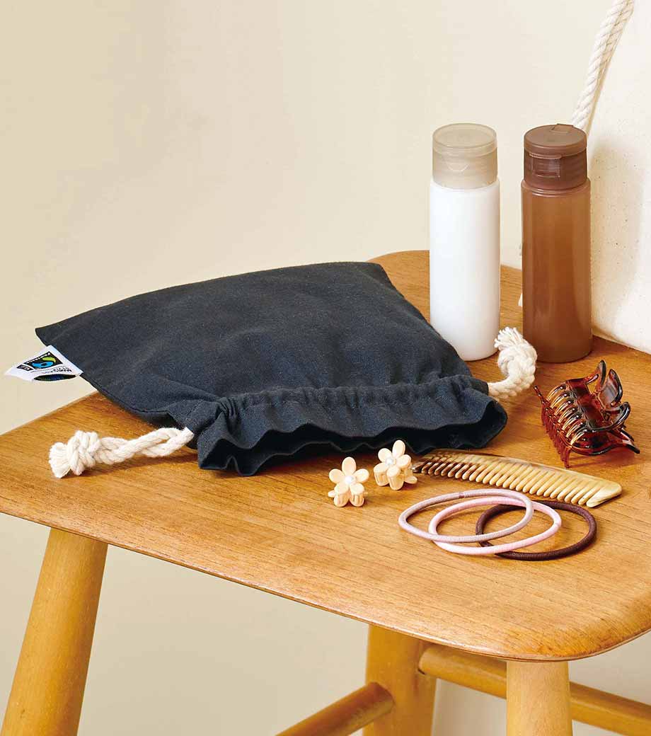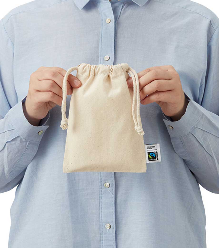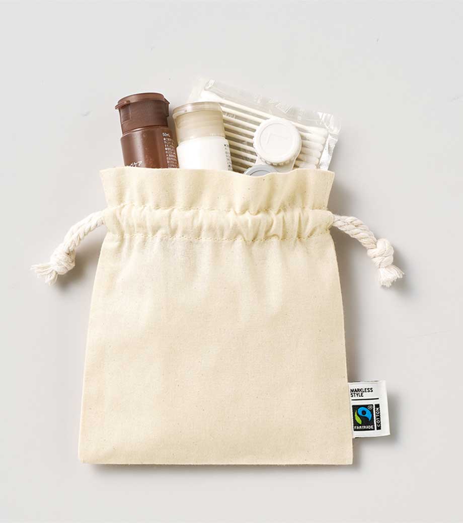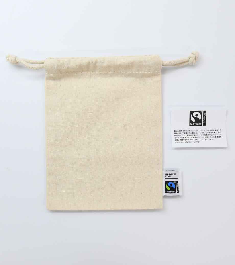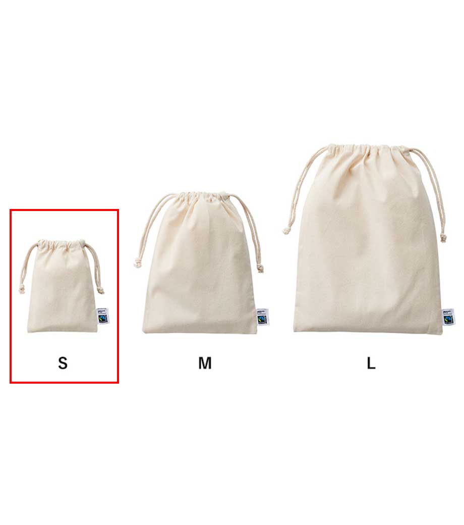 フェアトレードコットン巾着(S)は、国際フェアトレード認証ラベル付きの巾着です。ぱっと見てすぐにフェアトレード商品とわかるラベルなので、SDGsへの取り組みをアピールできます。文庫本がすっぽり入るサイズ感は小物入れに最適。お菓子やおにぎり、コップや歯磨きセット入れなど様々な用途で使えます。普段持ち歩く小物を入れればバッグの中が整頓されますよ。ナチュラルな風合いでハリのあるコットン素材。シンプルなので年代性別問わず使いやすいのもポイントです。