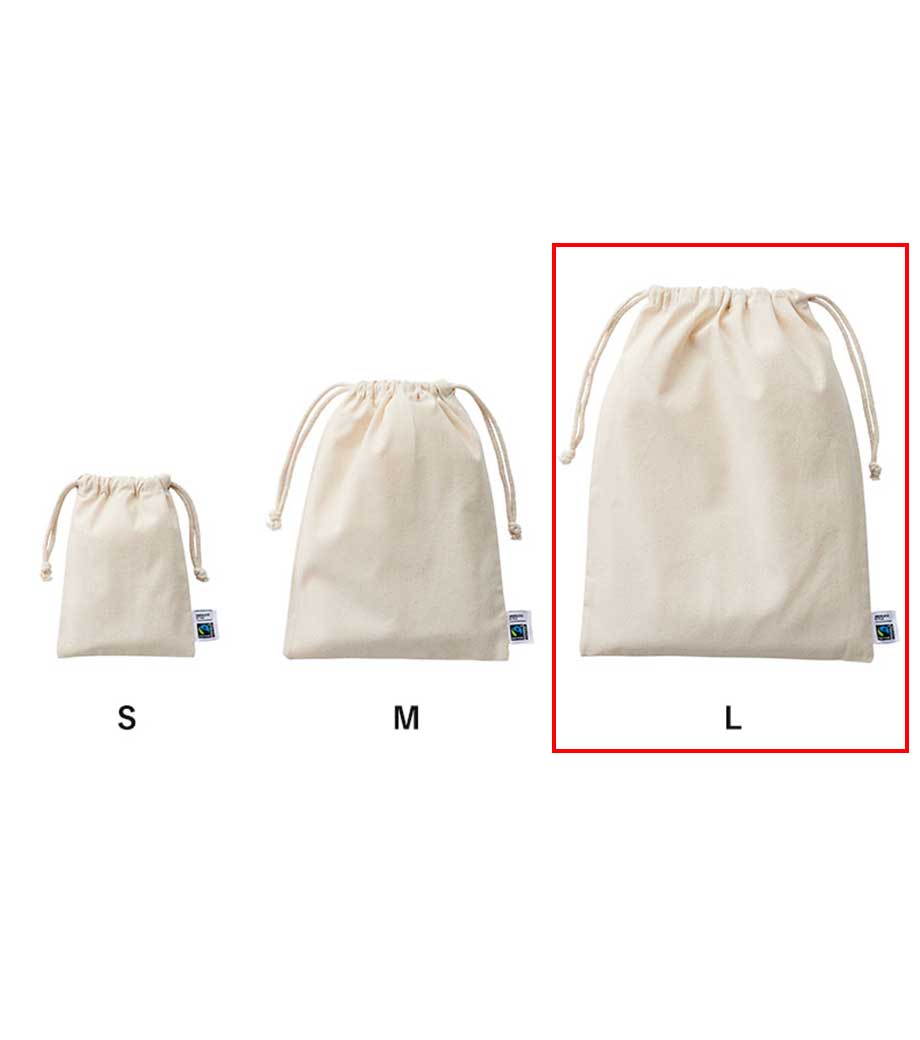 フェアトレードコットン巾着(L)は、国際フェアトレード認証ラベル付きの巾着です。スポーツ時の室内履きも余裕で入るサイズ感。旅行やスポーツなど荷物の仕分けにあると便利な大きさです。ナチュラルな風合いでハリのあるコットン素材。シンプルなので年代性別問わず使いやすいのもポイントです。