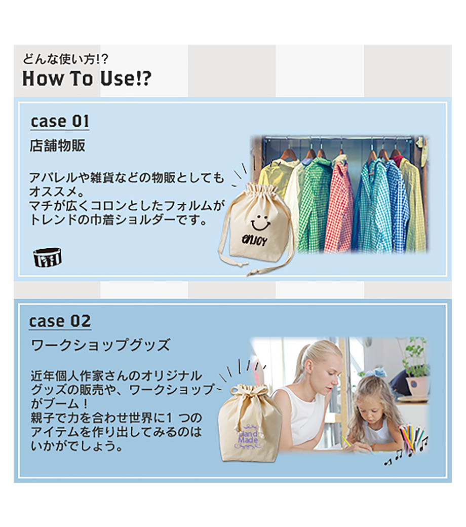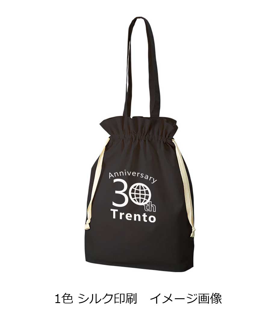 「厚手コットンガゼット巾着トート(M)」は、口がキュッと閉まる巾着タイプのトートバッグ。中身が外から見えないので、貴重品を入れても安心。持ち手も付いているので、通勤・通学のお弁当入れや、手軽なサブバッグにオススメです。数日の出張や旅行の際に衣服を入れてキャリーバッグにしまえば、コンパクトに荷物をまとめられますよ。記念品としてだけではなく、服飾雑貨店や海外輸入食品店などのショッパーとしてもご利用いただけます。