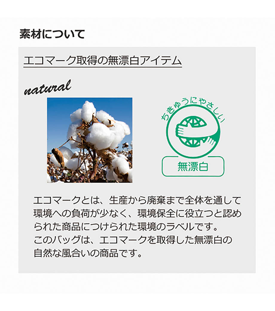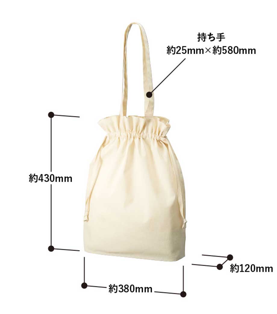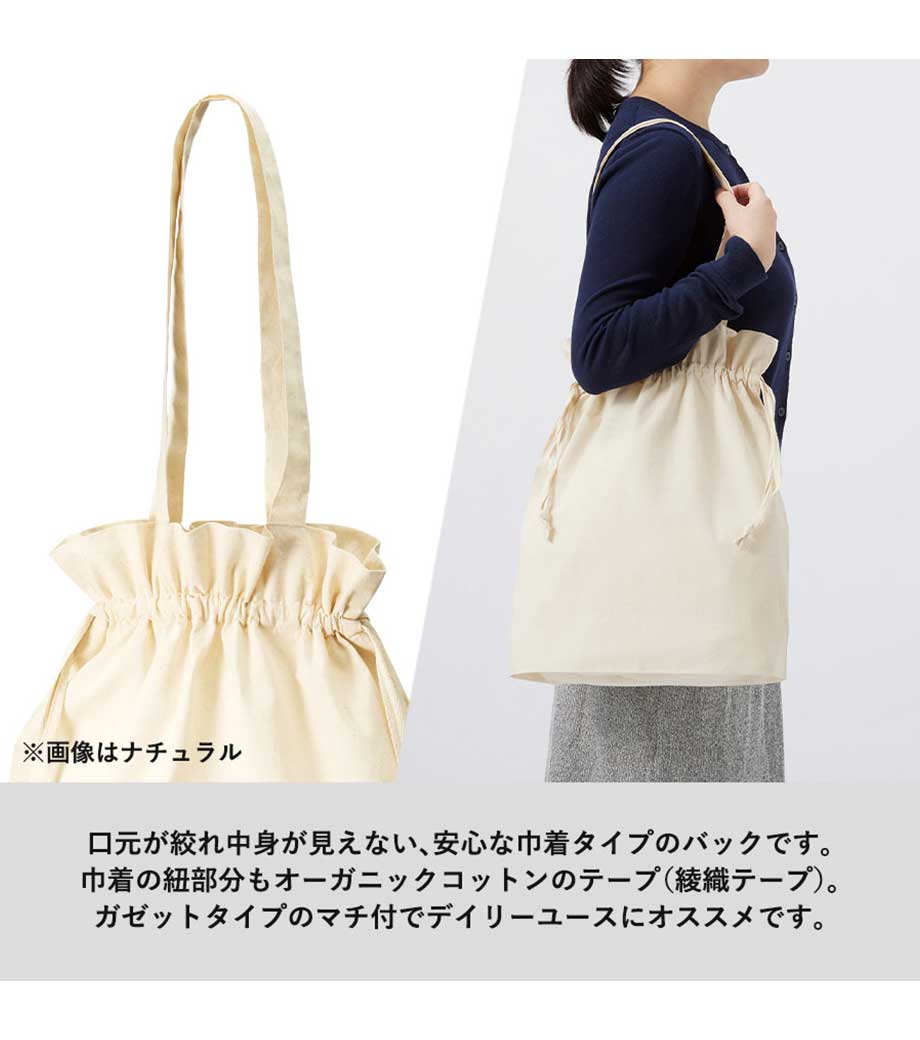 「コットンエコ巾着」は、口がキュッと閉まる巾着タイプのトートバッグ。通勤・通学のお弁当入れや、手軽なサブバッグにいかが。地球環境にやさしい無漂白コットンを使い、ナチュラルな風合いに仕上げました。