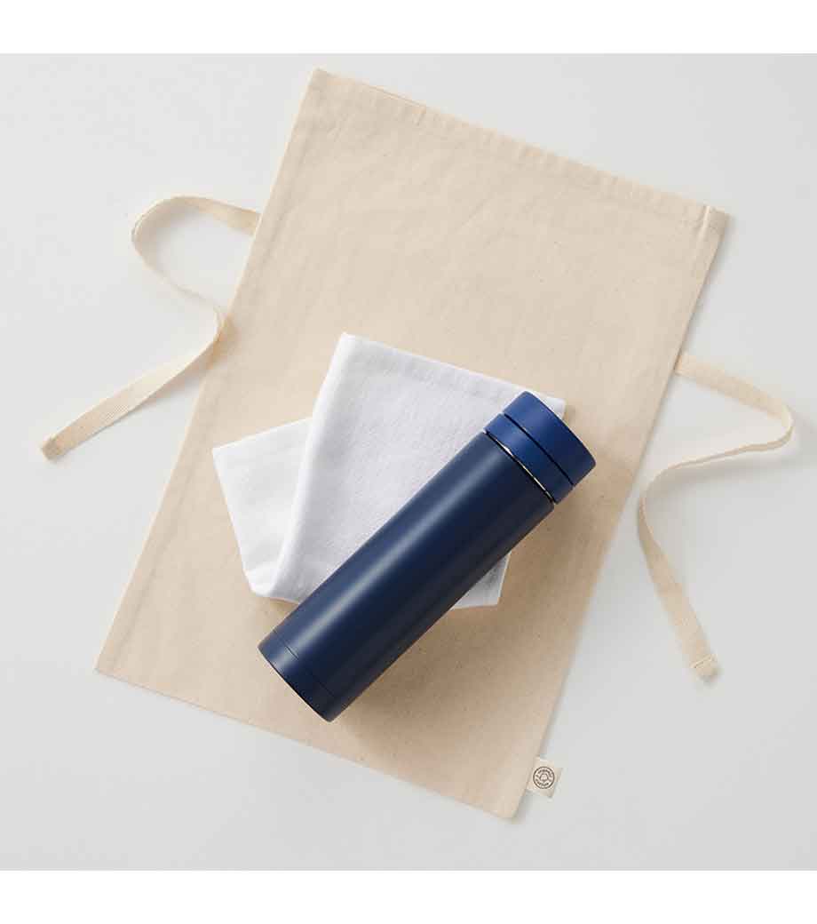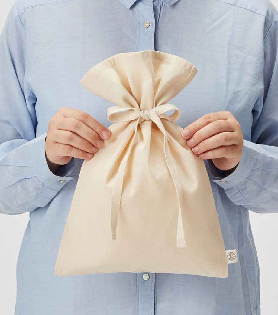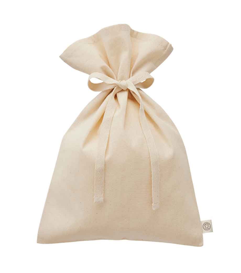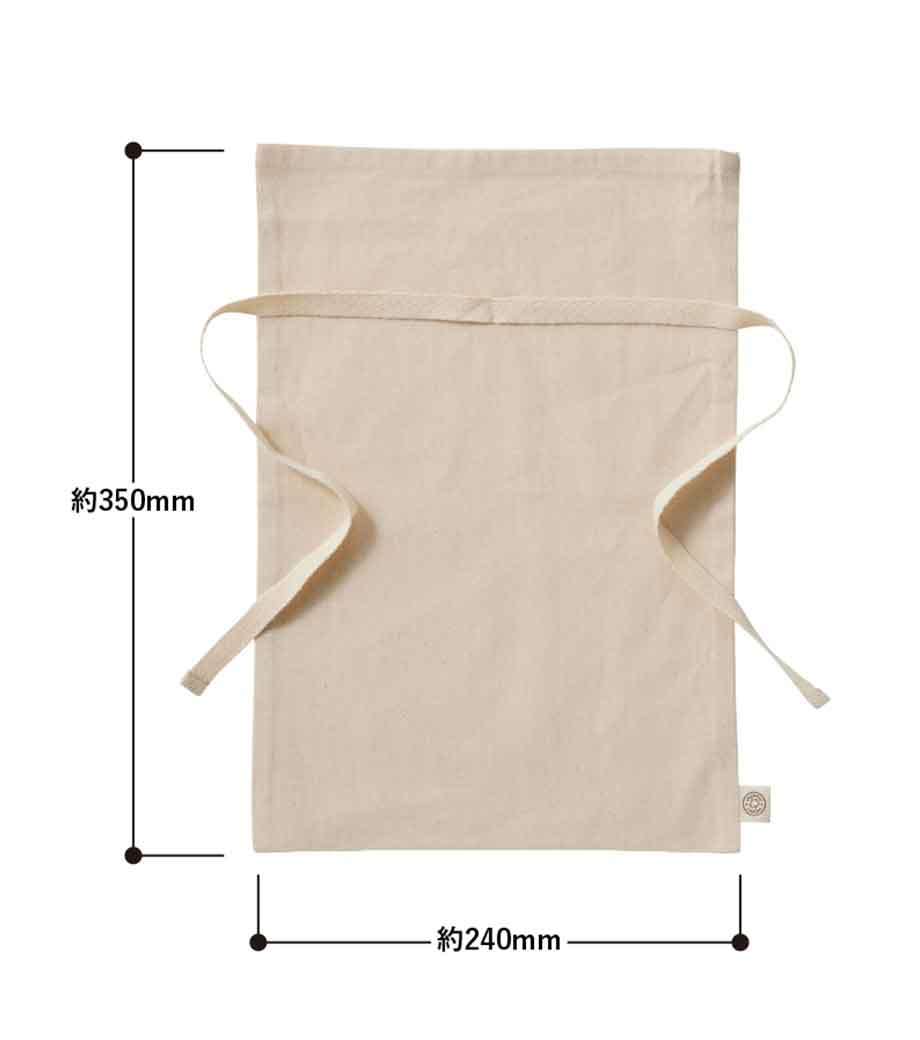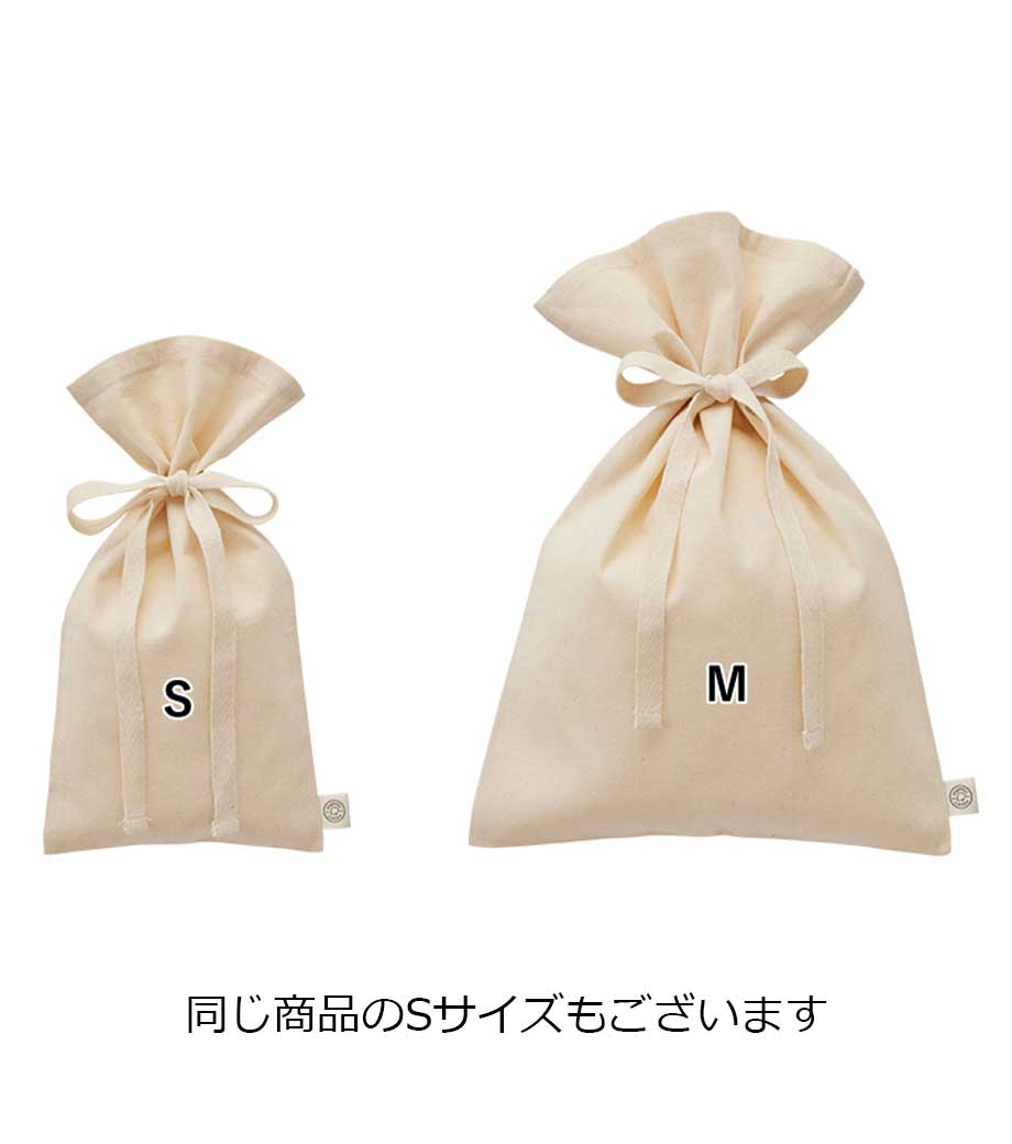 オーガニックコットンラッピング巾着(M)は、有機農法で育てられたエコな素材のラッピング用品。環境に配慮して作られた、SDGsの目標に貢献できるノベルティです。コットンテープの紐を結ぶだけで、可愛らしくおしゃれなギフトに。300ml程度のボトルが入るサイズ感で、箱入りの記念品を包むのにもおすすめです。