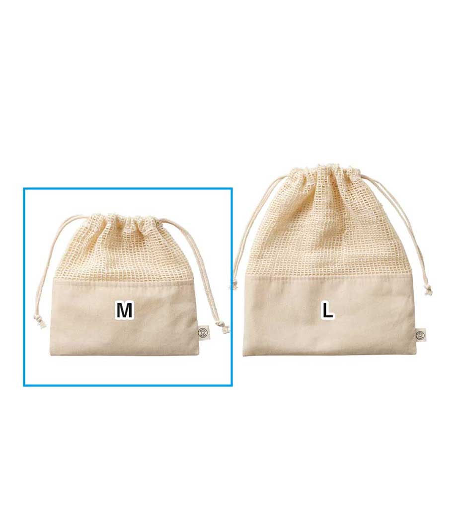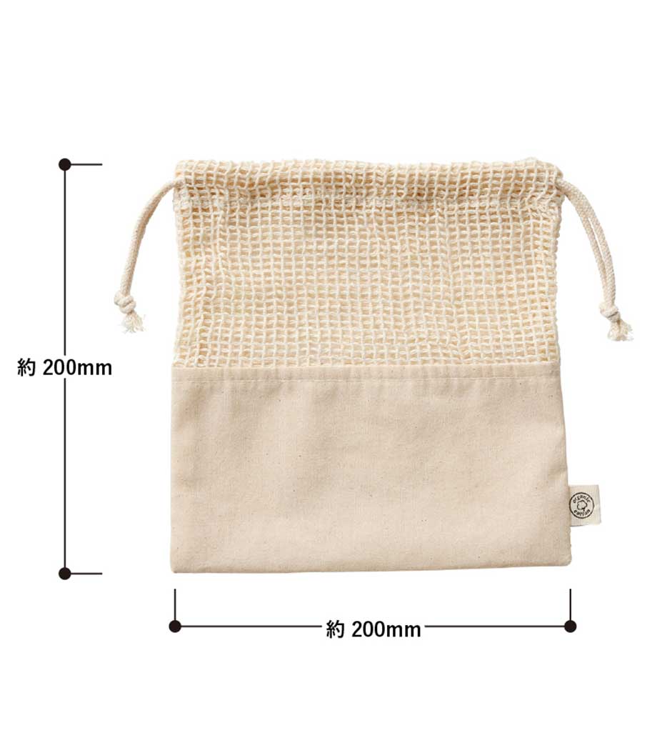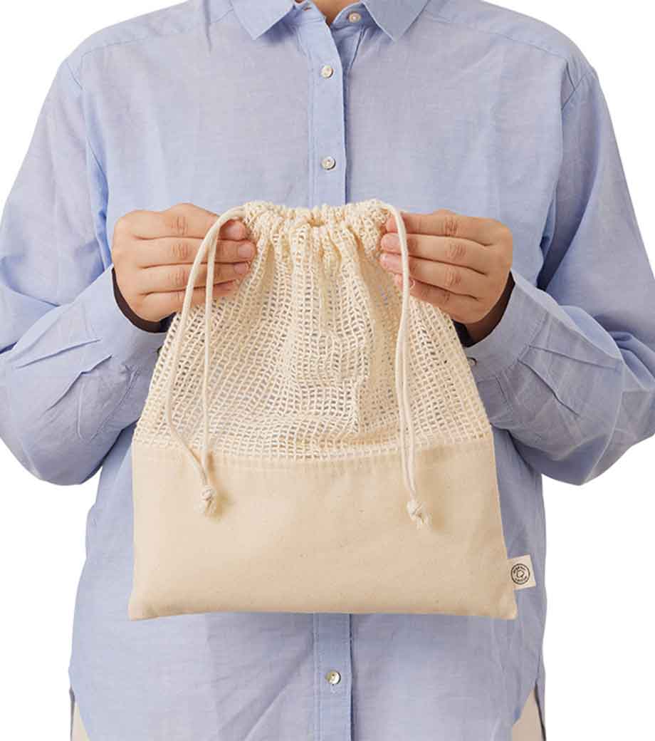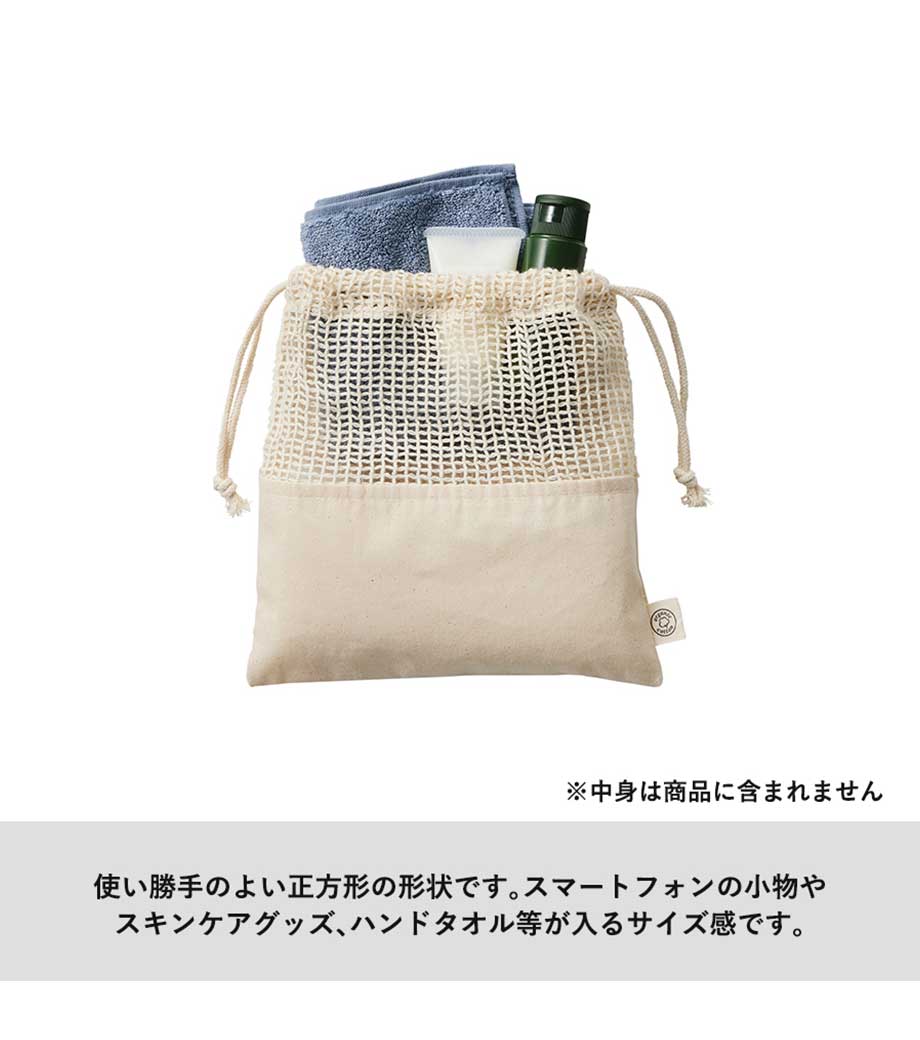 オーガニックコットンネット巾着(M)はすべての生地にオーガニックコットンを使用。SDGsに関心が高まっている今、おすすめのノベルティです。