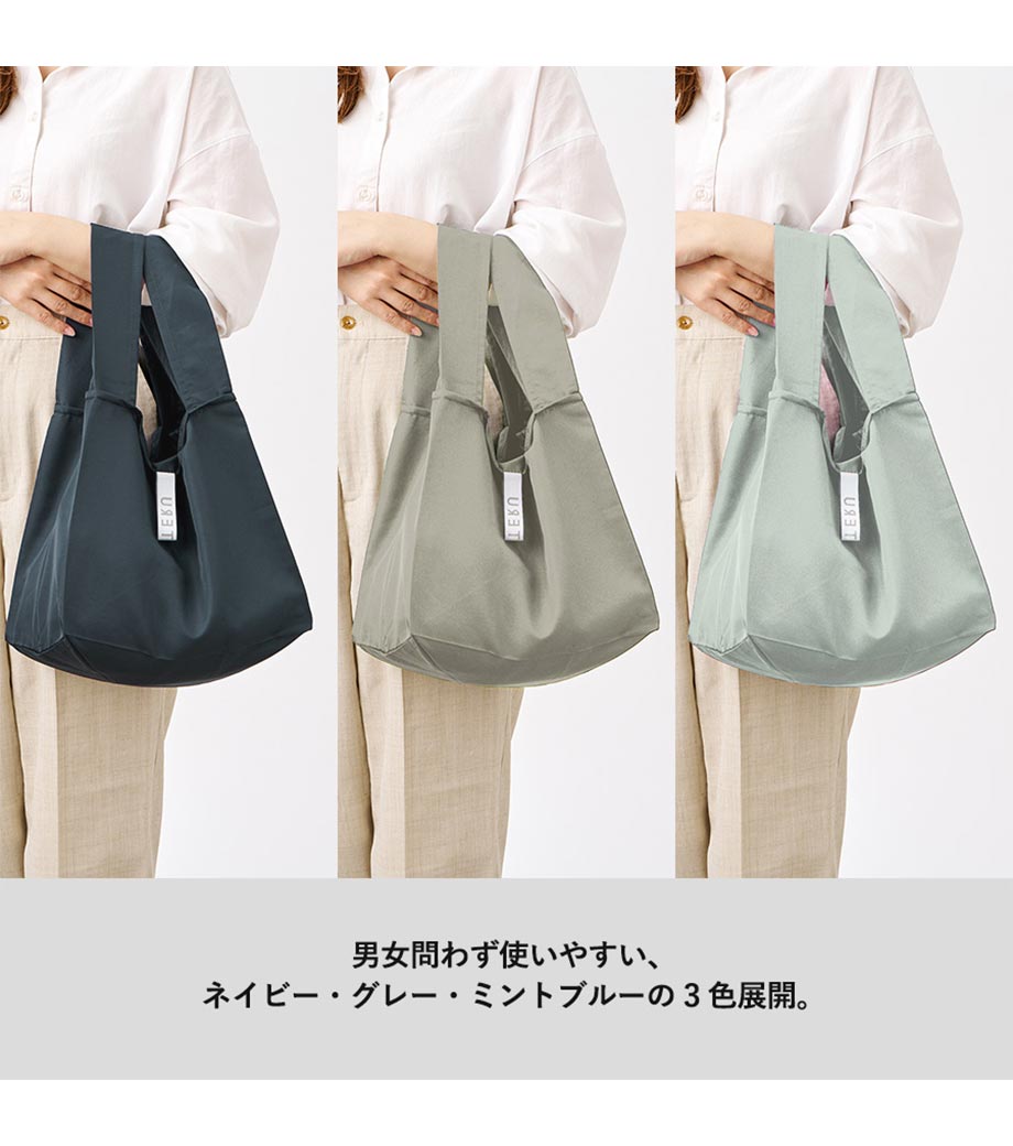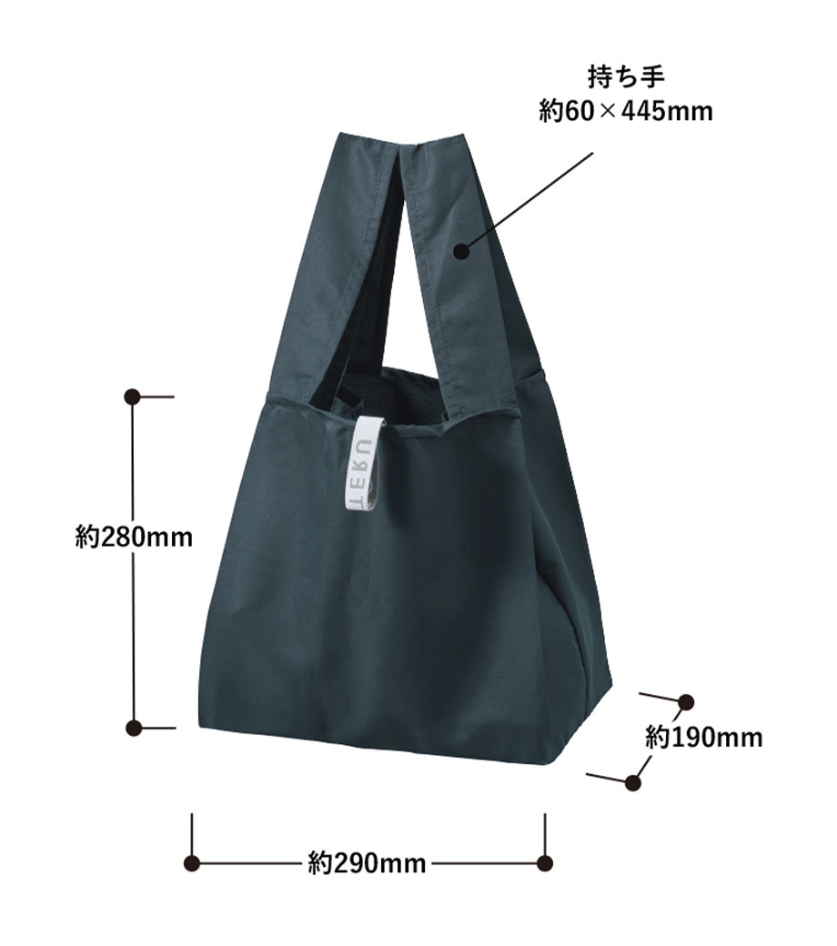 再生ペットボトルを100%使用して作られたエコバッグです。市販のお弁当もそのまま入れやすいマチ広仕様で、ランチタイムや仕事帰りのお買い物で活躍します。使用後は洗濯できるので衛生的です。ふわっとやわらかめの生地で折りたたみやすく、付属のゴムバンドでくるっとまとめてコンパクトに持ち運べます。