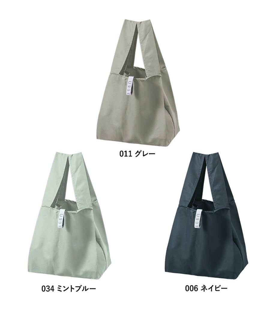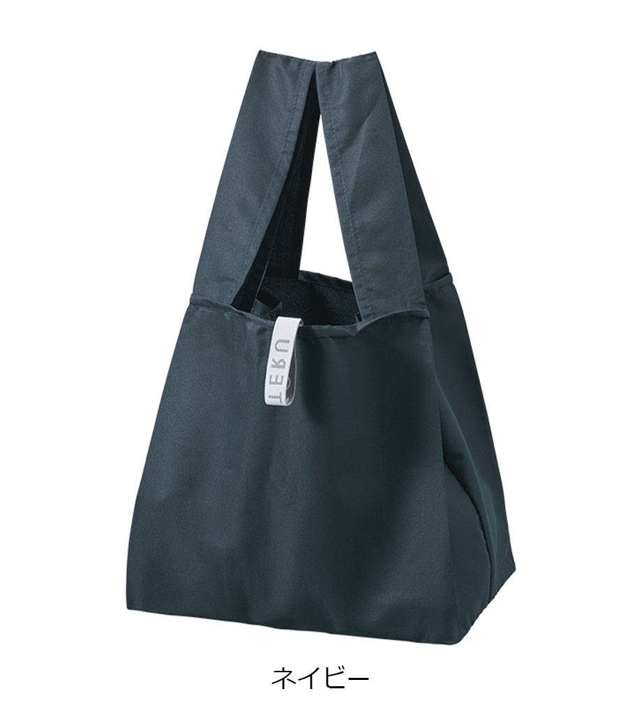 テラッソ/再生PETマルシェエコバッグは使用済みペットボトルから生産されたエコバッグです。柔らかな生地で広めの持ち手だから肩掛けが楽チン!沢山お買い物した時も安心です。使わないときは折りたたんで内側のゴムバンドで固定。ゴムバンドには「RE:USE」の文字が入っていて、SDGsのアピールにもなります。