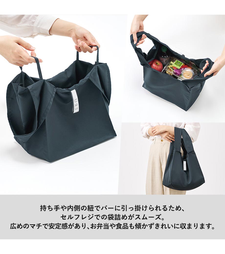 レジかごにセットできる大容量の保冷バッグ。スーパーなどでの会計時、カゴにセットすれば移し替える手間なしでお買い物ができます。使わない時は小さく畳んで付属のゴムバンドでコンパクトに。袋口は巾着タイプで中身の飛び出しを防ぎます。肩掛けできる持ち手で、荷物が重くなっても安心です。