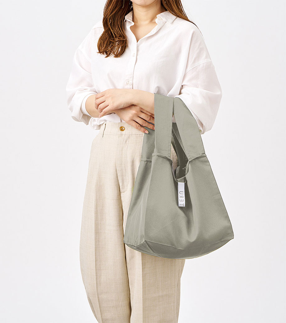 【MOTTERU】クルリト デイリーバッグ newカラーはオリジナル印刷ができるエコバッグ。しっとりとしたなめらかな触り心地で、シワが戻りやすくキレイなまま使えます。クルリとたためば手のひらサイズのコンパクトに。折り畳み用のゴムバンドは縫い付けられているので無くす心配がありません。レジ袋型でかさばる荷物もすっきり収納。一度使うと他のエコバッグに戻れませんよ!