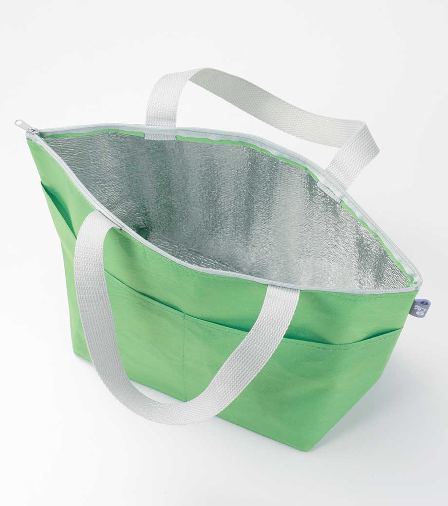 不織布保冷ビッグライントートは、保冷機能付きの大容量トート。不織布なのでバッグ自体は軽いのに、耐荷重は2Lのペットボトル約5本分の10kgという頼もしさ。内側はアルミ蒸着フィルム張りで保冷もバッチリ。ファスナー付きで中身が飛び出しにくいのもポイント。保冷剤を入れれば、少し遠くのスーパーでもたっぷりお買い物できます。アウトドアでも冷たい飲み物や食材を入れられ大活躍。