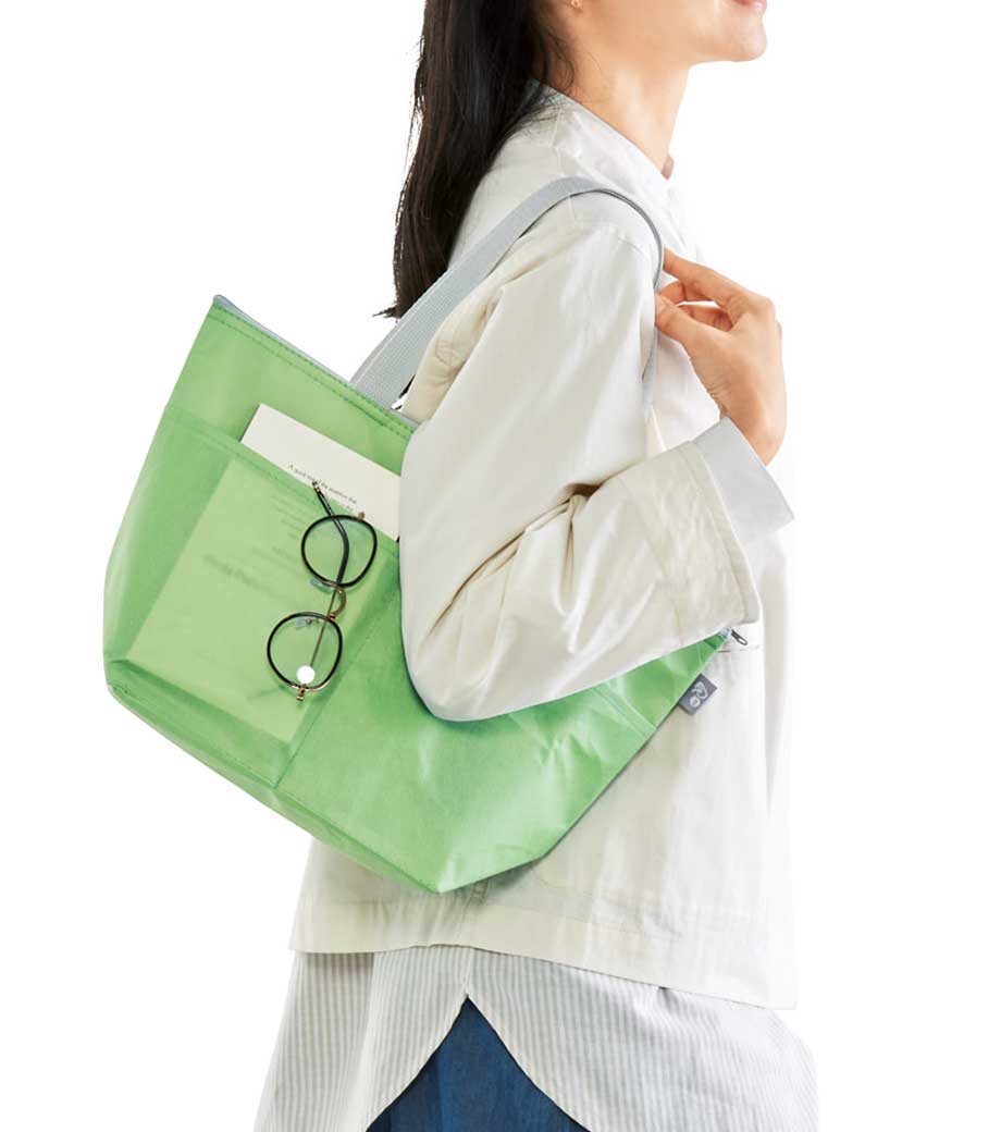 袋の口元をくるっと巻くだけで簡単に留められるマチ付き保冷温バッグ。お弁当箱が入るくらいのサイズ感でコンパクトに持ち運べます。表面は不織布生地で、内側は保冷温効果のあるアルミ蒸着フィルム張り。散歩やレジャーにサンドイッチやスイーツなどを入れて気軽に持ち運べます。