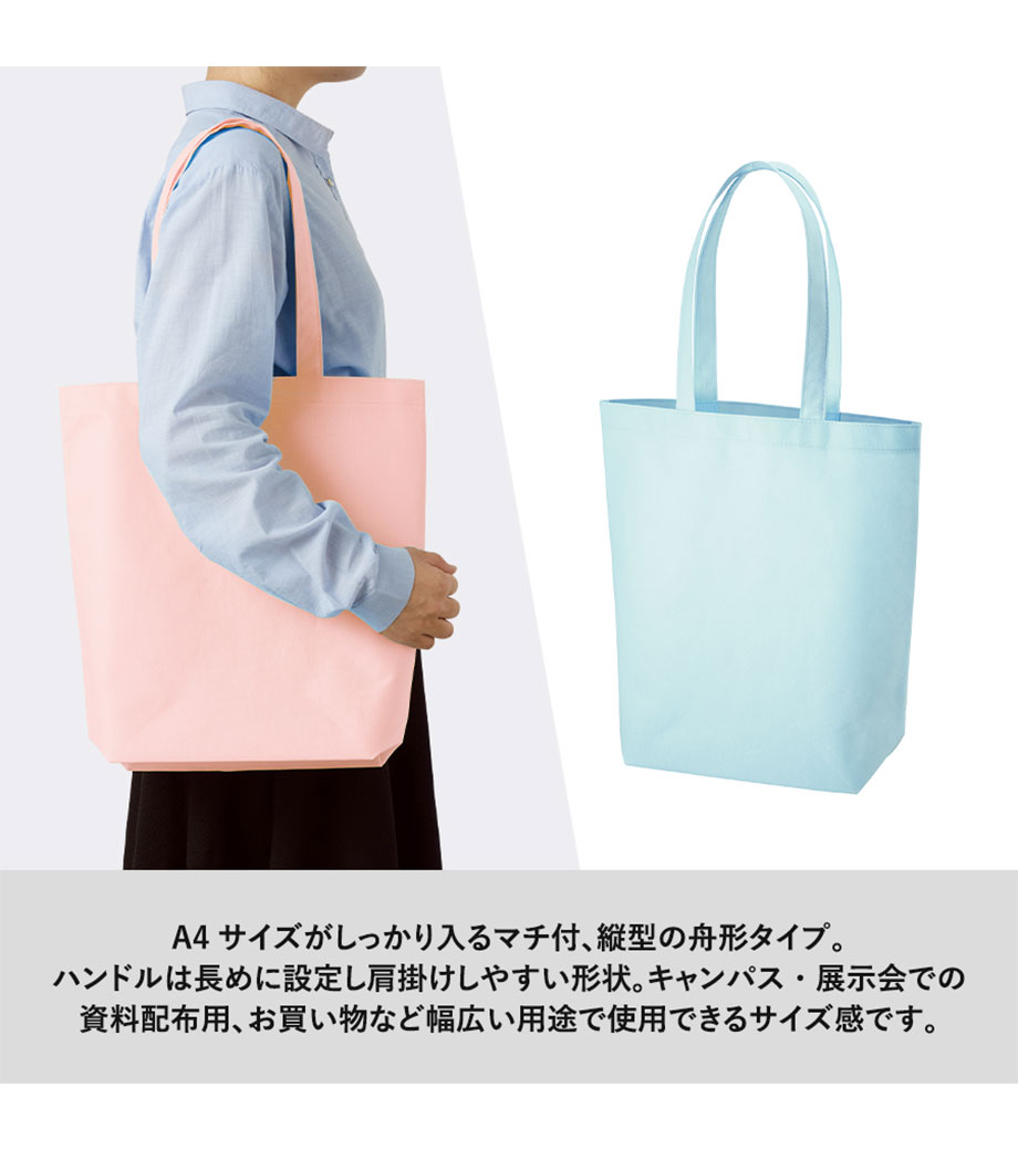 不織布バッグ(M)は、肩掛けしやすい縦型形状の不織布バッグ。舟形のマチ付きで、A4サイズの荷物も楽々入ります。ハンドル部分は長めになっているので、肩掛けしやすく荷物の出し入れも楽ちん!冊子などの資料が多くなりがちなオープンキャンパスや、展示会にピッタリのアイテムです。