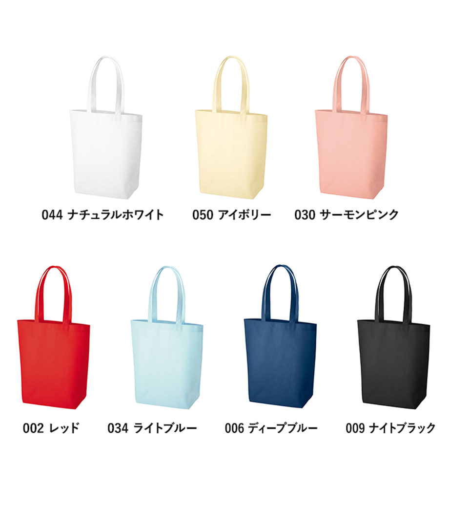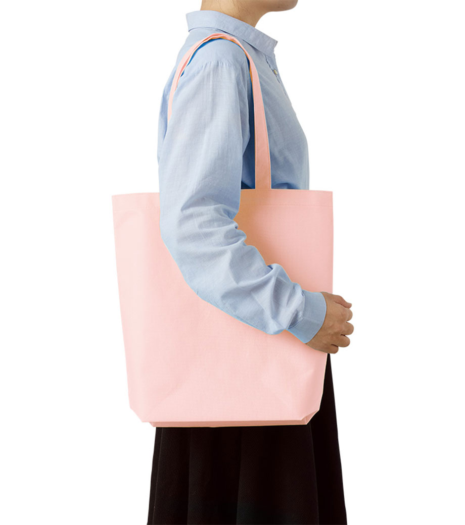 不織布とは、繊維を織らずに絡み合わせたシート状の素材。紙のように軽いうえ、紙より耐久性があるため、繰り返し使えるエコ素材として人気です。不織布スタンダードバッグは、使うシーンを選ばない定番トート。カラフルな色合いが楽しいバッグです。