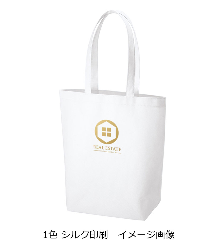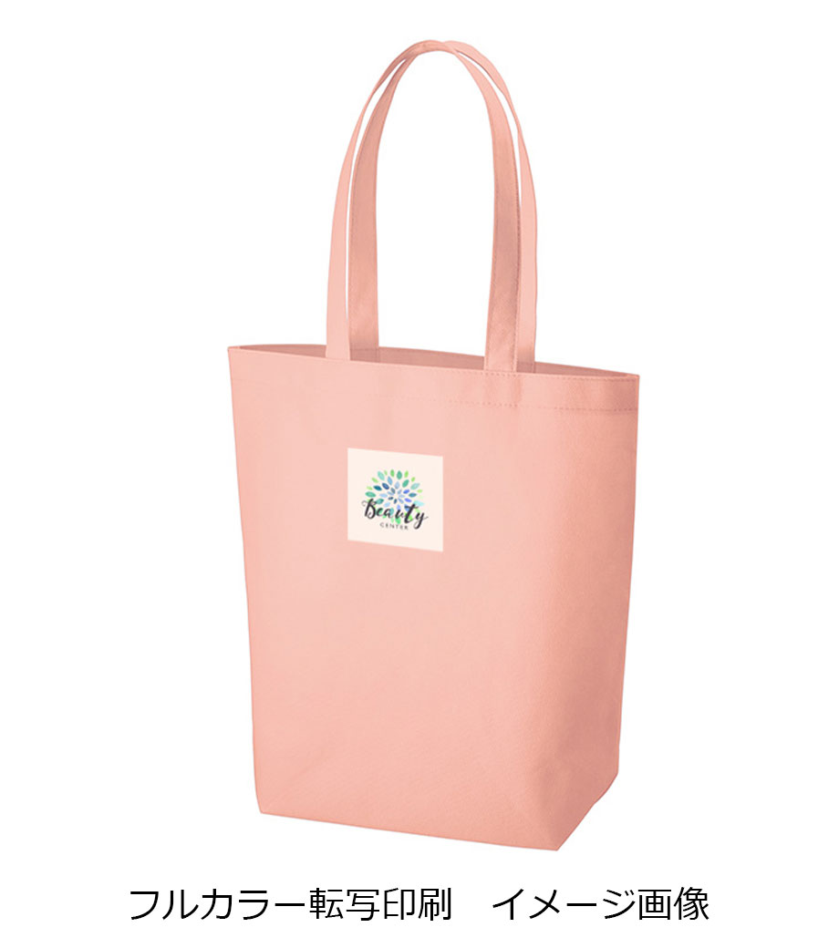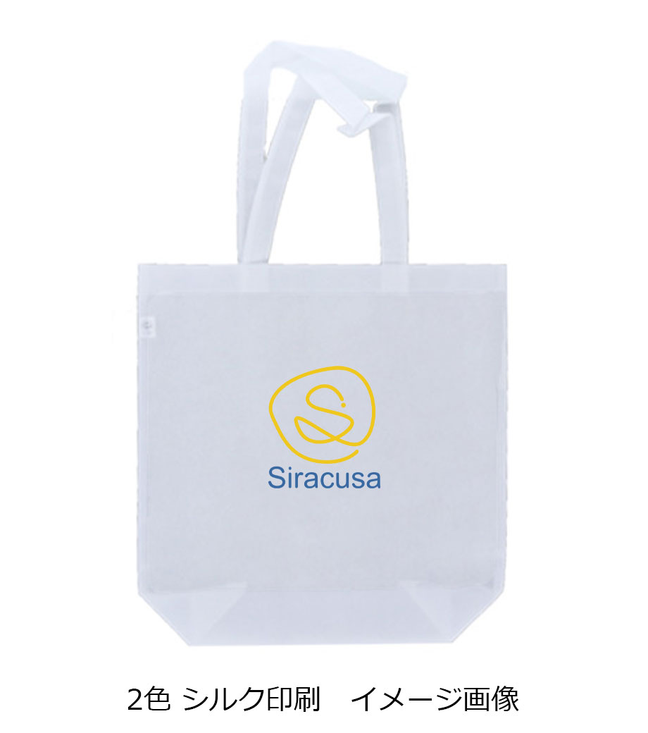 バッグの中央にシルク1色印刷とフルカラー転写印刷が可能です。印刷範囲が広くシンプルなデザインに名入れが映えます。アパレルのショップバッグやイベントのノベルティとしてご活用ください。