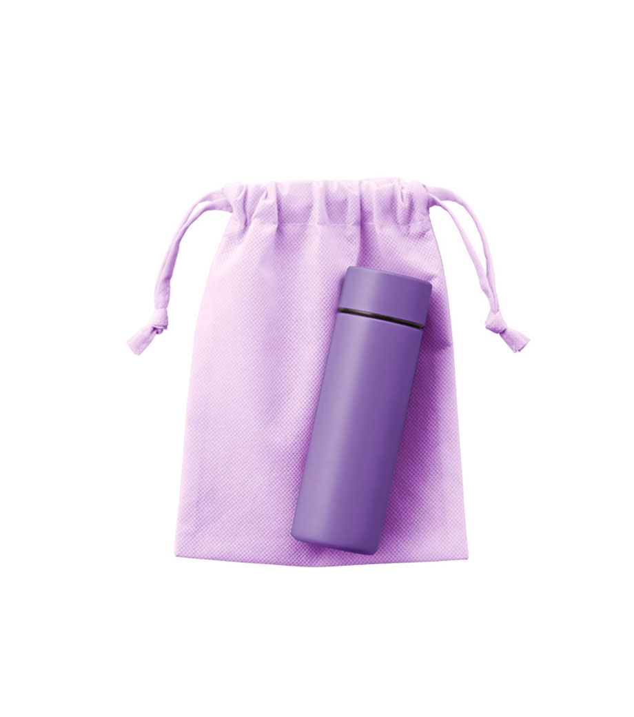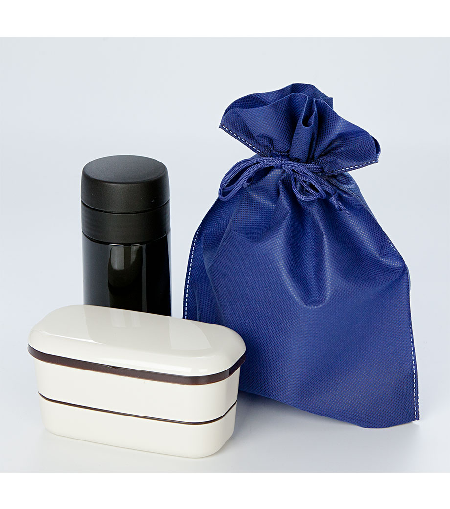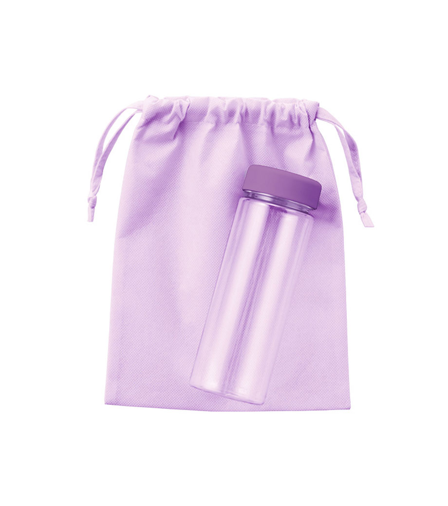 シンプルでフラットな巾着。小さめのマグや200ml未満のミニボトル、スマホのバッテリーが入るくらいのサイズです。軽くて丈夫、気兼ねなく扱える不織布素材は日常使いに最適。バッグの中の小物整理に役立ちます。