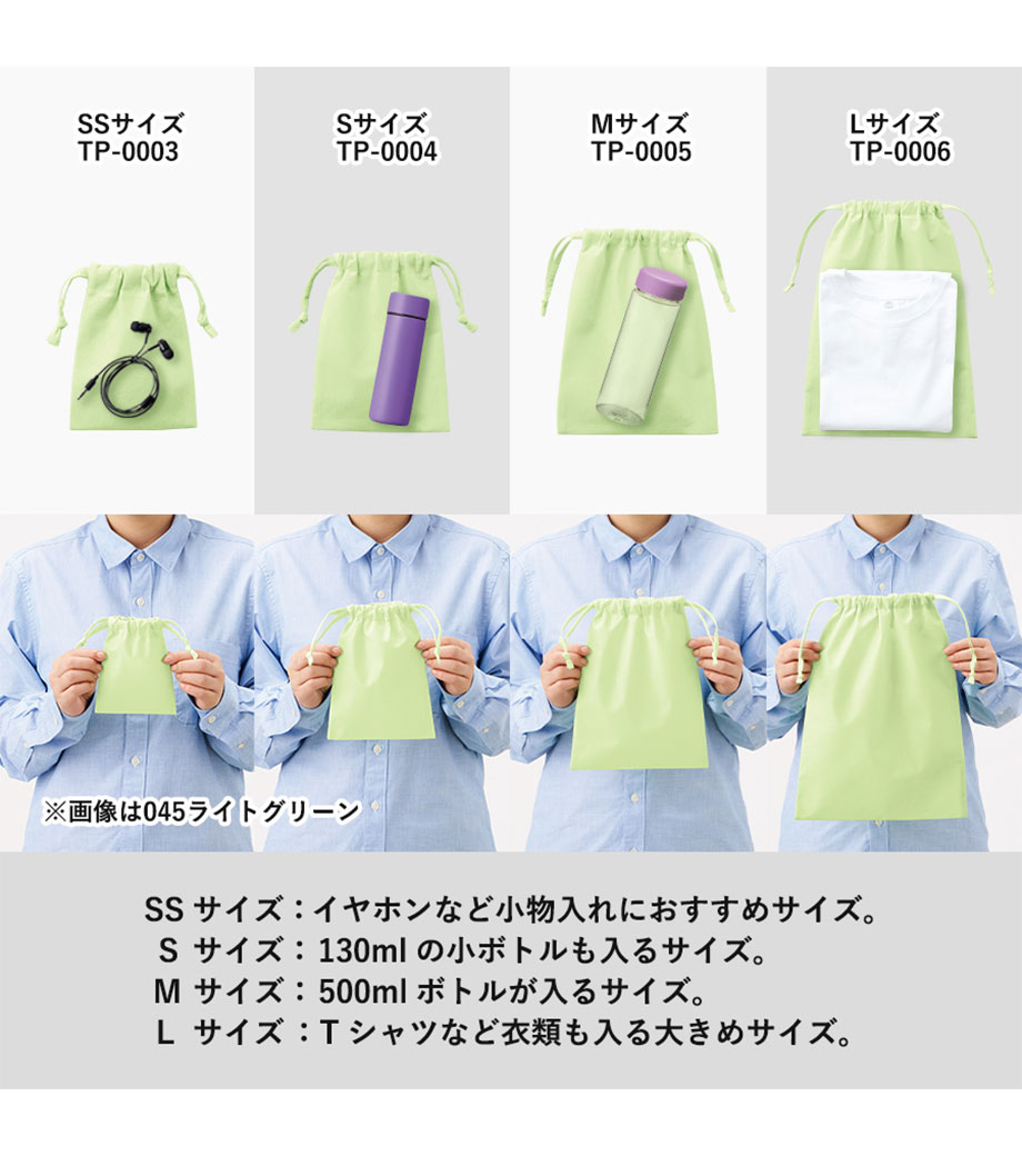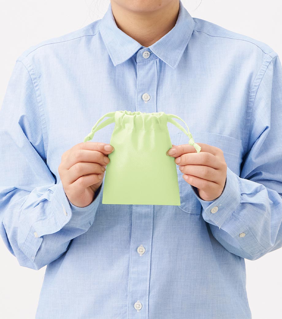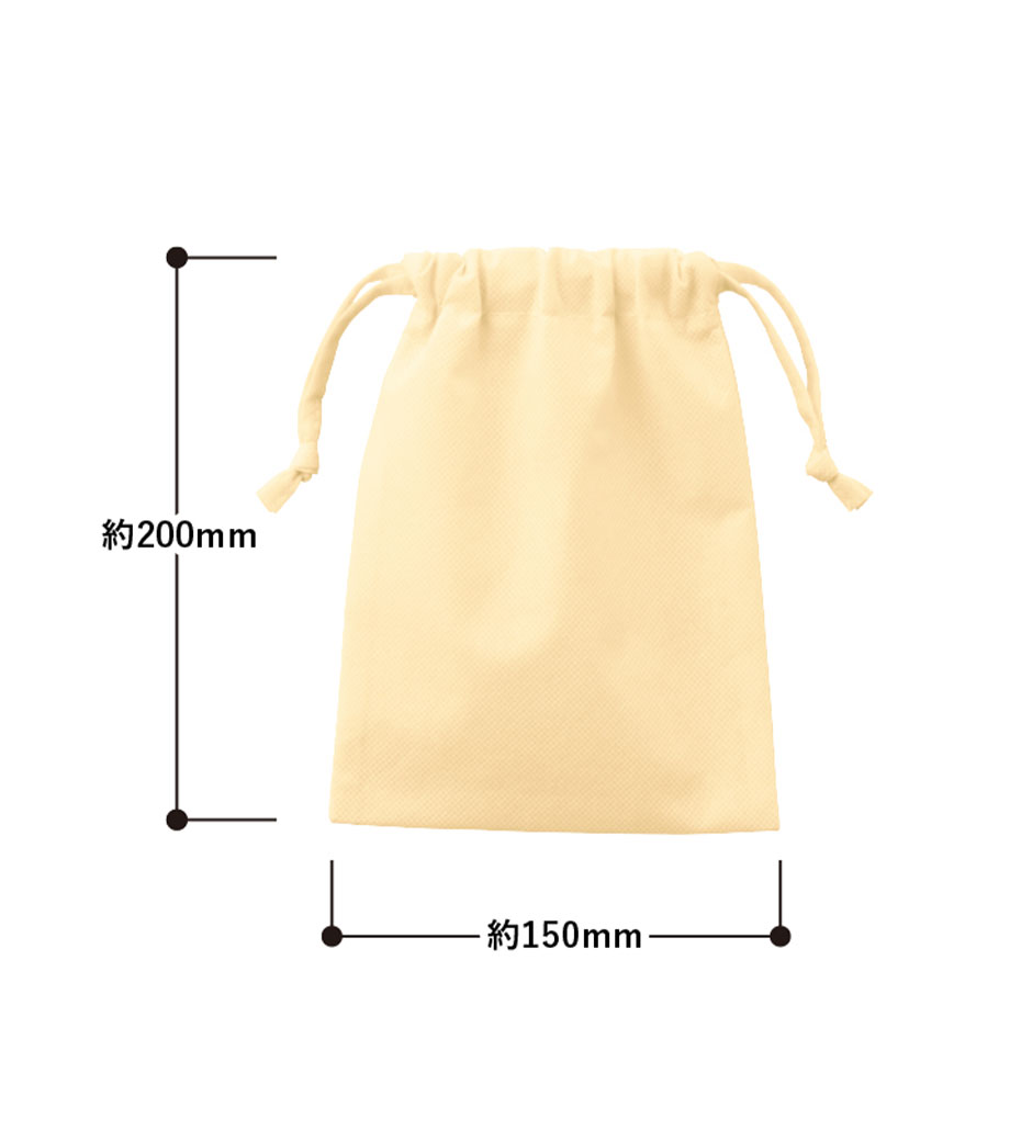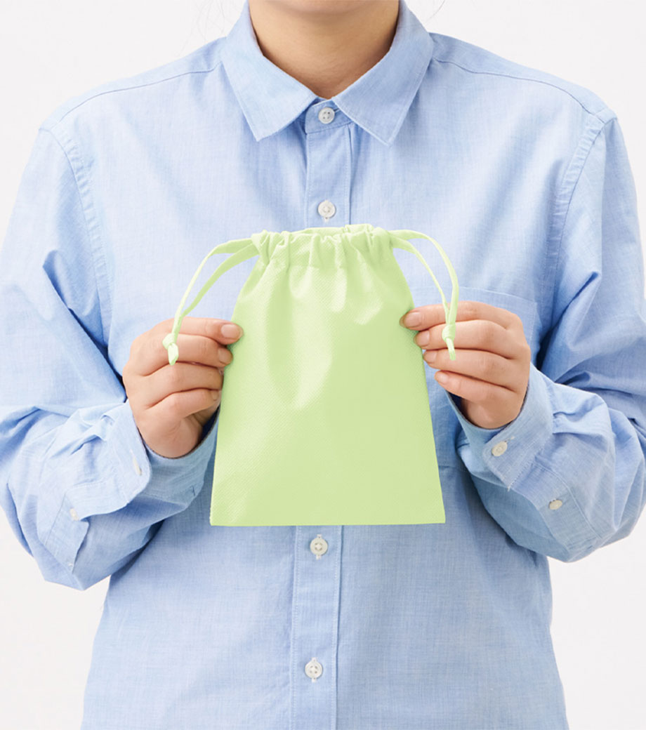 フラットな形状のシンプルな巾着。500mlのボトルや文庫・単行本が入るサイズです。バッグの中の整理や、ちょっとした物の持ち運び、あると便利なサイズ感でいざ何かを入れるときに役立ちます。軽くて丈夫な不織布素材なので、気兼ねなく使えるのも魅力的です。