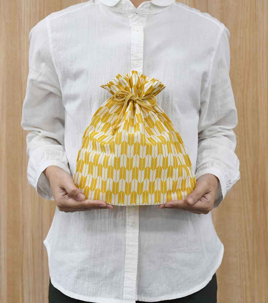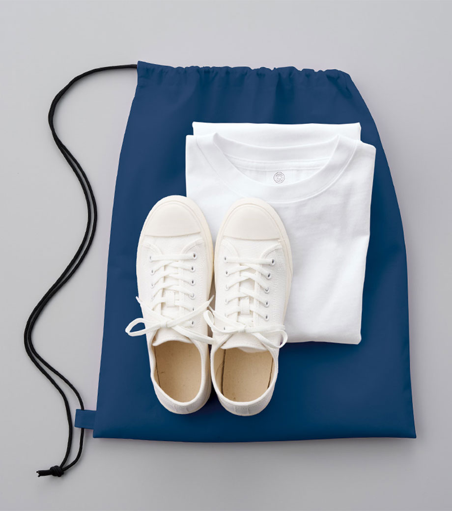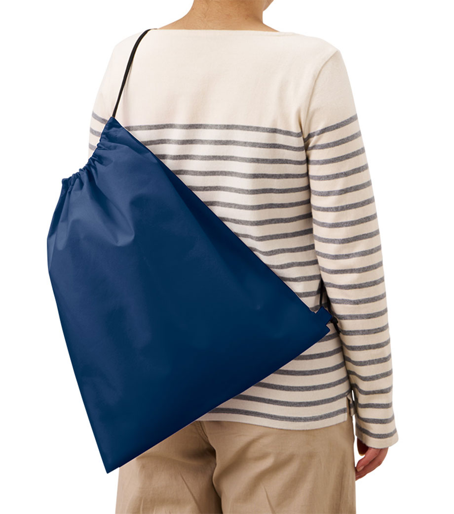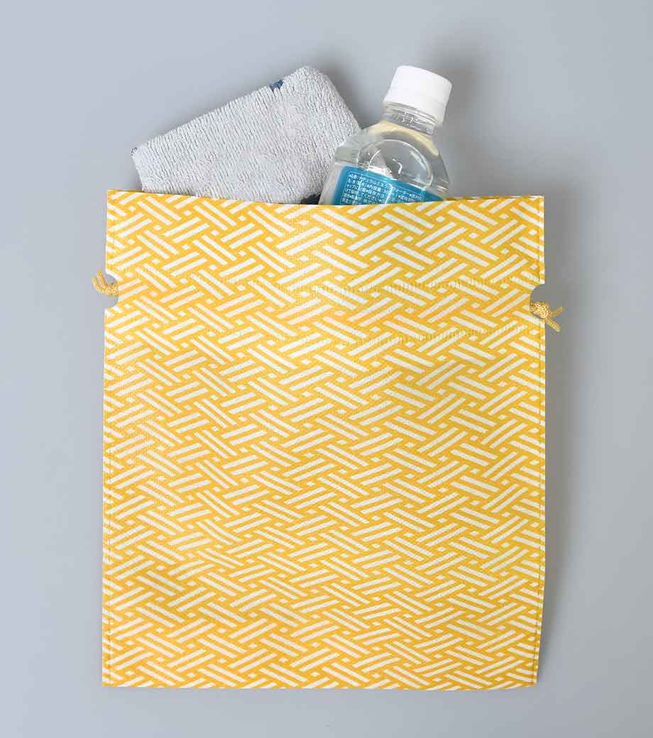 フラットな形状のシンプルな巾着。500mlのボトルや文庫・単行本が入るサイズです。バッグの中の整理や、ちょっとした物の持ち運び、あると便利なサイズ感でいざ何かを入れるときに役立ちます。軽くて丈夫な不織布素材なので、気兼ねなく使えるのも魅力的です。