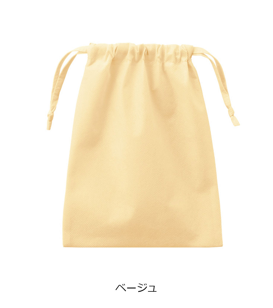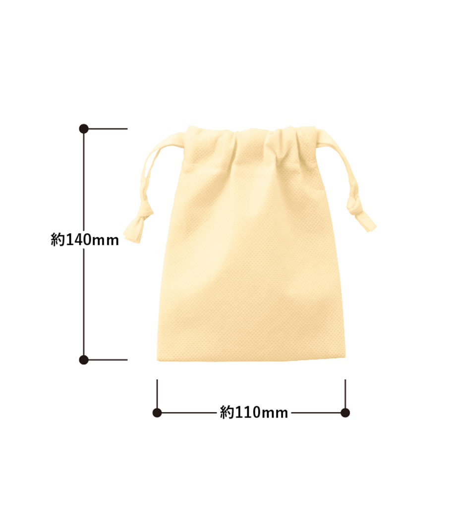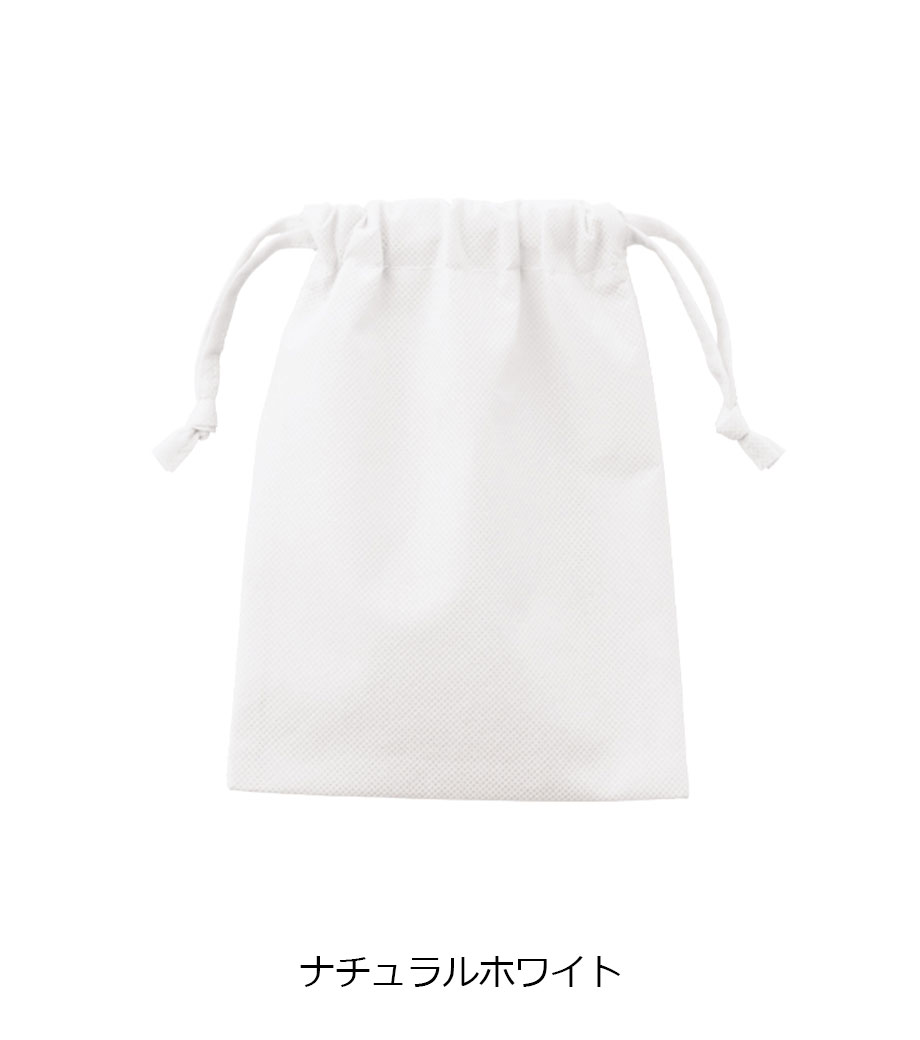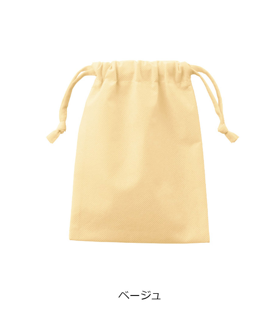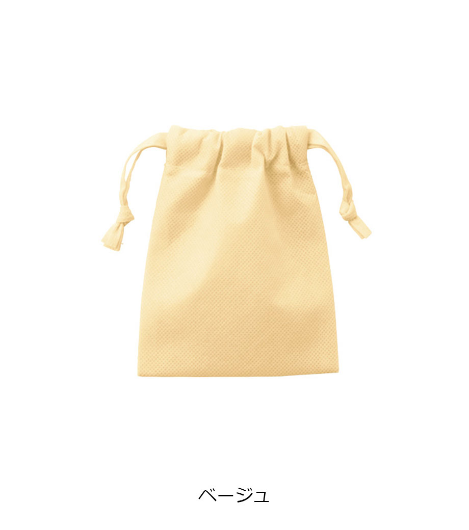 シンプルでフラットな形状の巾着です。家の鍵やイヤホンなどの小物入れにちょうど良いサイズ。旅館・ホテル・エステ等での小物入れ、イベントのおまけを入れる袋として活用してみてはいかがでしょう。軽くて丈夫な不織布素材は日常的に気兼ねなく使えます。好みに影響されない落ち着いた色合いが、中に入れる物を引き立てます。