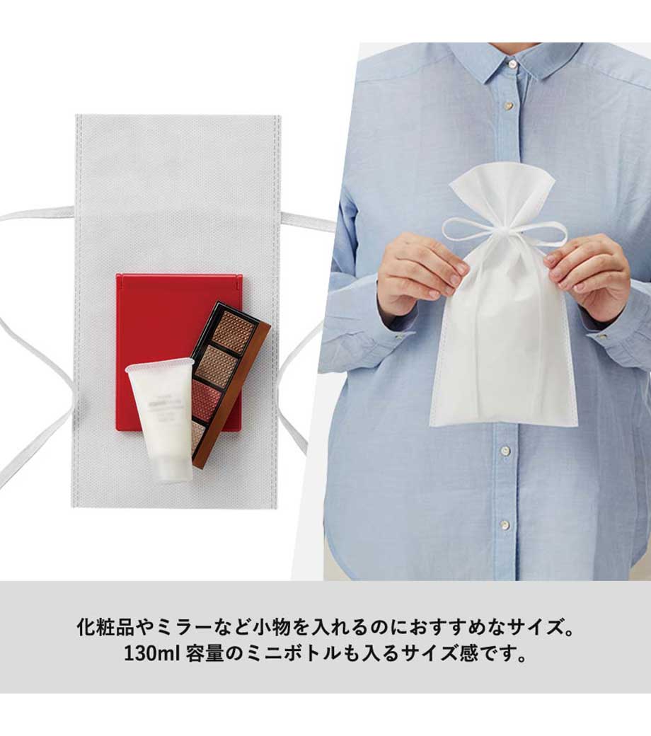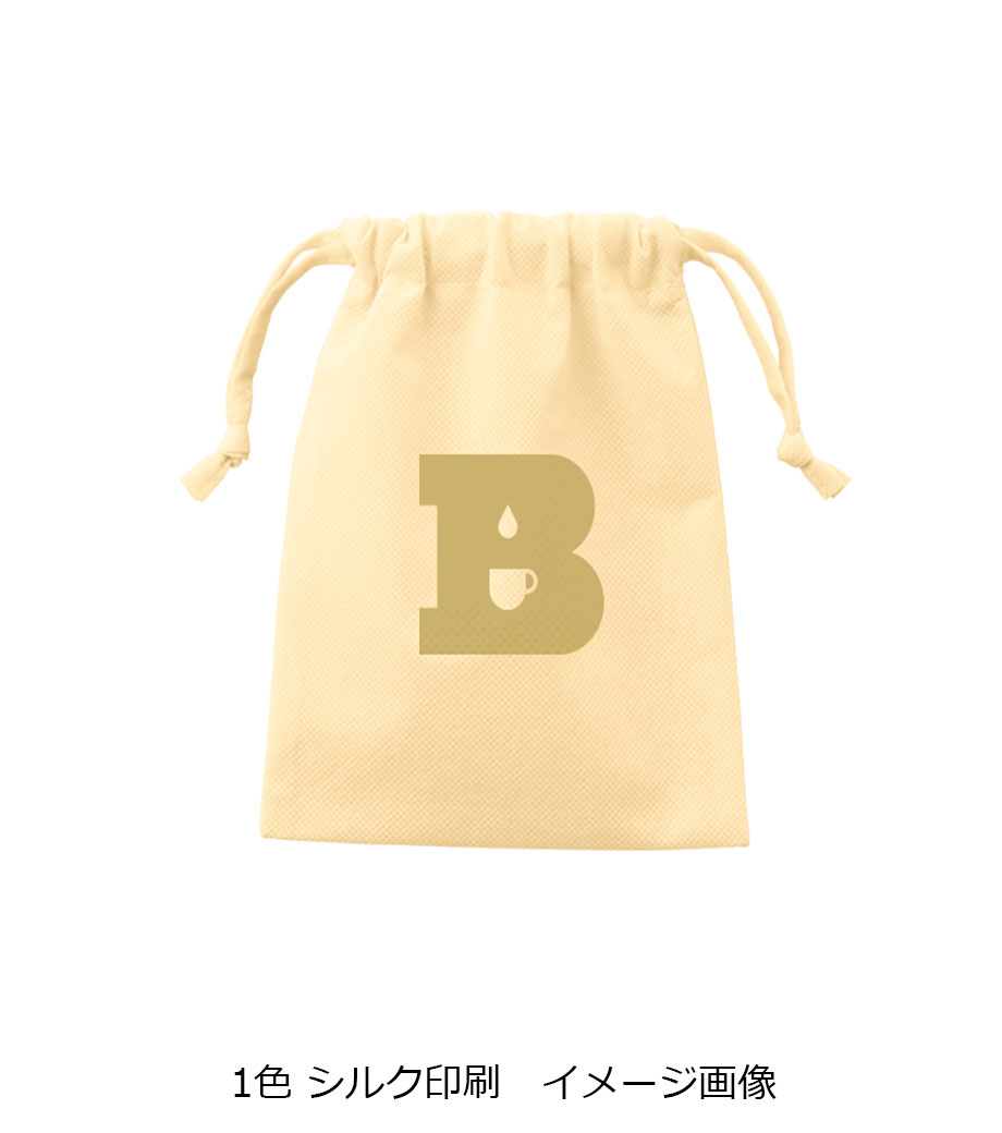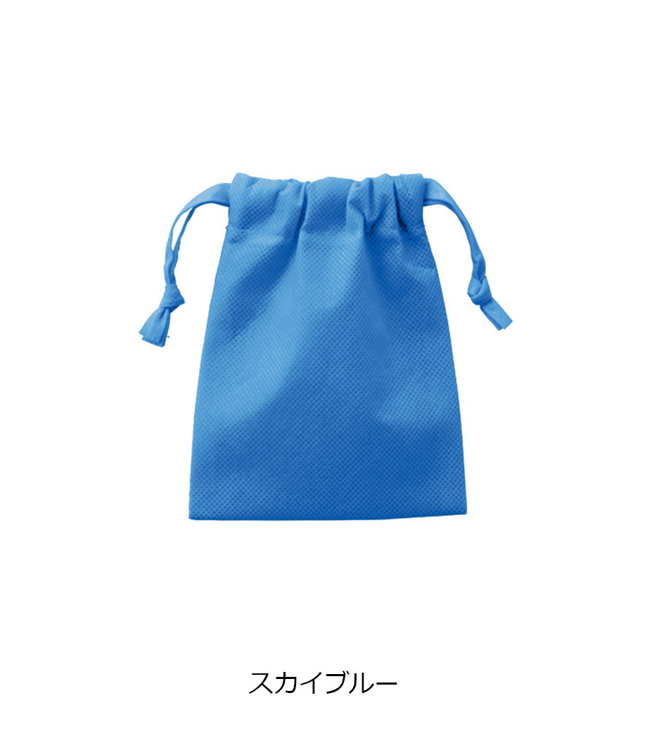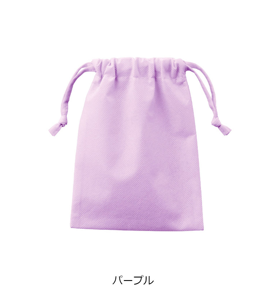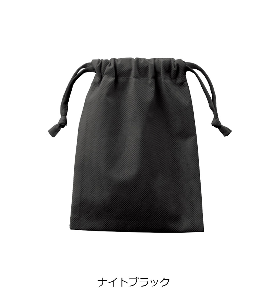 シンプルでフラットな形状の巾着です。家の鍵やイヤホンなどの小物入れにちょうど良いサイズ。旅館・ホテル・エステ等での小物入れ、イベントのおまけを入れる袋として活用してみてはいかがでしょう。軽くて丈夫な不織布素材は日常的に気兼ねなく使えます。好みに影響されない落ち着いた色合いが、中に入れる物を引き立てます。