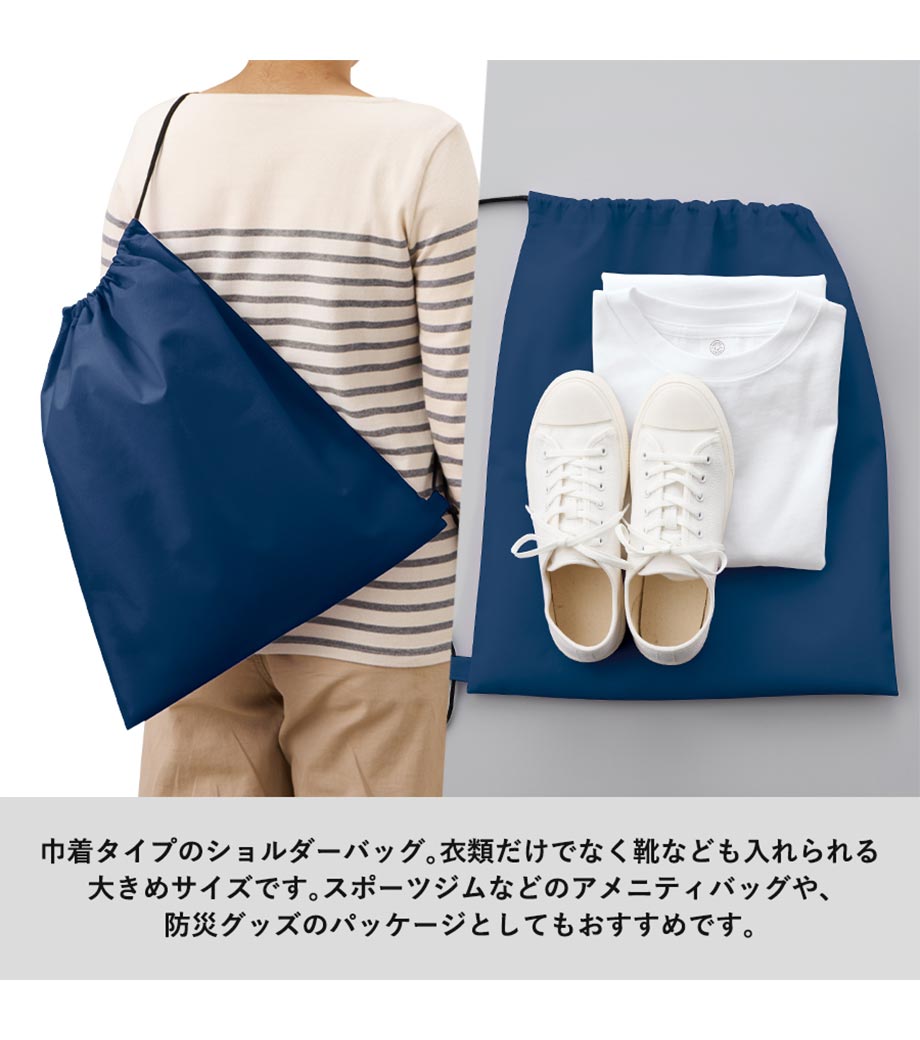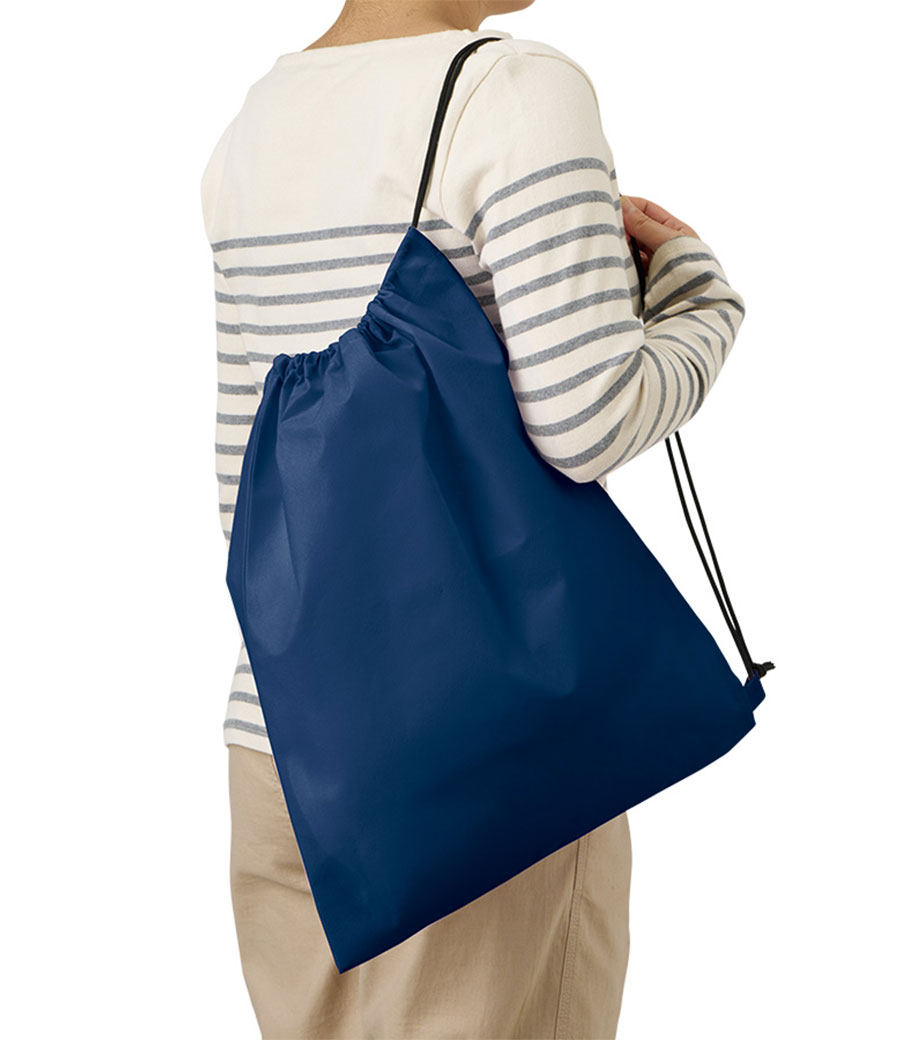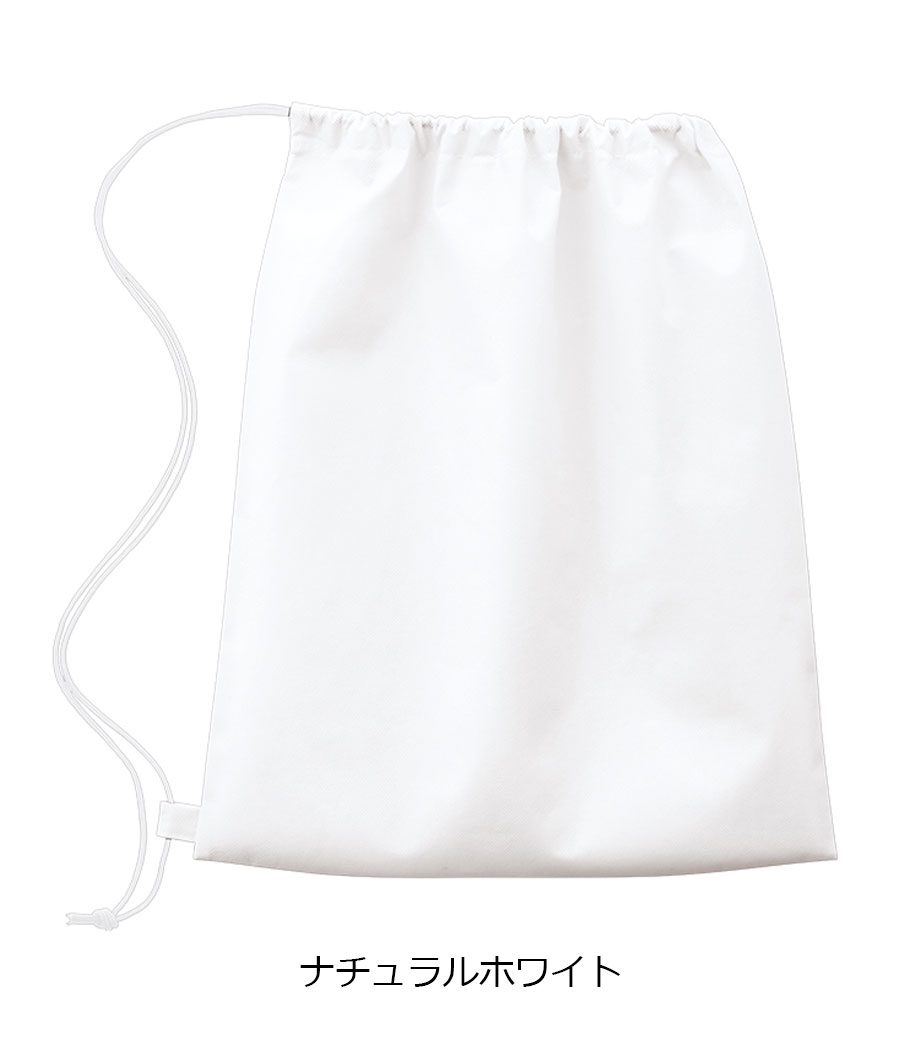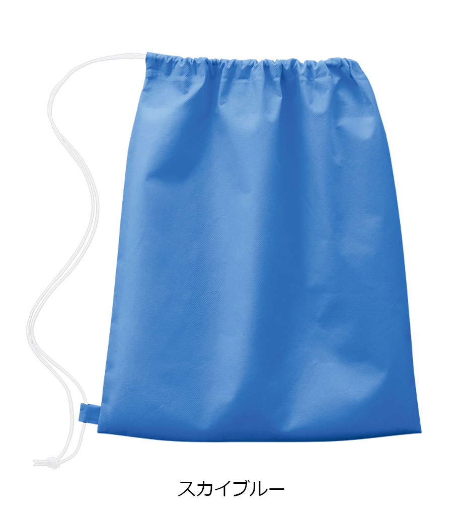 片ひもタイプの不織布ナップサック。スニーカーやTシャツ、スポーツタオルを一緒に入れられる大きめサイズです。肩掛けで持ち運べるので荷物を沢山入れても安心。スポーツやジム用の着替え入れにぴったりです。防災グッズを入れれば避難用バッグにもなります。